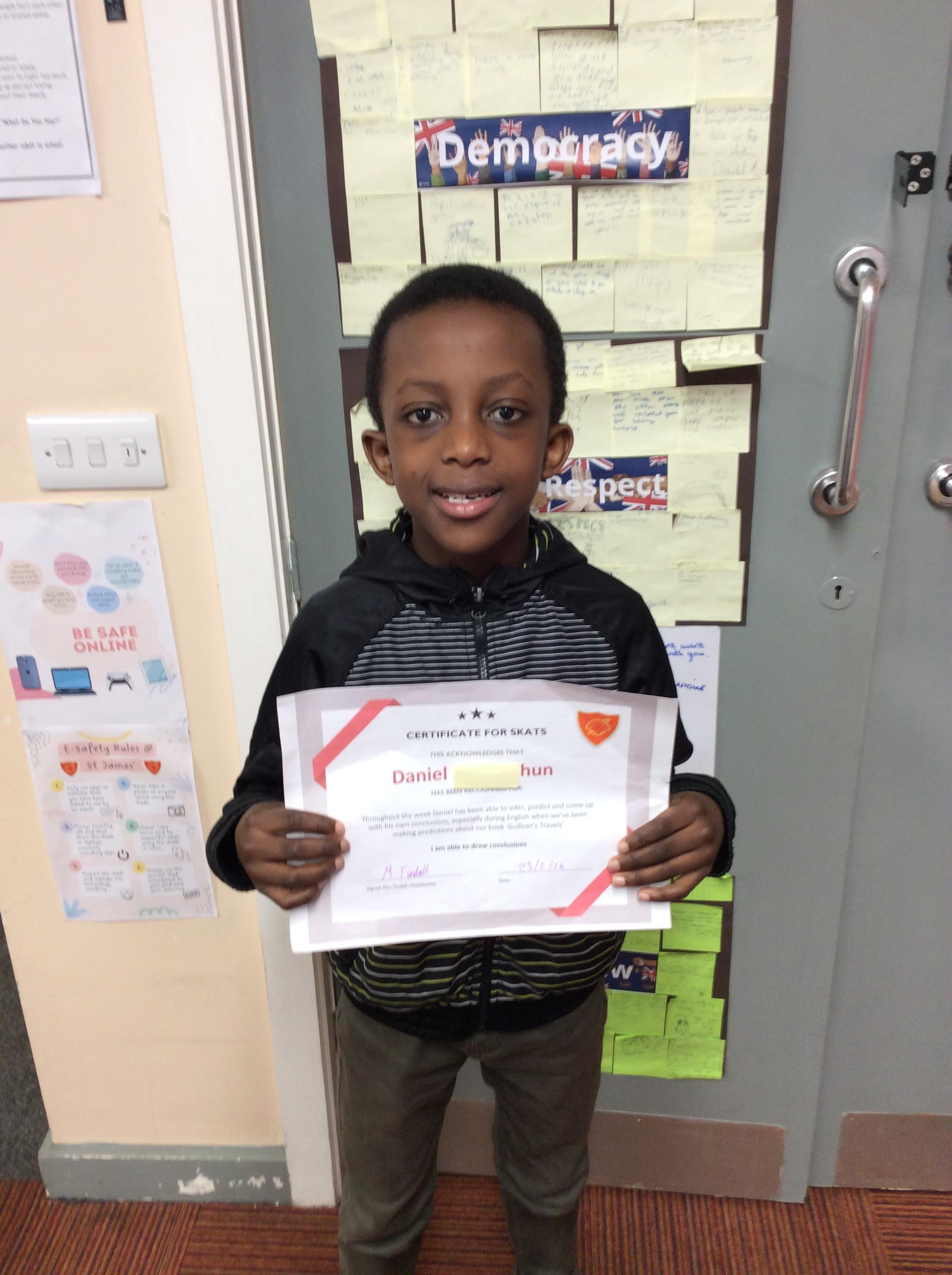 SKAT award has been awarded to Daniel, he has been recognised for being able to draw conclusions. Well Done Daniel.