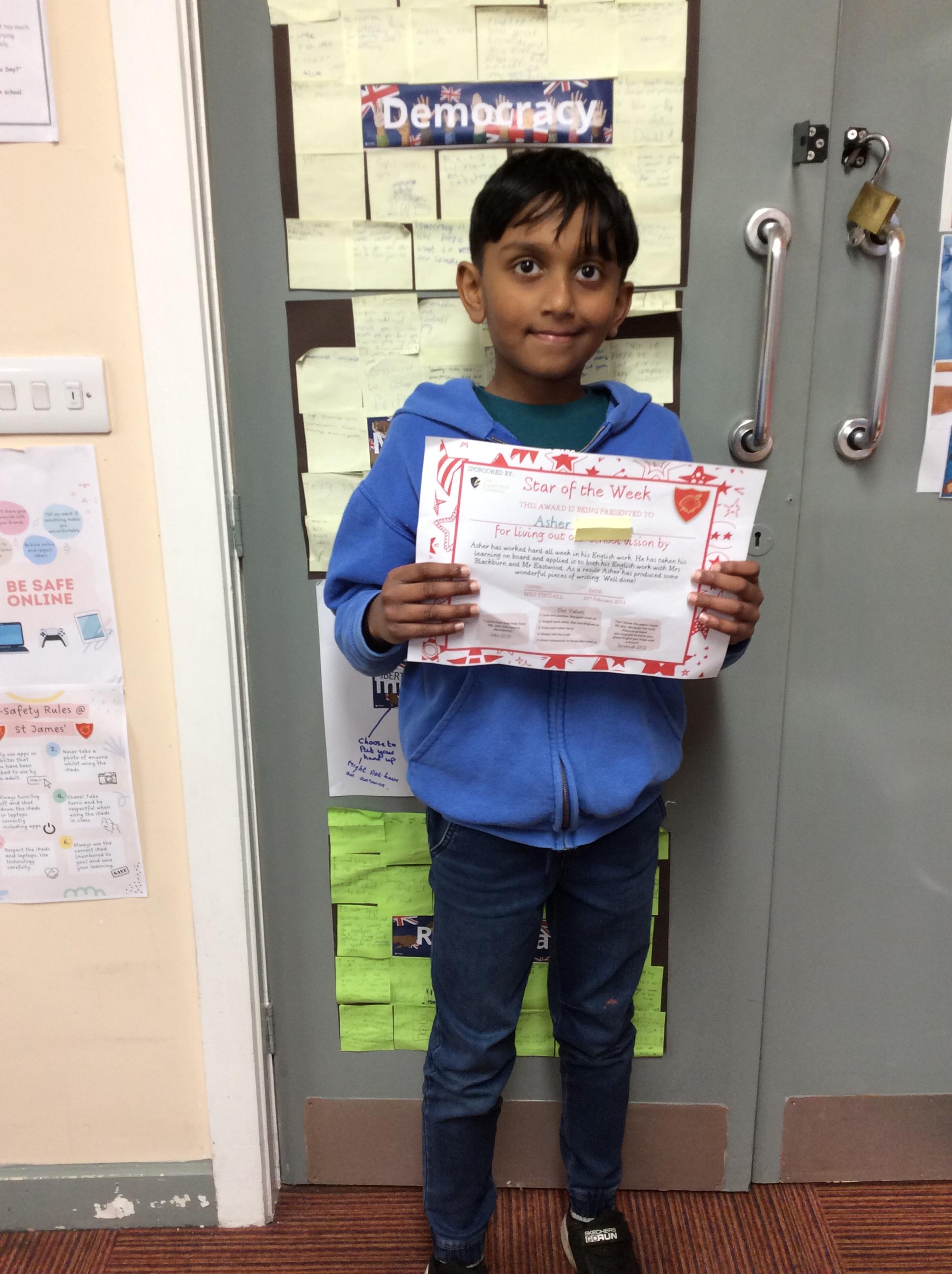 Well done to Asher our Star of the week this week. Asher has worked hard all this week especially in his English work and this has been noticed by both Mrs Blackburn and Mr Eastwood. Well done Asher!