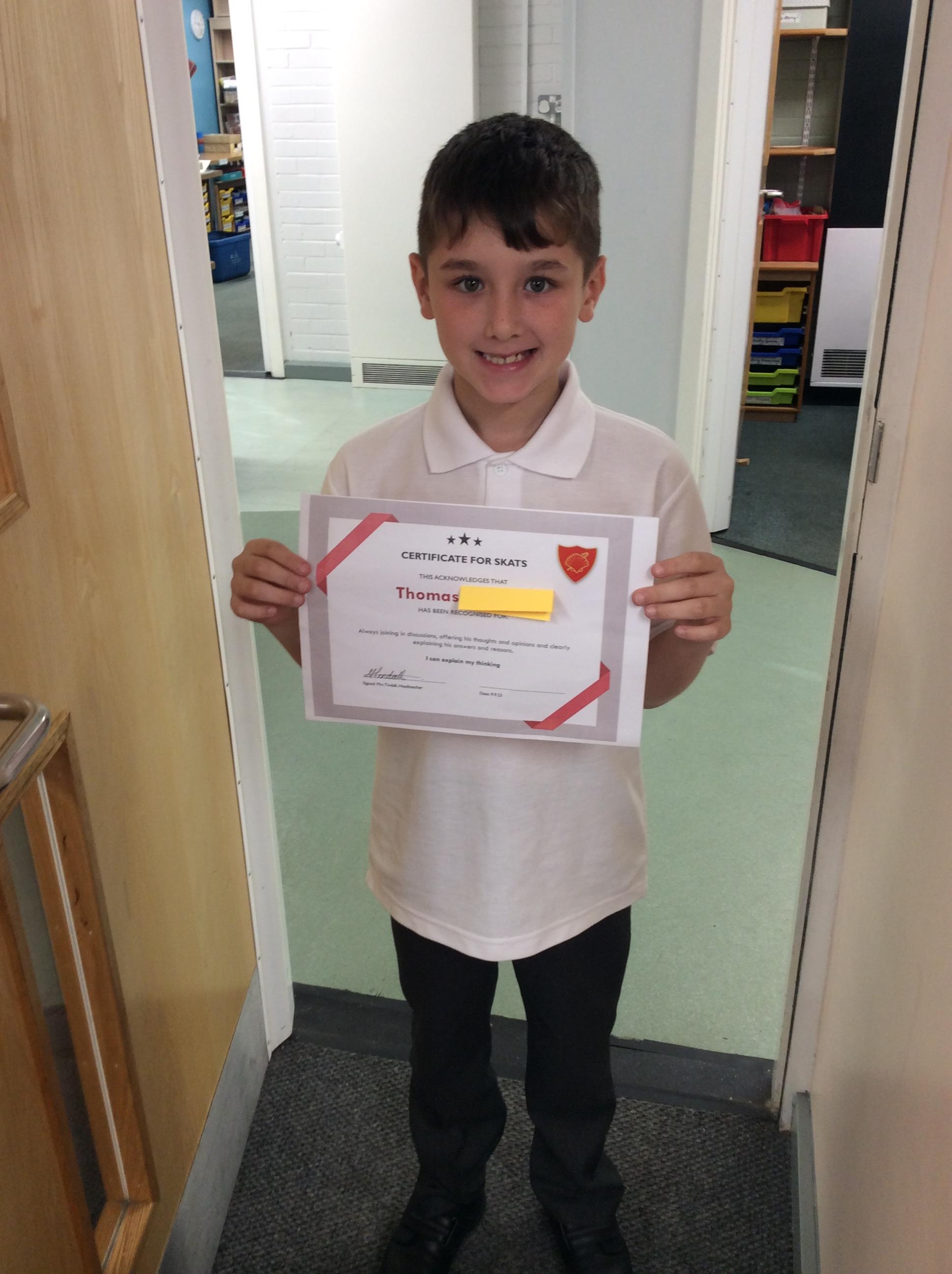 Thomas has won our certificate for SKATS, Thomas has shown how he can explain his thinking by always joining in discussions, offering his thoughts and opinions and clearly explaining his answers and reasons. Well done Thomas!