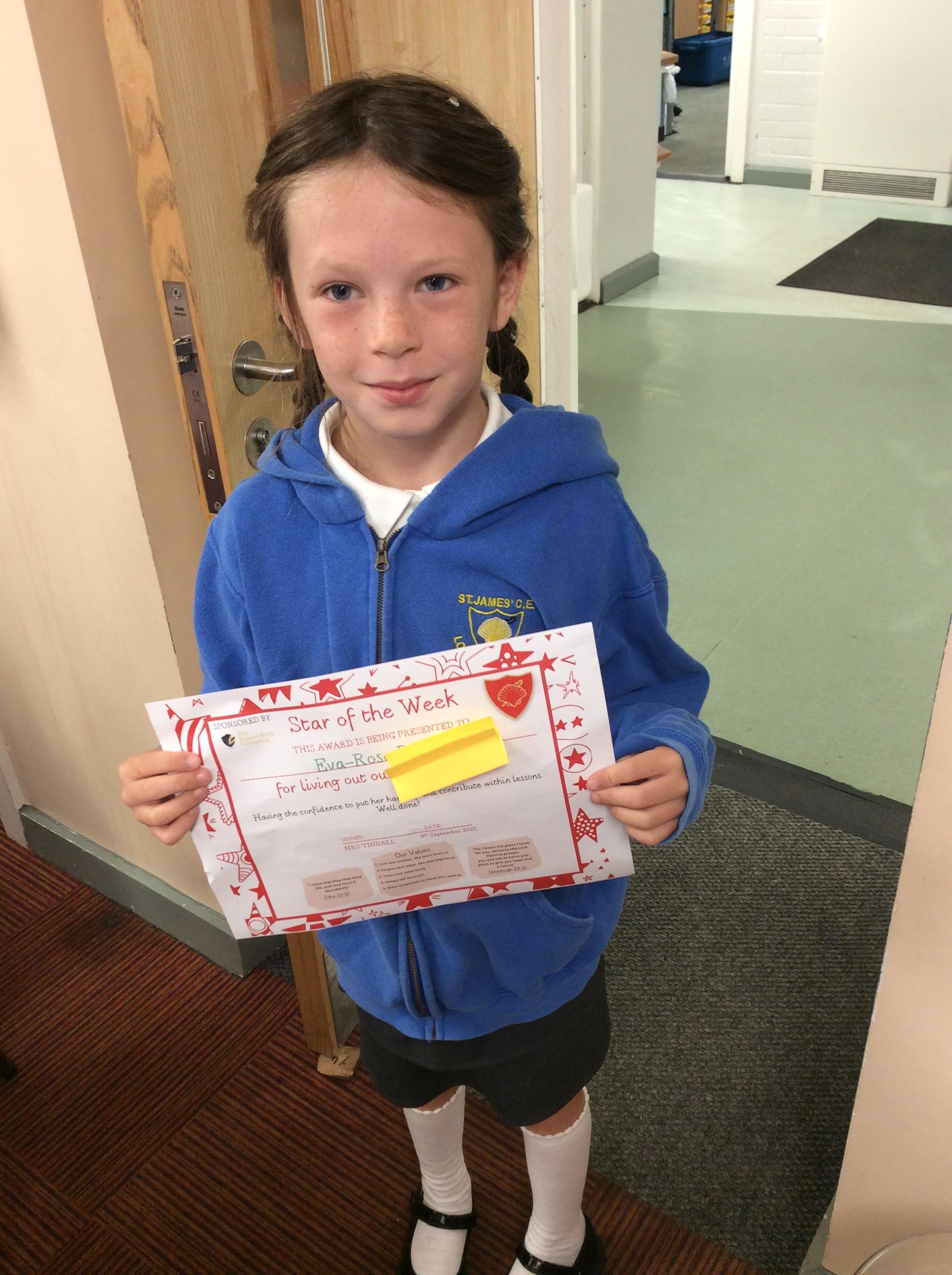 Eva-rose is our star of the week for making an amazing start to year 4. Eva has found the confidence to put her hand up and contribute within lessons. Well done Eva!