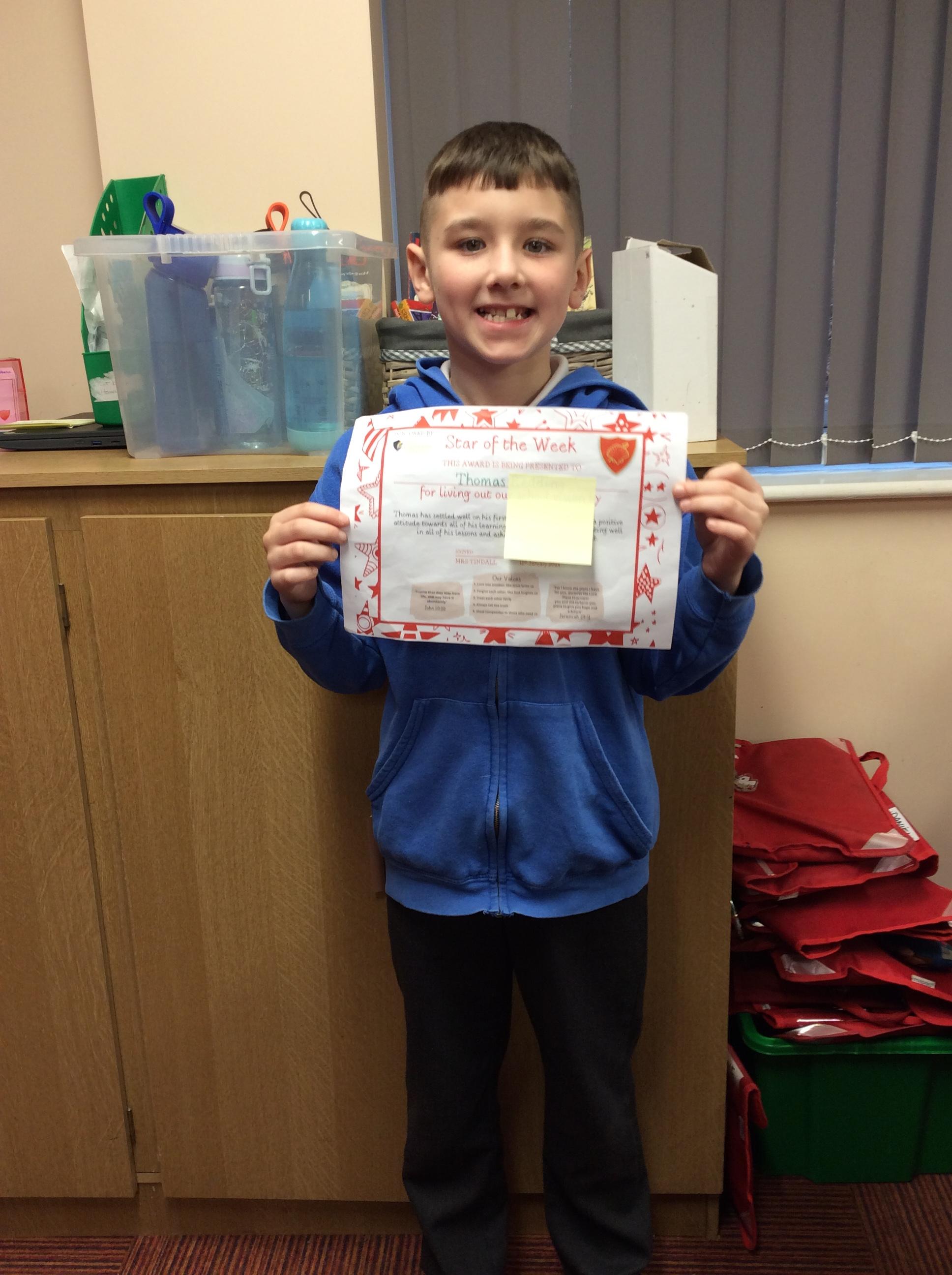 Our Star of the week this week is Thomas. Thomas has settled well on his first week back. He has shown a positive attitude towards all of his learning by trying his best, contributing well in all of his lessons and asking for help when he needs it.