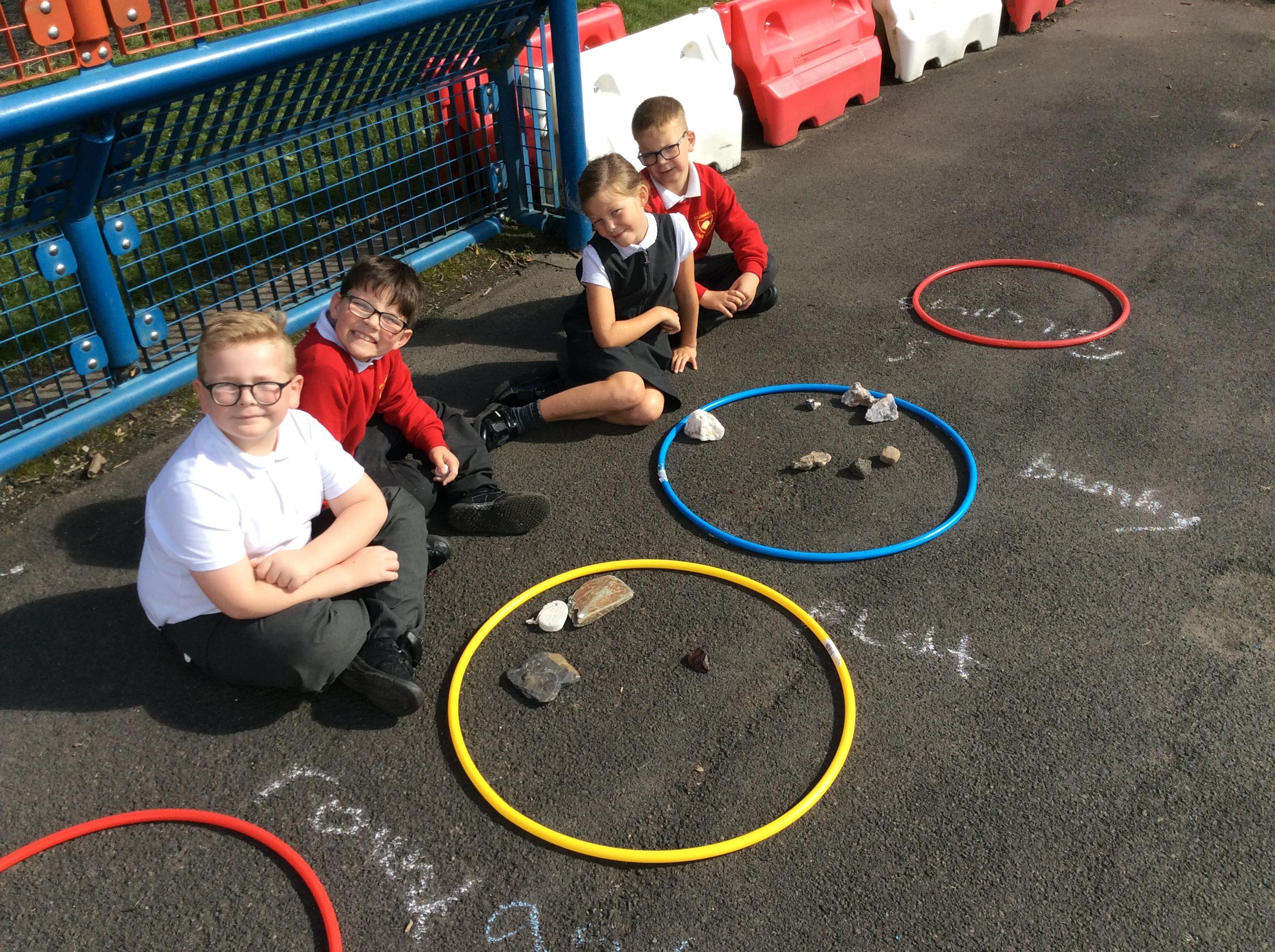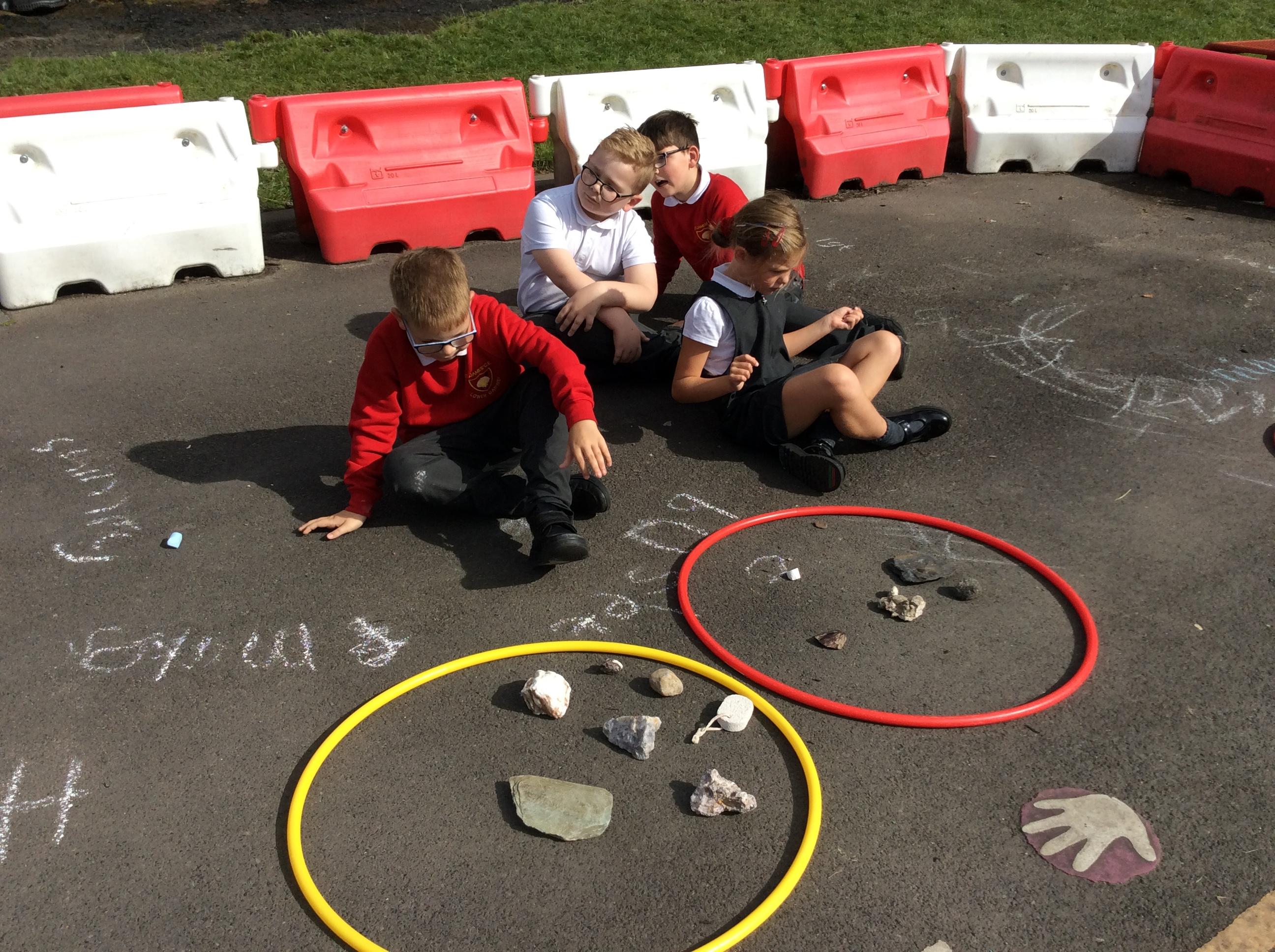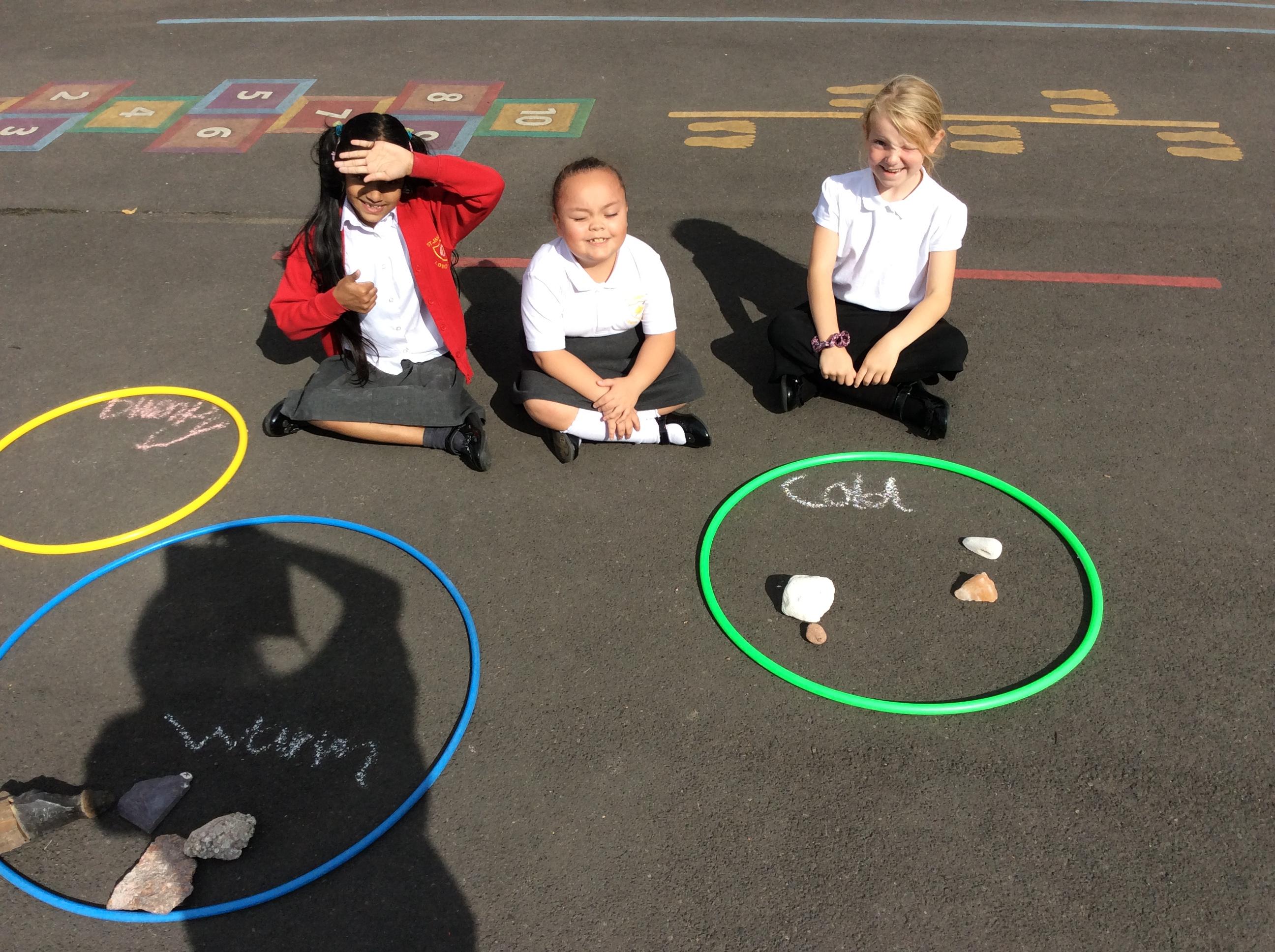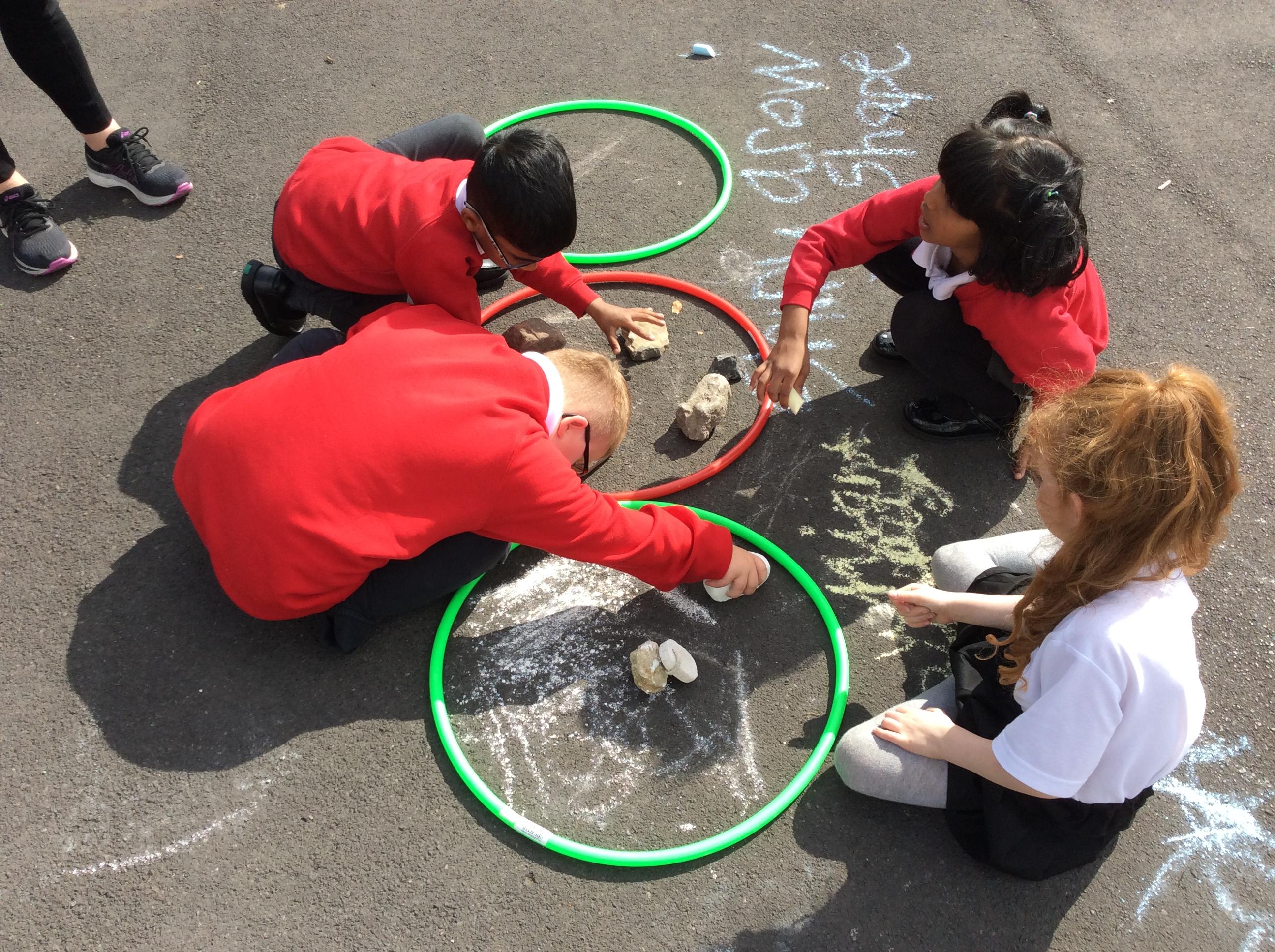 Year 3 became geologists in science when they came up with their own ways to group rocks. We took our learning outside and used chalk and hoops to make the groups. This was greatly enjoyed by all!