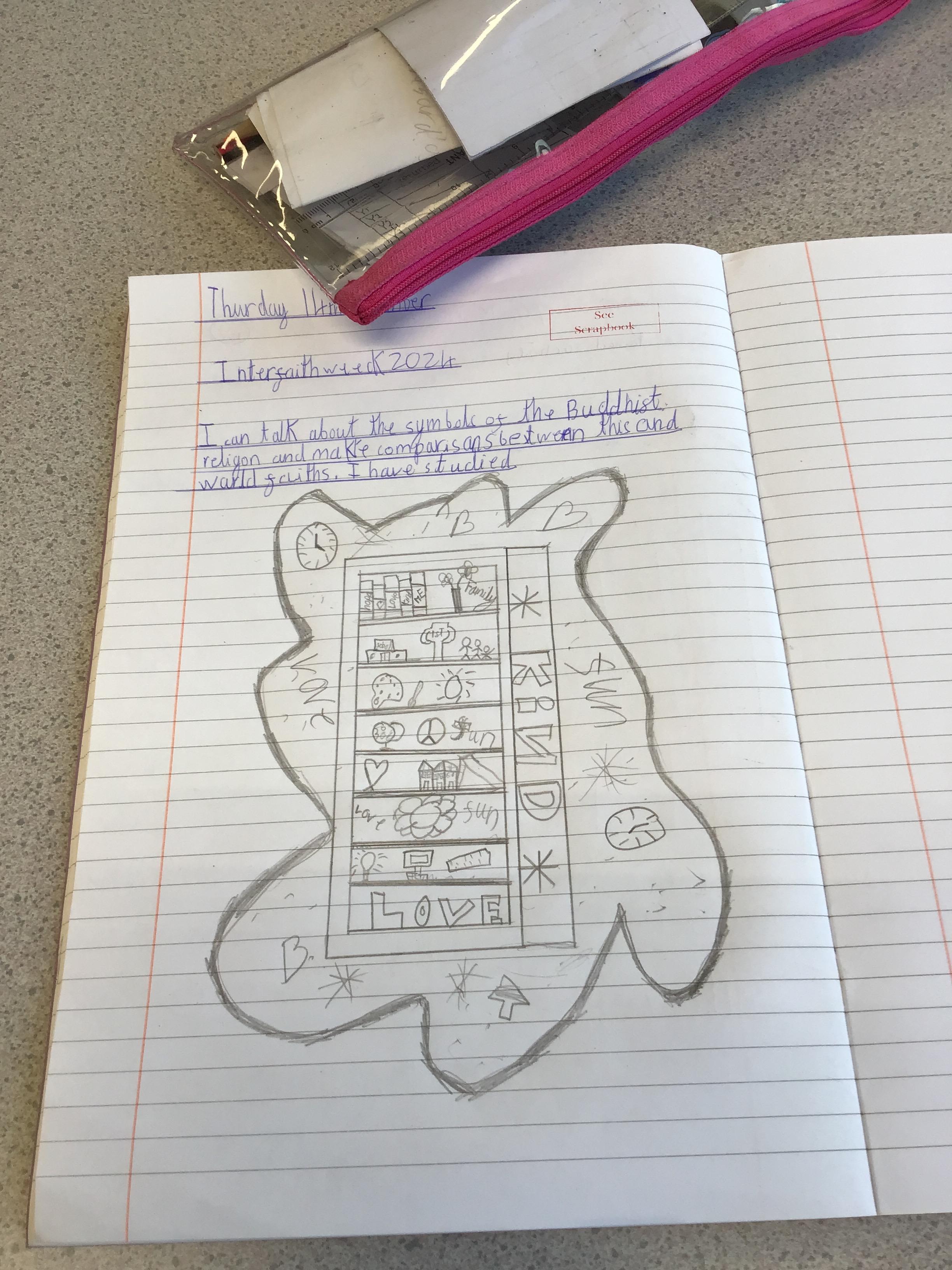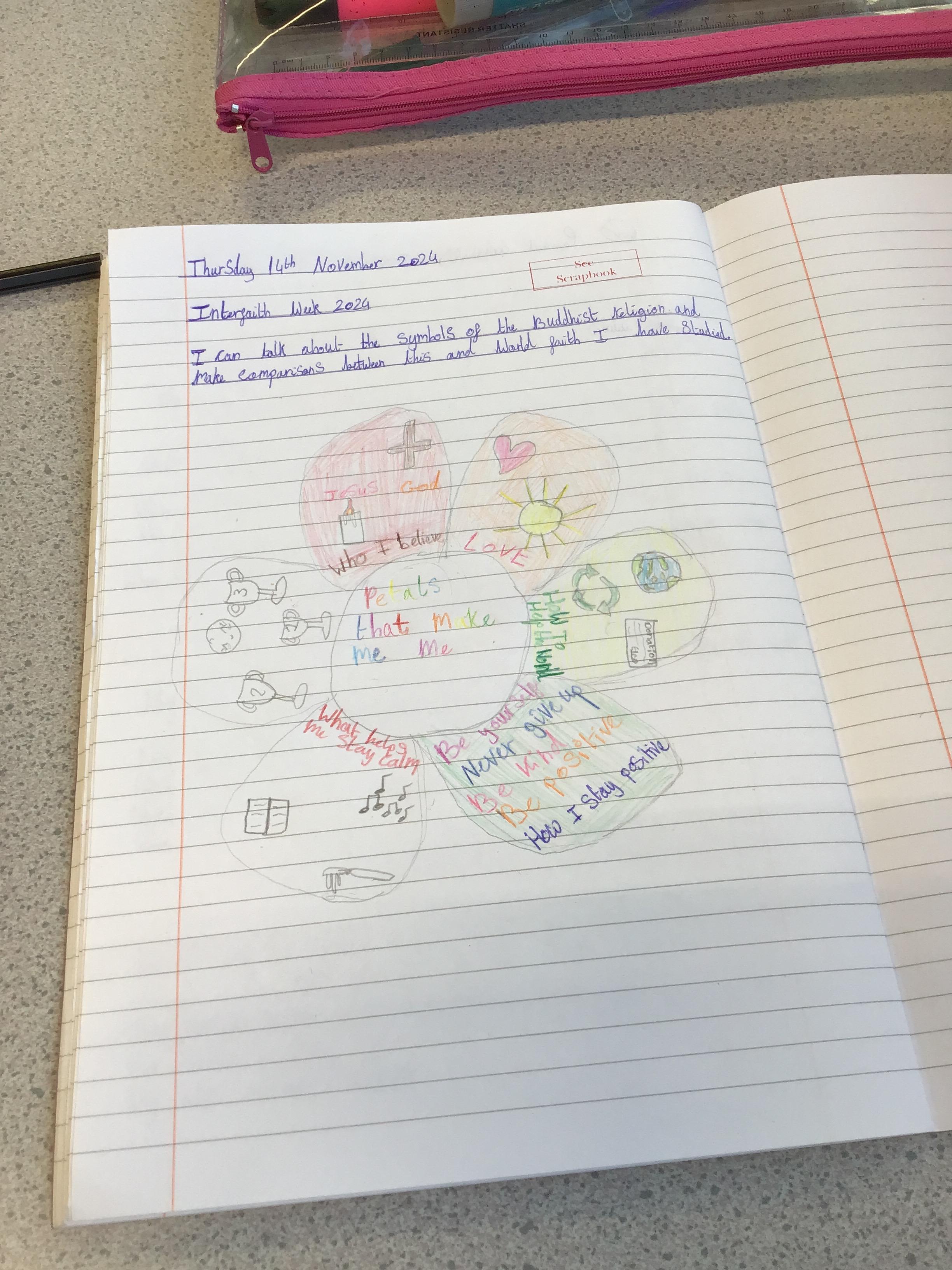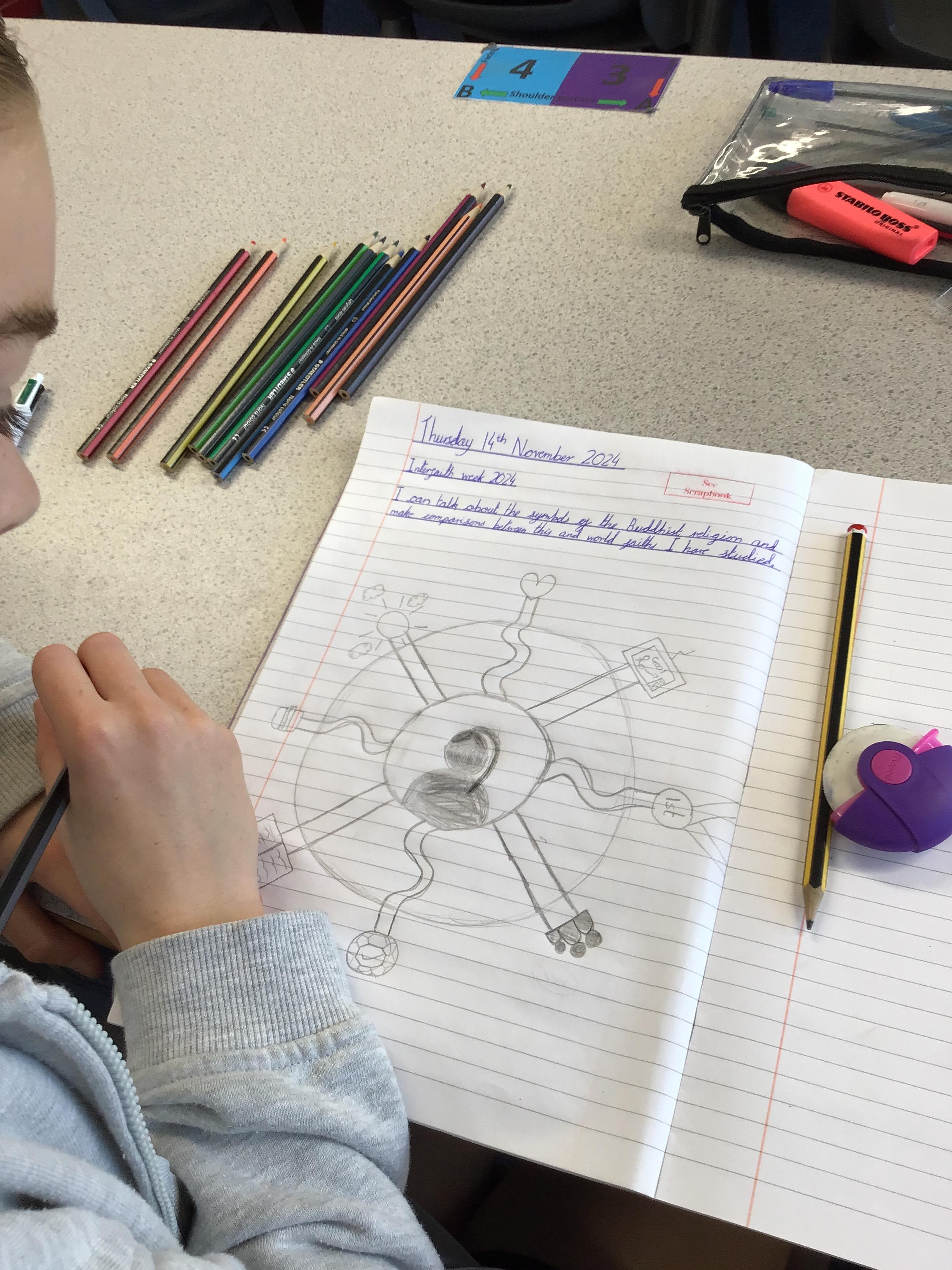 In RE, children celebrated Interfaith week by comparing the symbols of the Buddhist religion with other faiths. They produced some lovely work and could link this with other faiths they have studied in the past.
