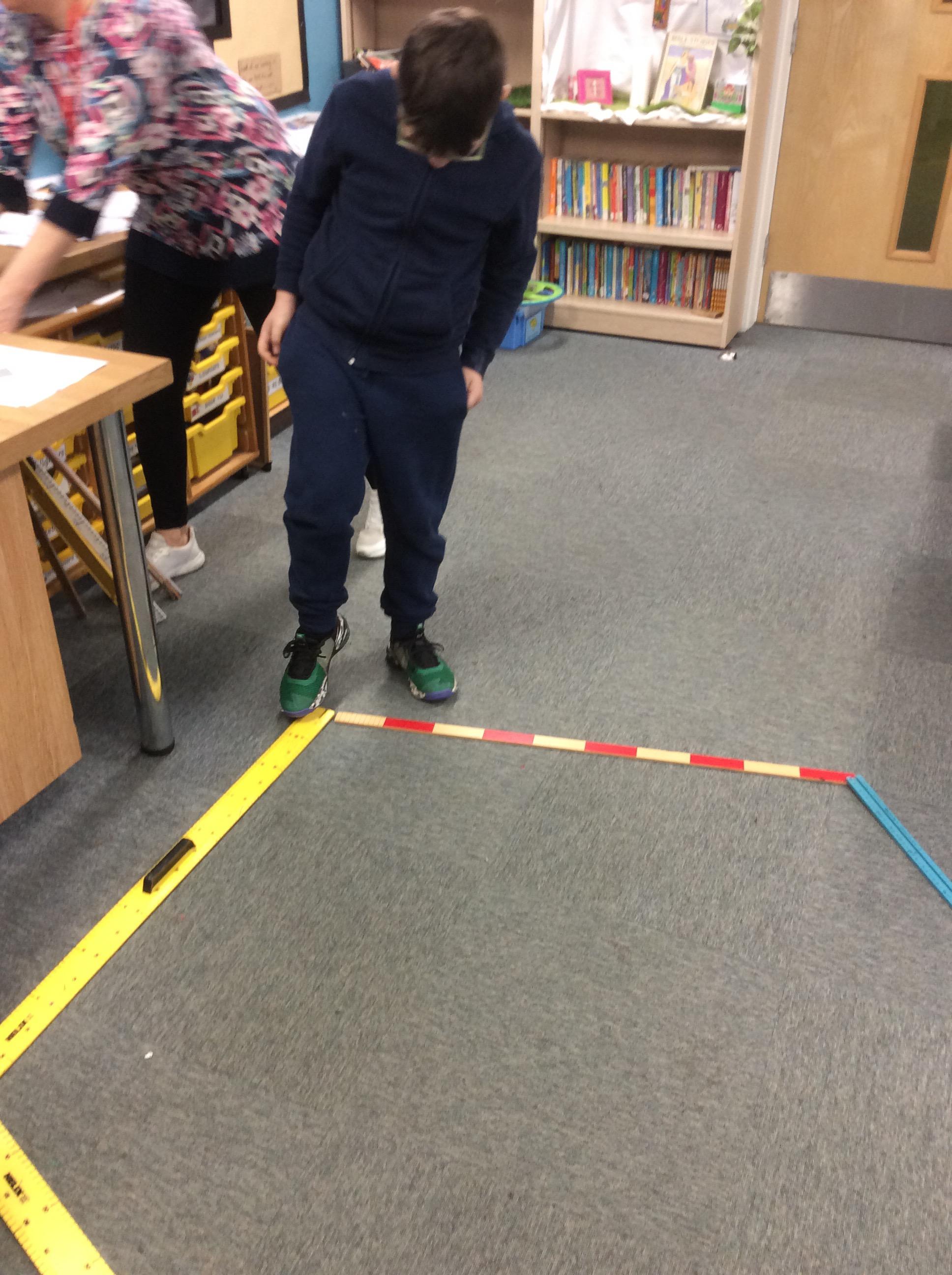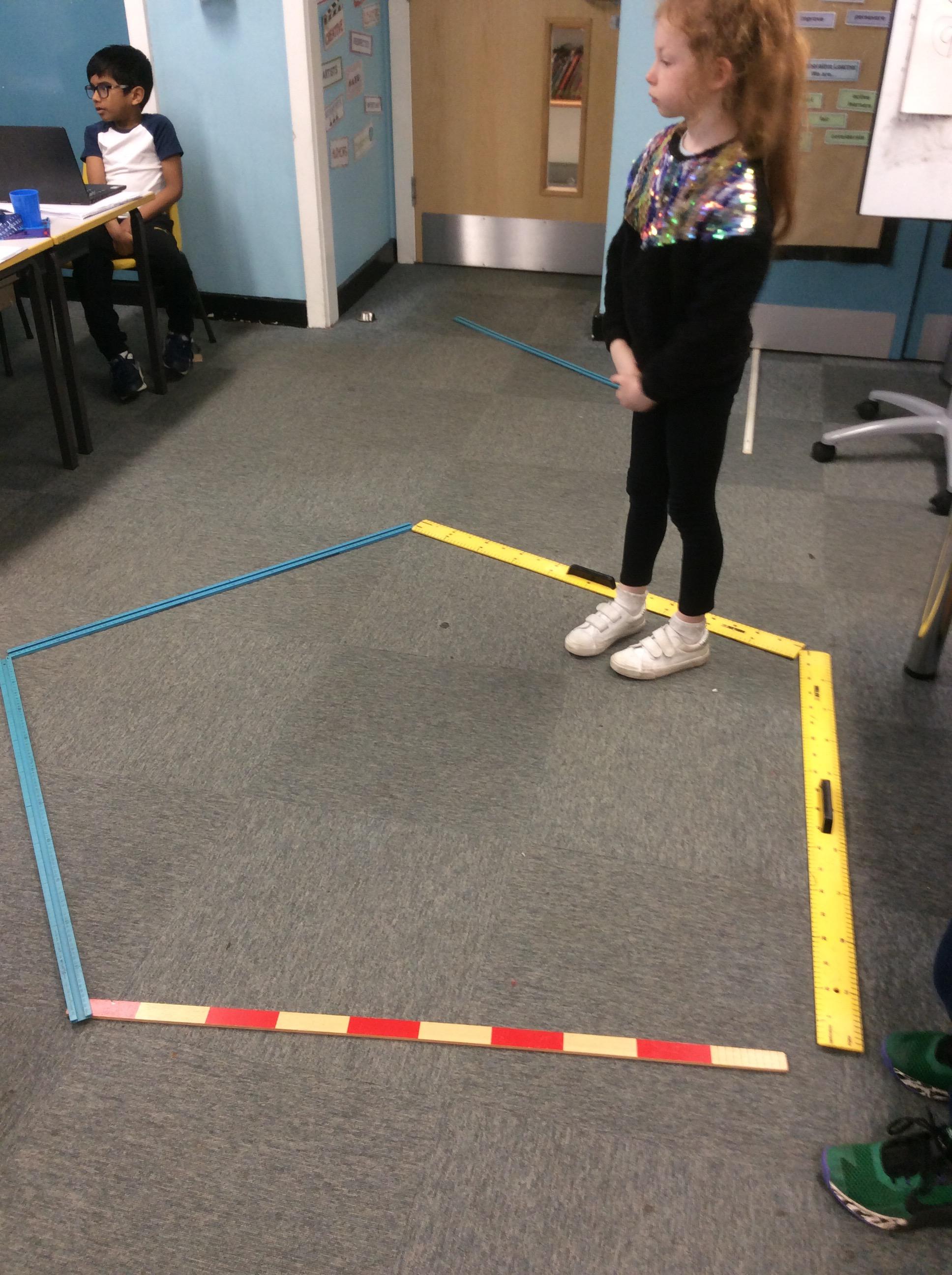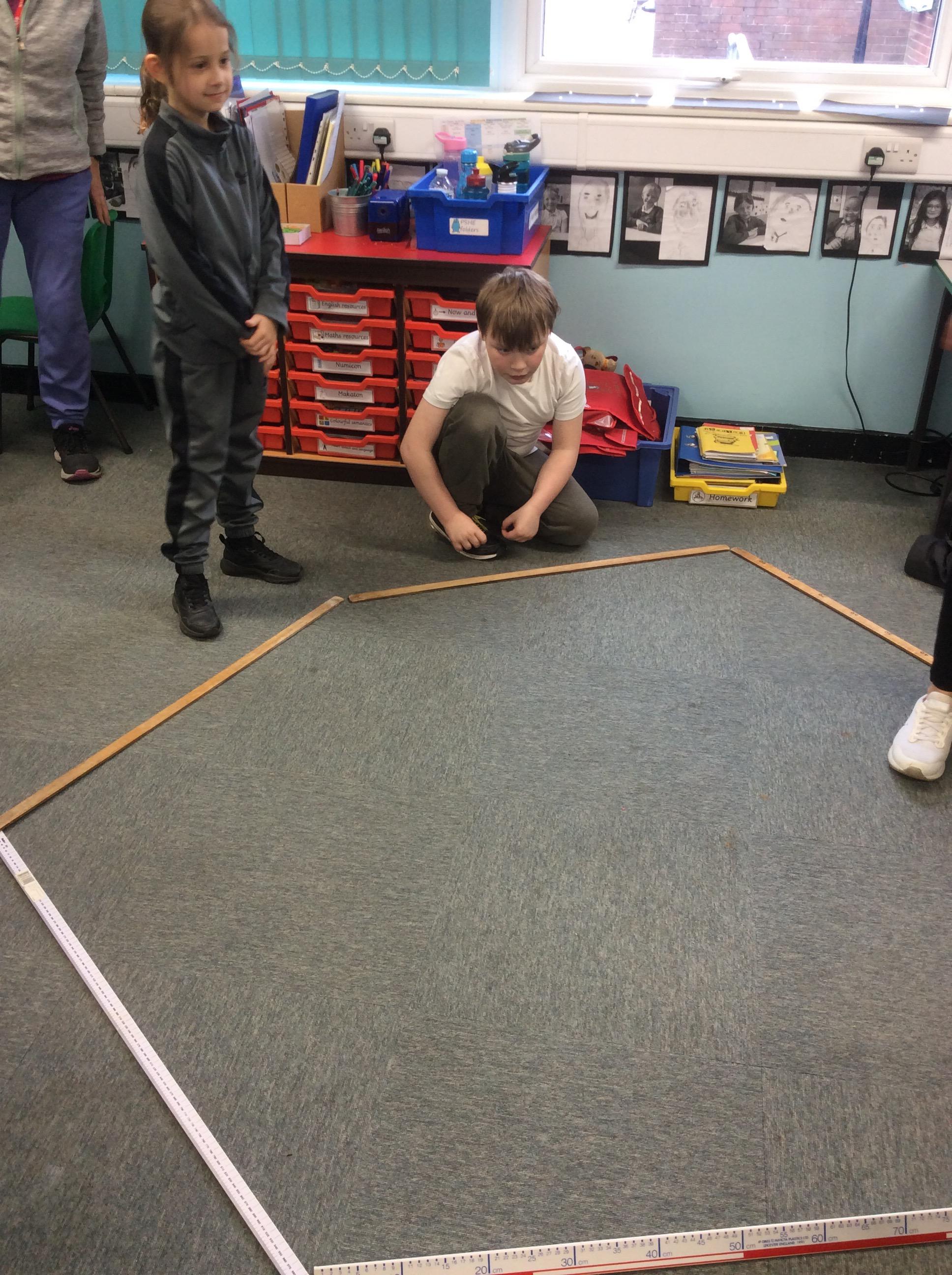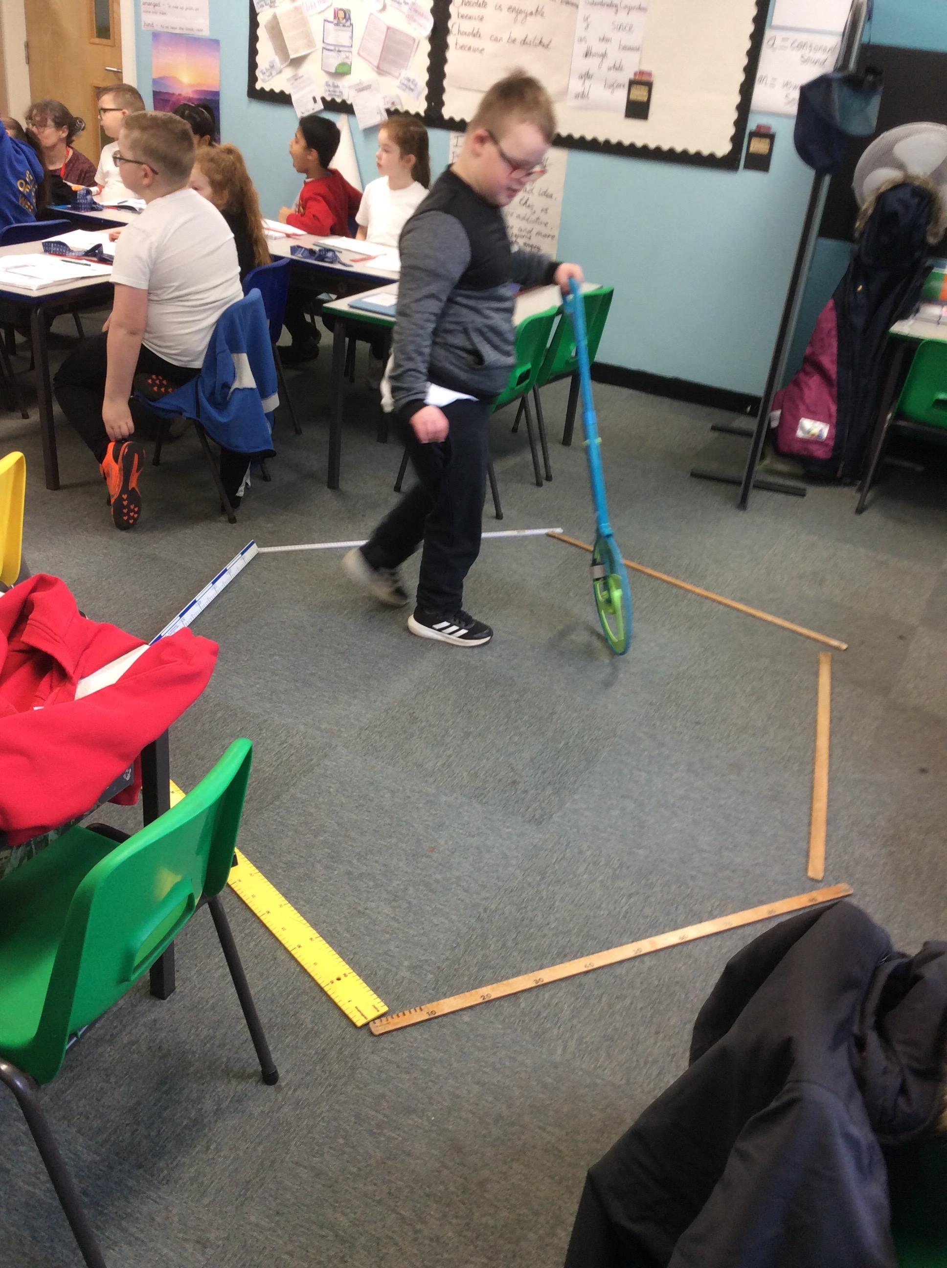 In Maths on Tuesday we were measuring the perimeter of big shapes and areas of the school in metres