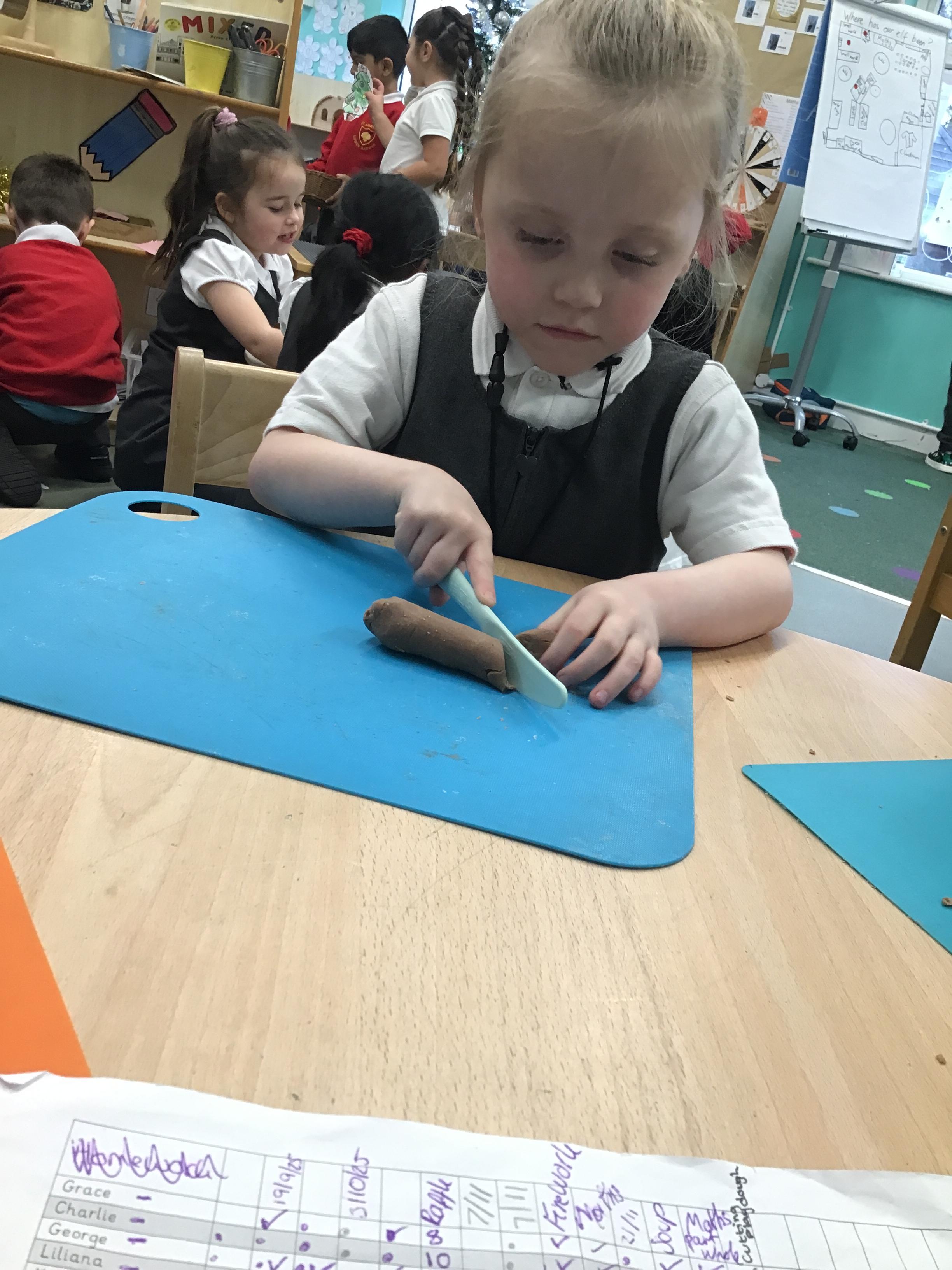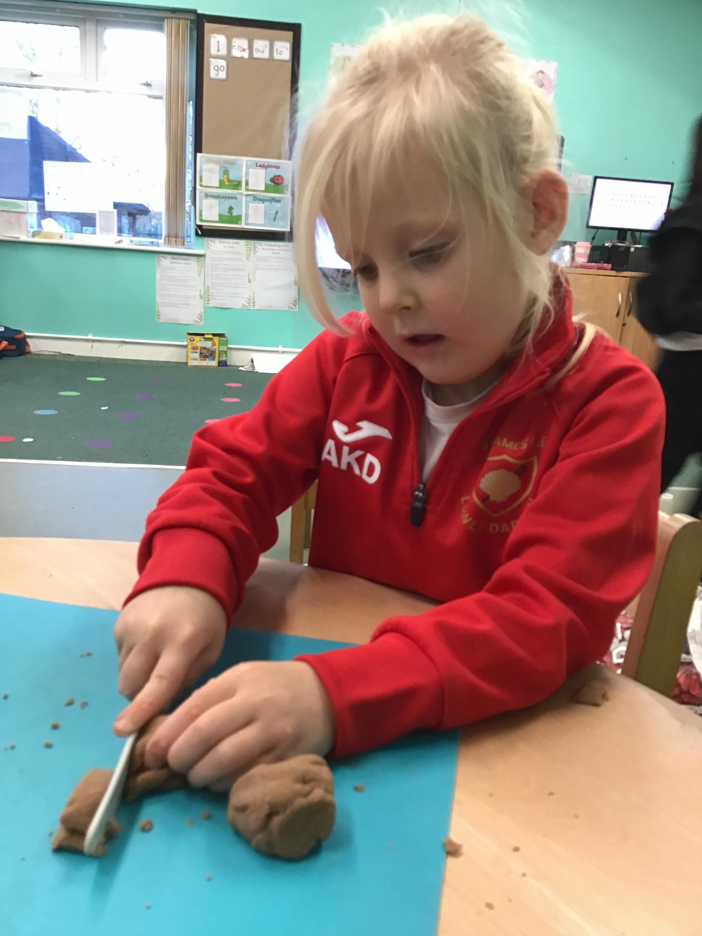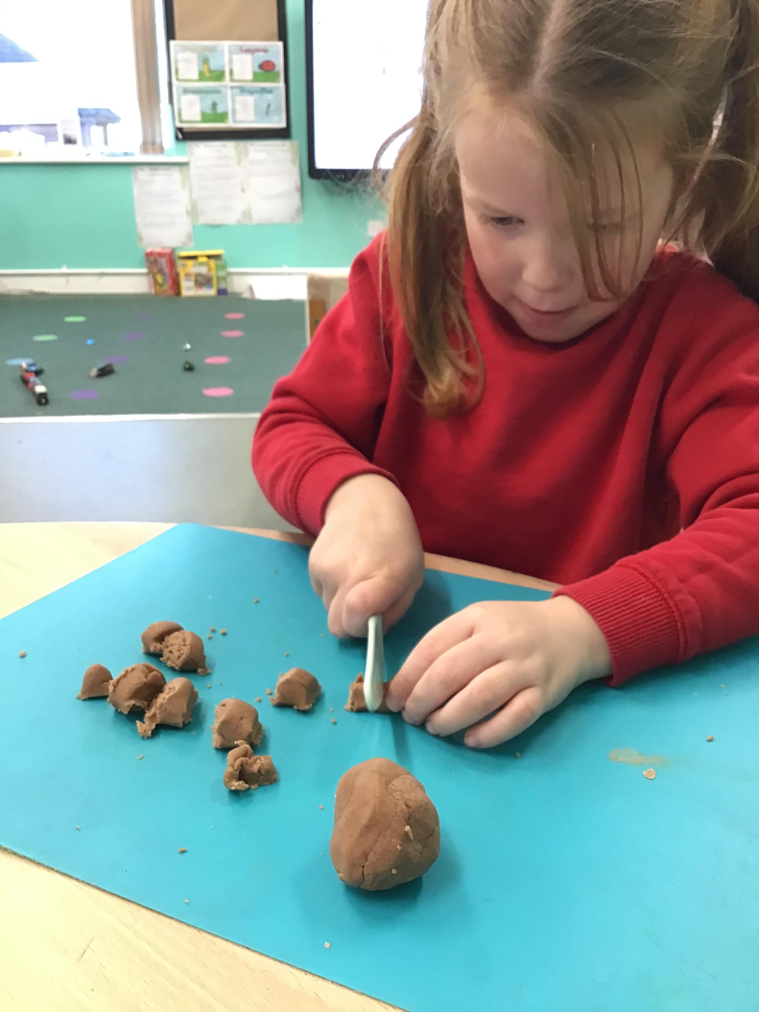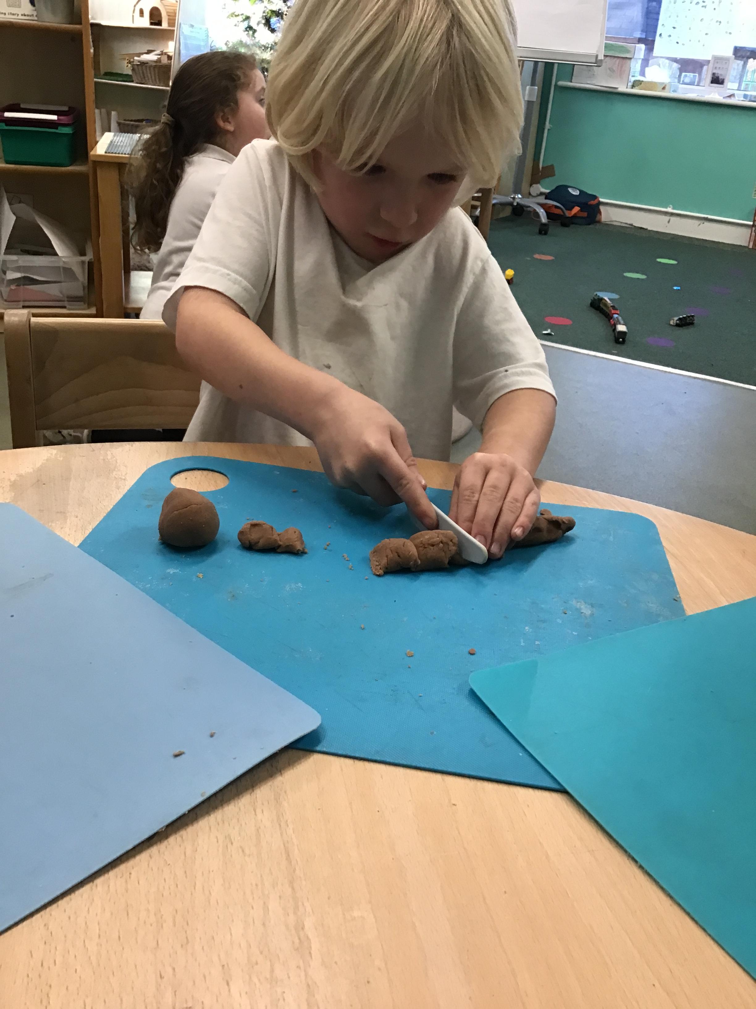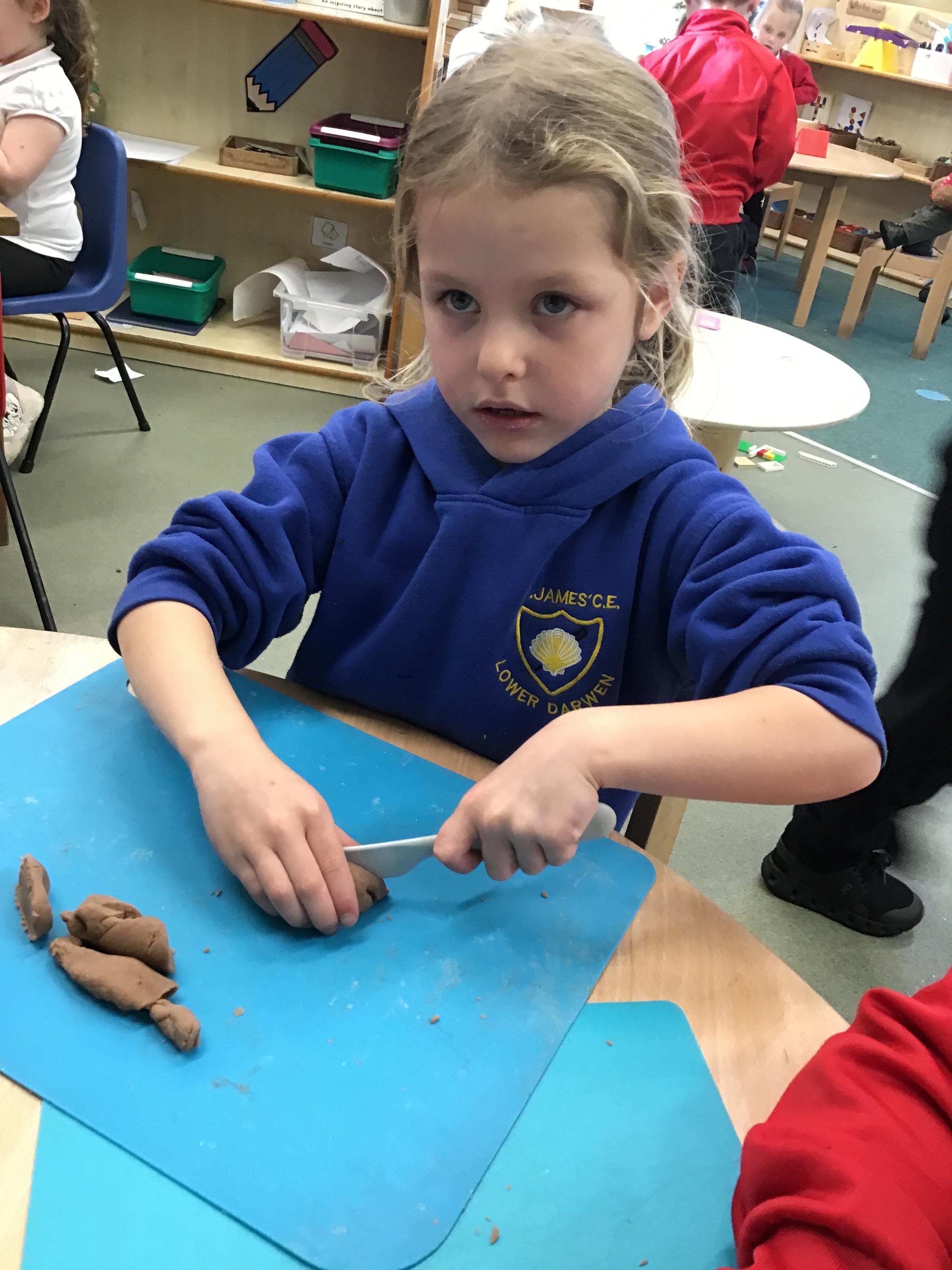 In maths we have been exploring shapes with 4 sides - squares and rectangles and in phonics we learned the sounds 'f' and 'ff'. We have also practised our cutting skills with knives and playdough and drew a map of our journey to the library.