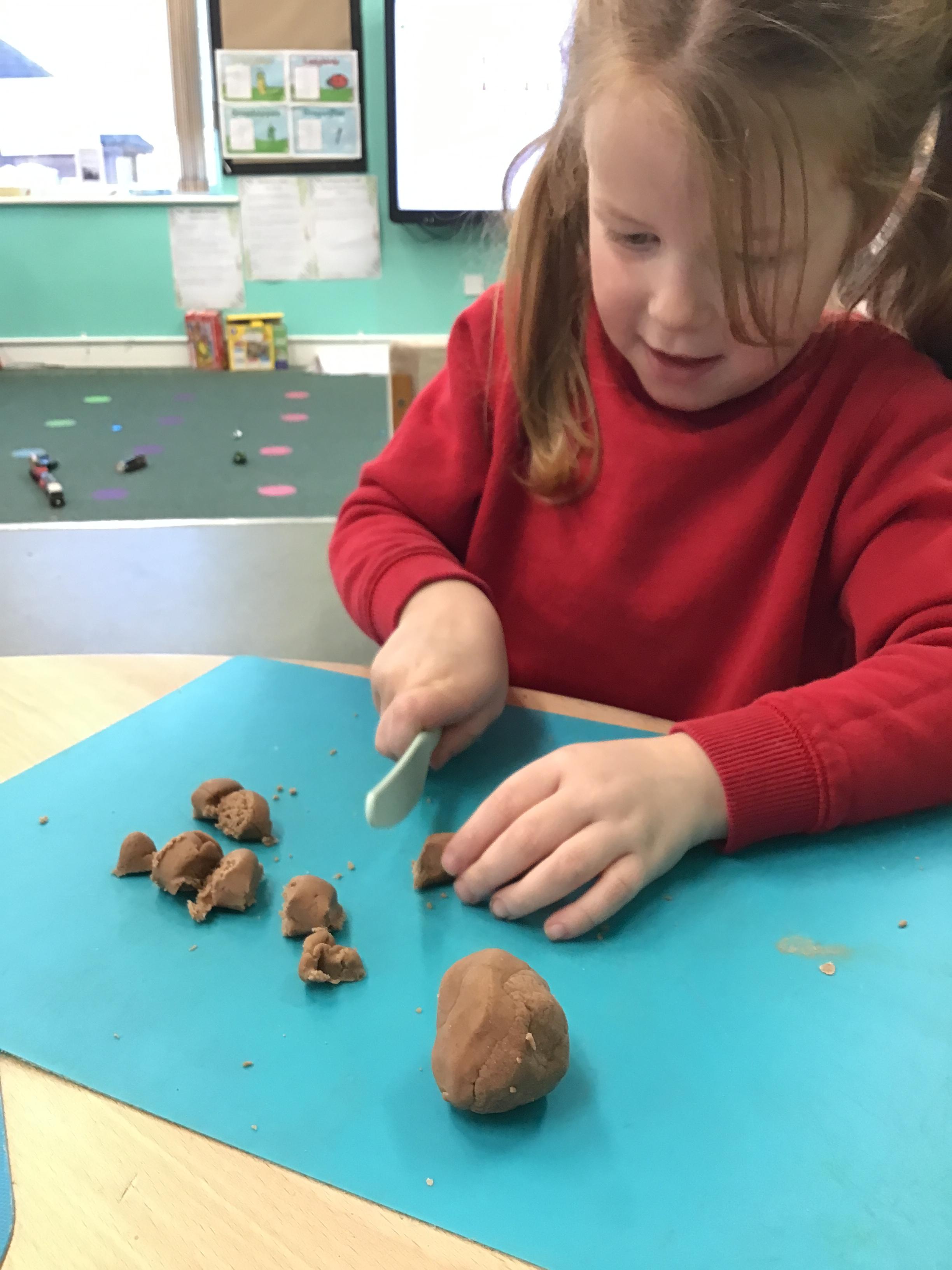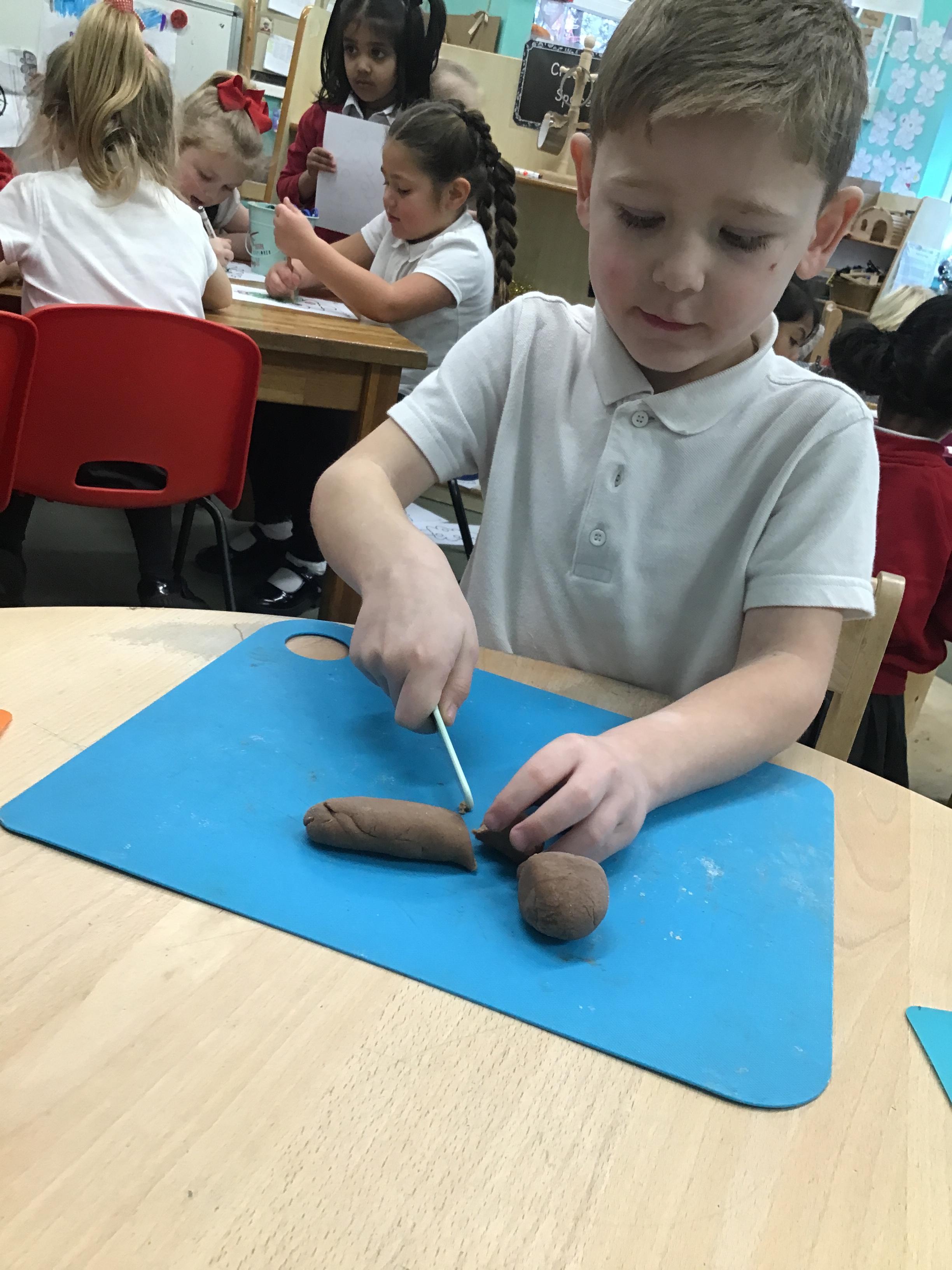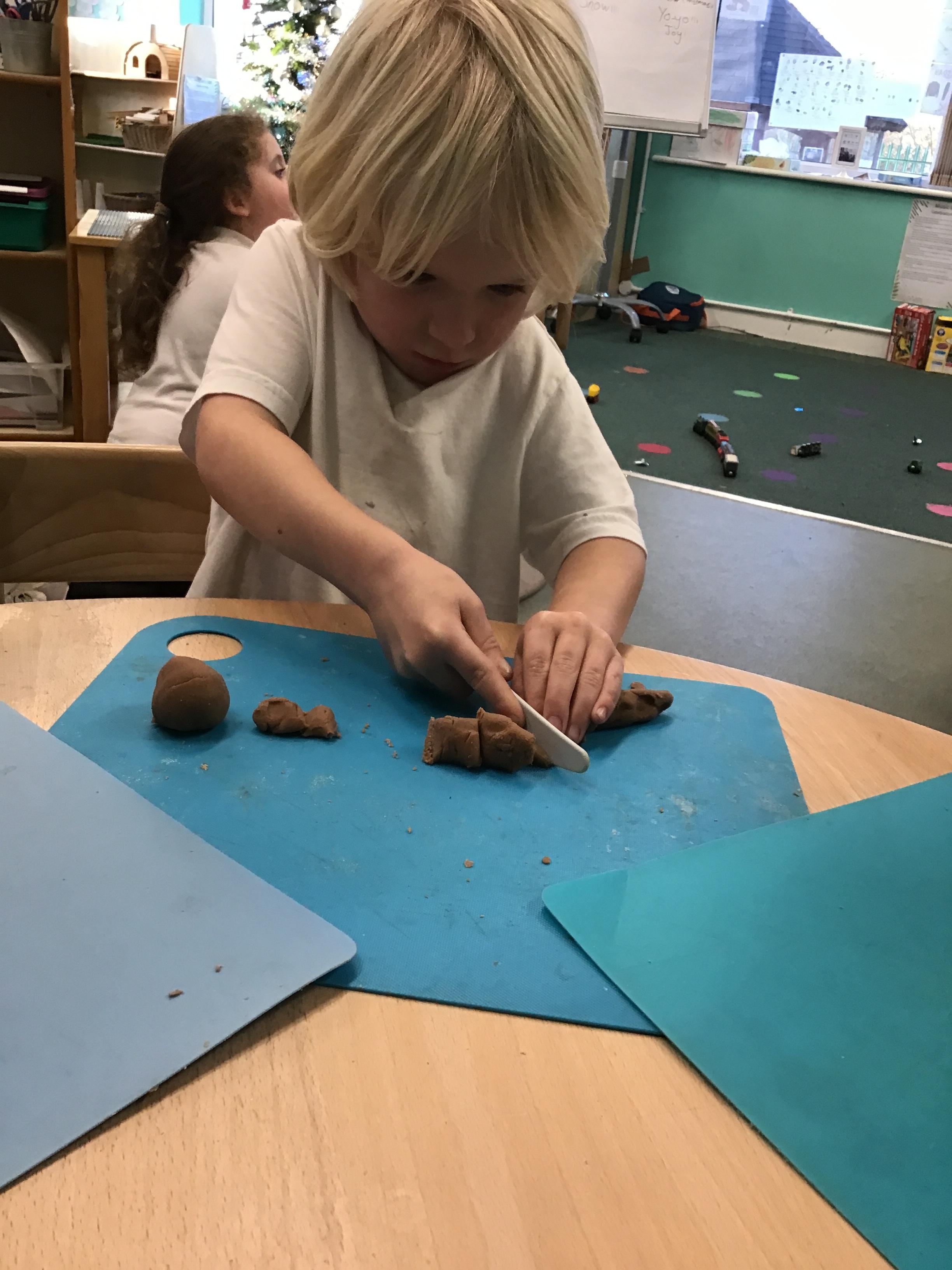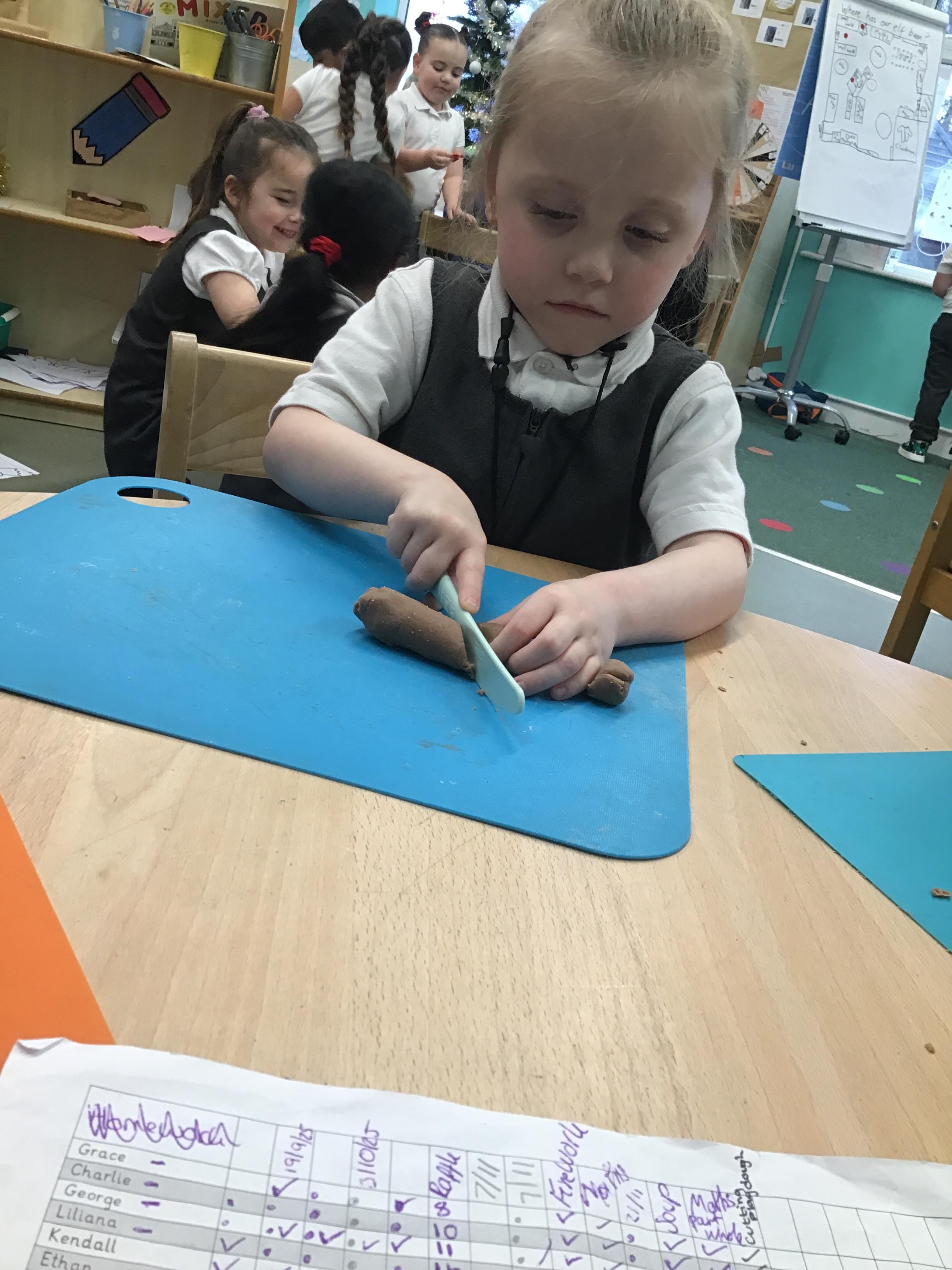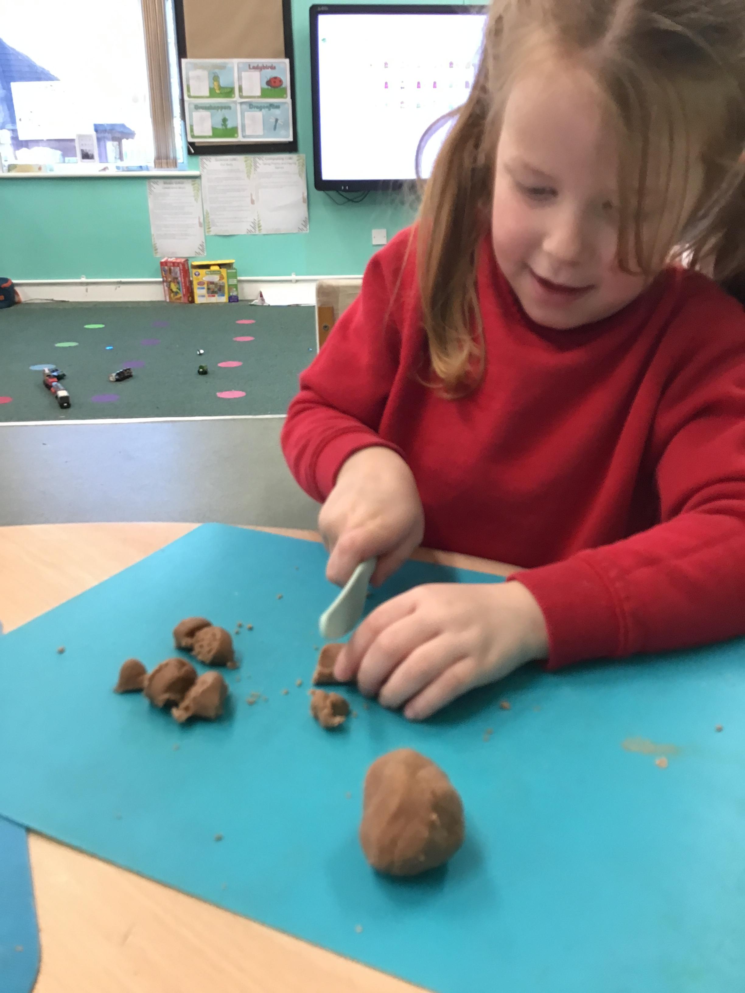 In maths we have been exploring shapes with 4 sides - squares and rectangles and in phonics we learned the sounds 'f' and 'ff'. We have also practised our cutting skills with knives and playdough and drew a map of our journey to the library.