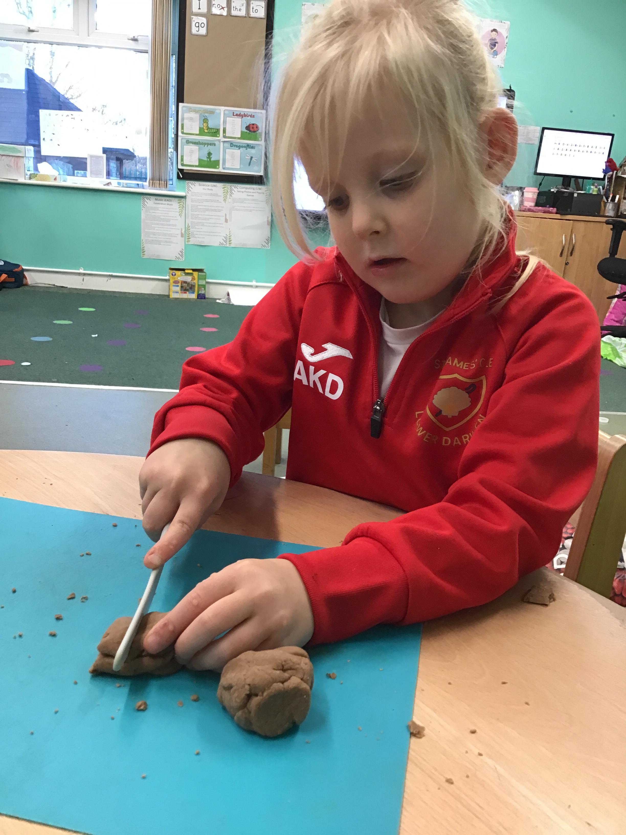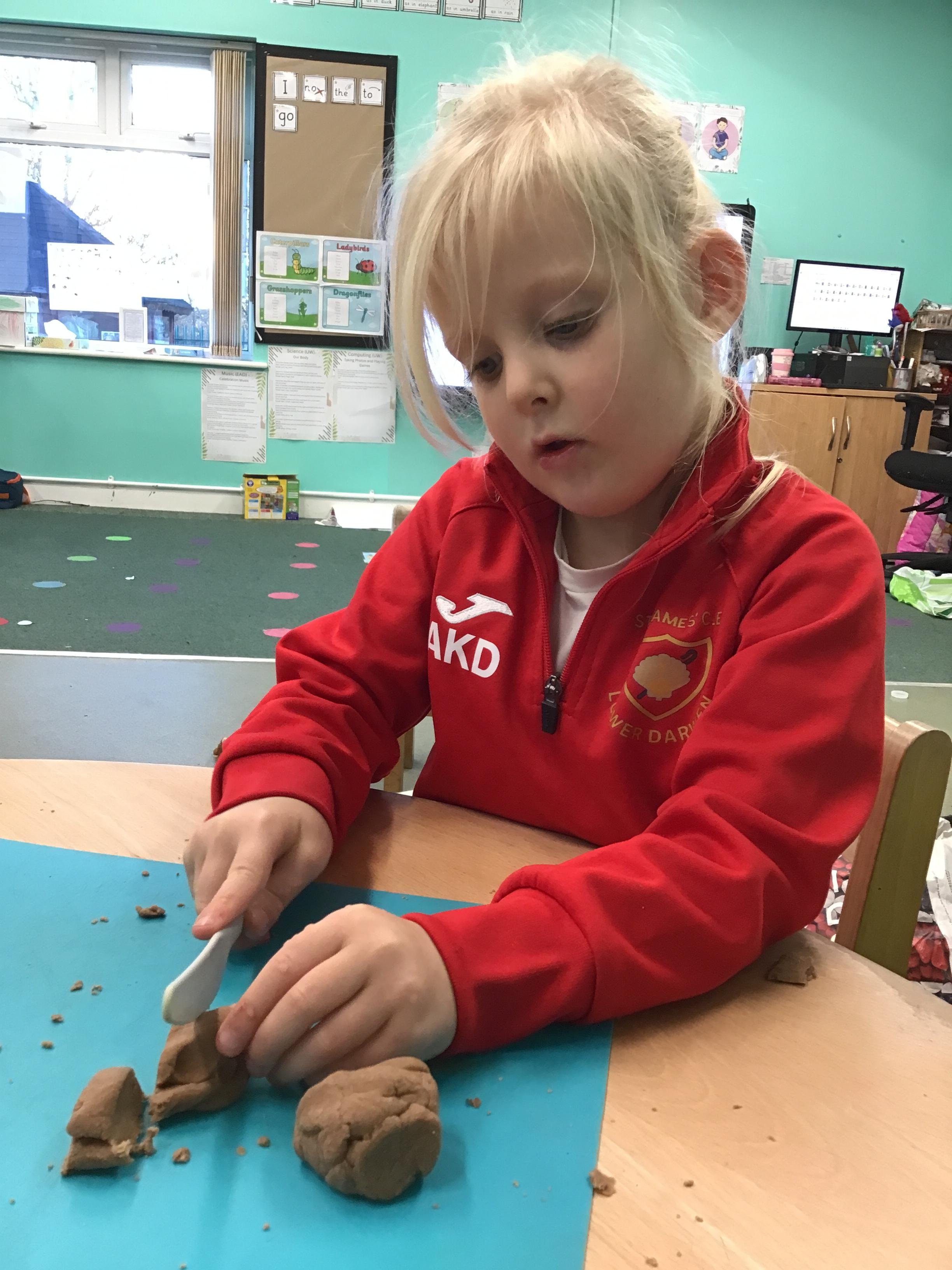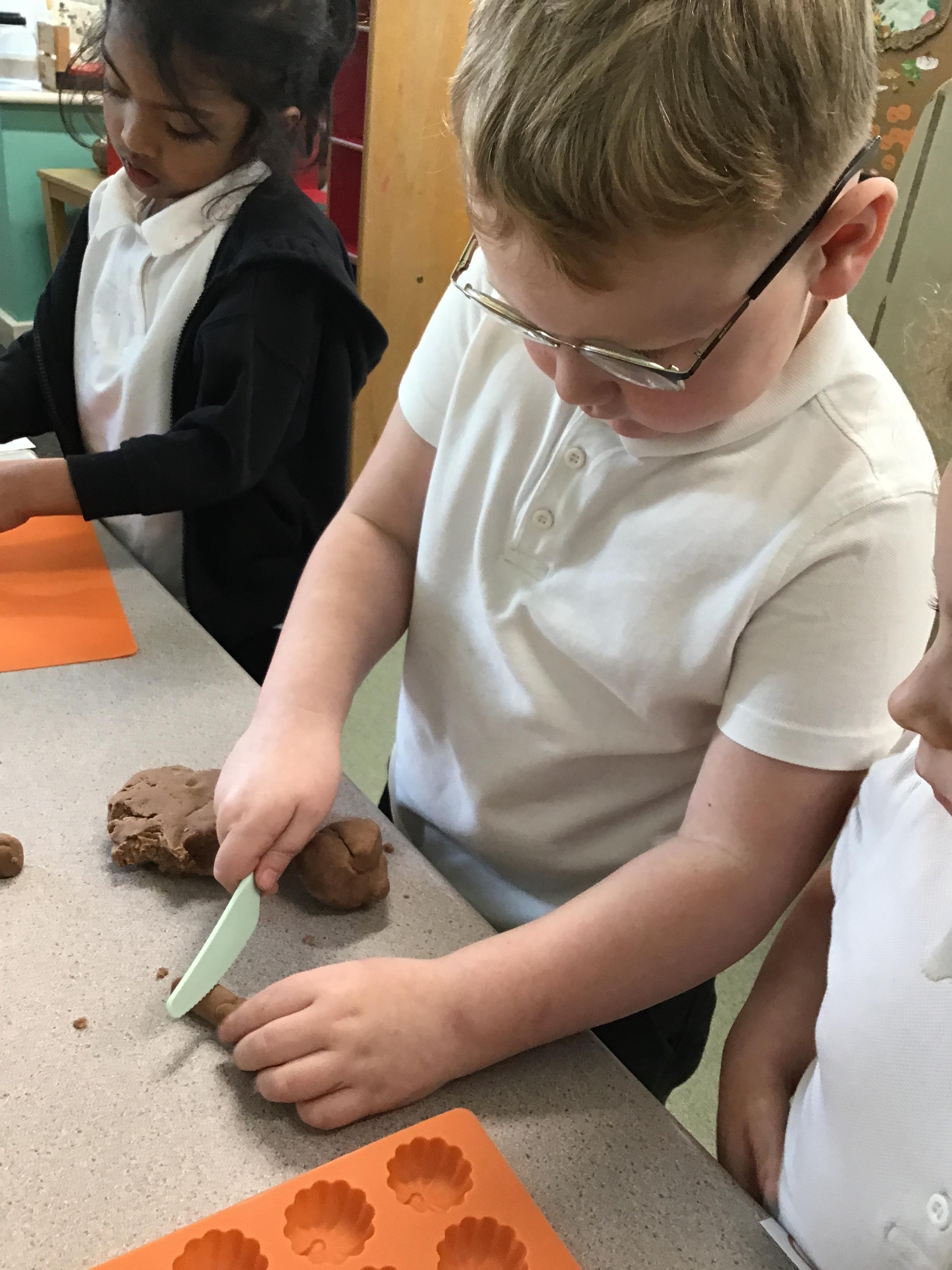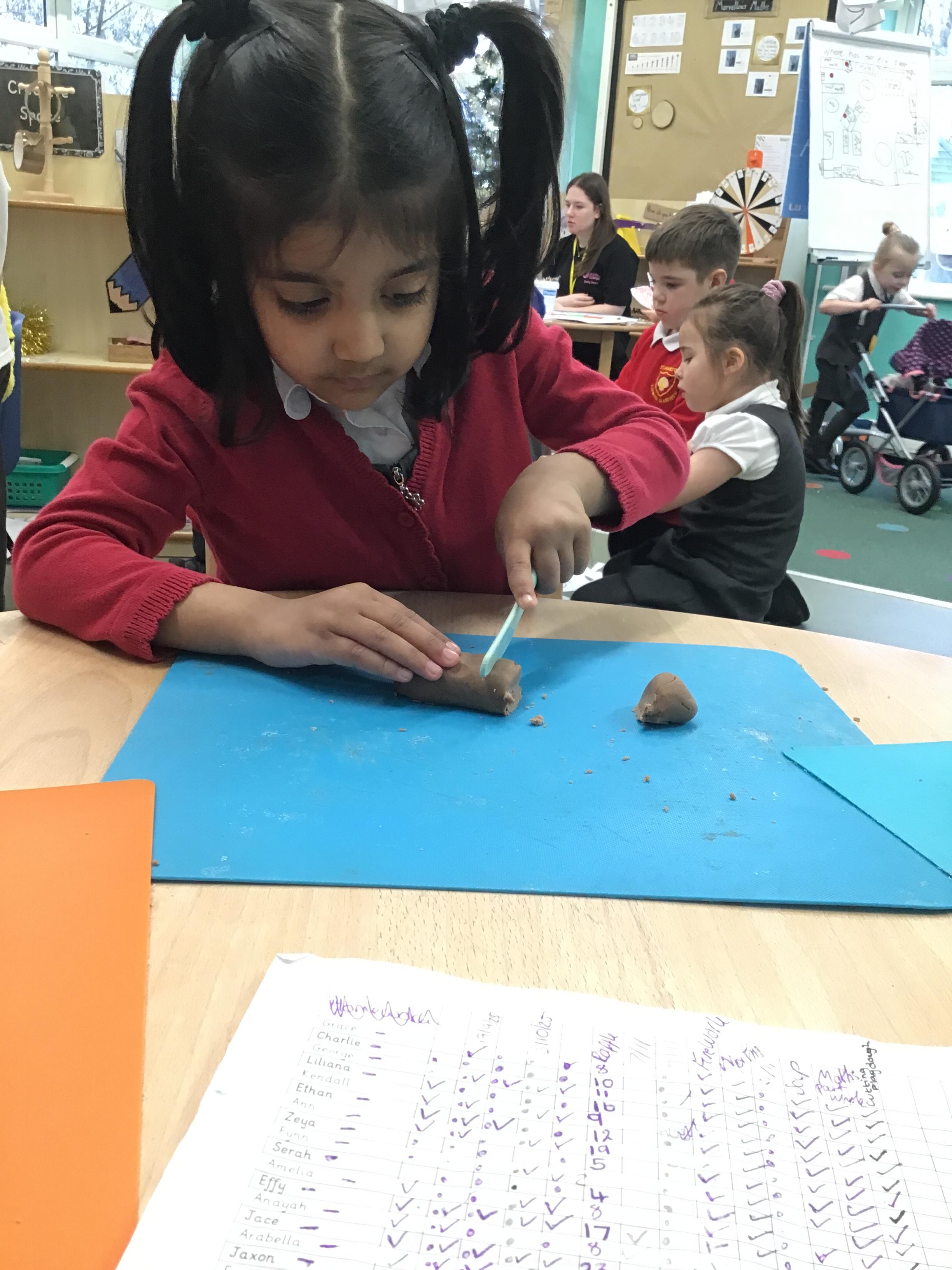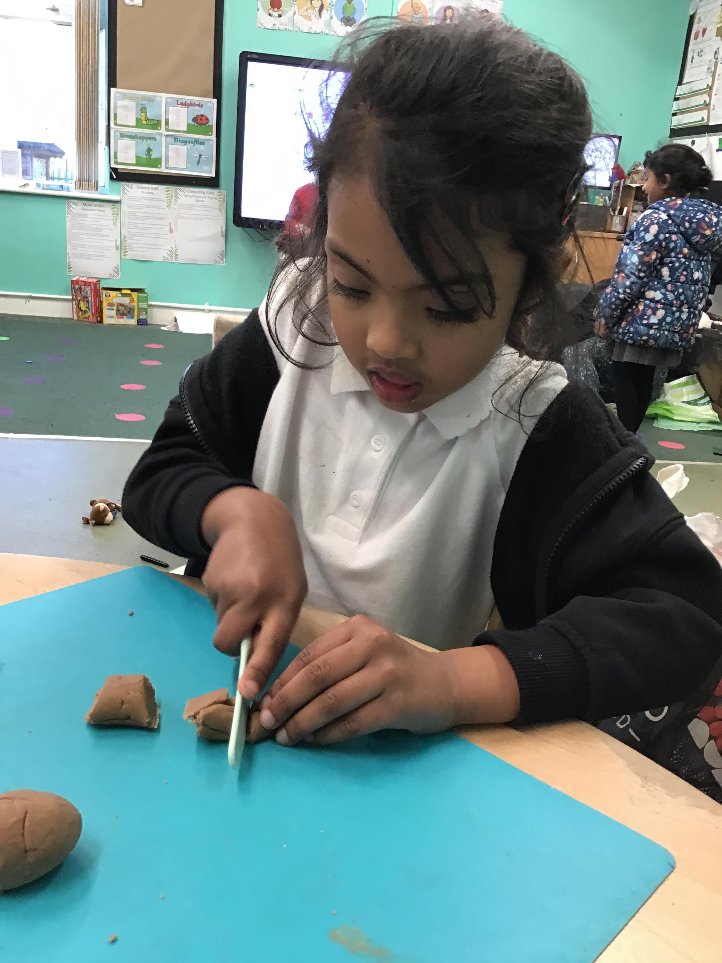 In maths we have been exploring shapes with 4 sides - squares and rectangles and in phonics we learned the sounds 'f' and 'ff'. We have also practised our cutting skills with knives and playdough and drew a map of our journey to the library.