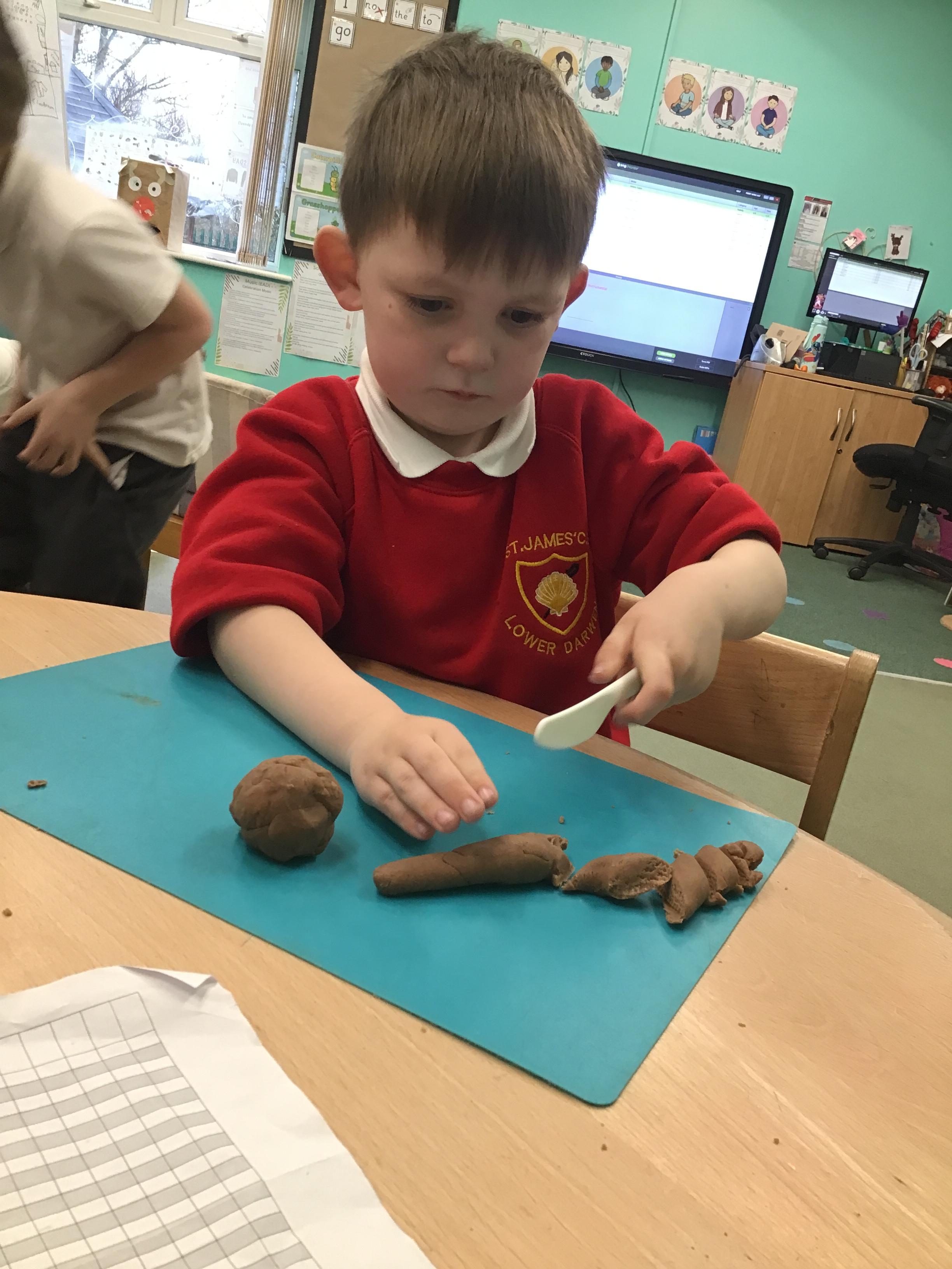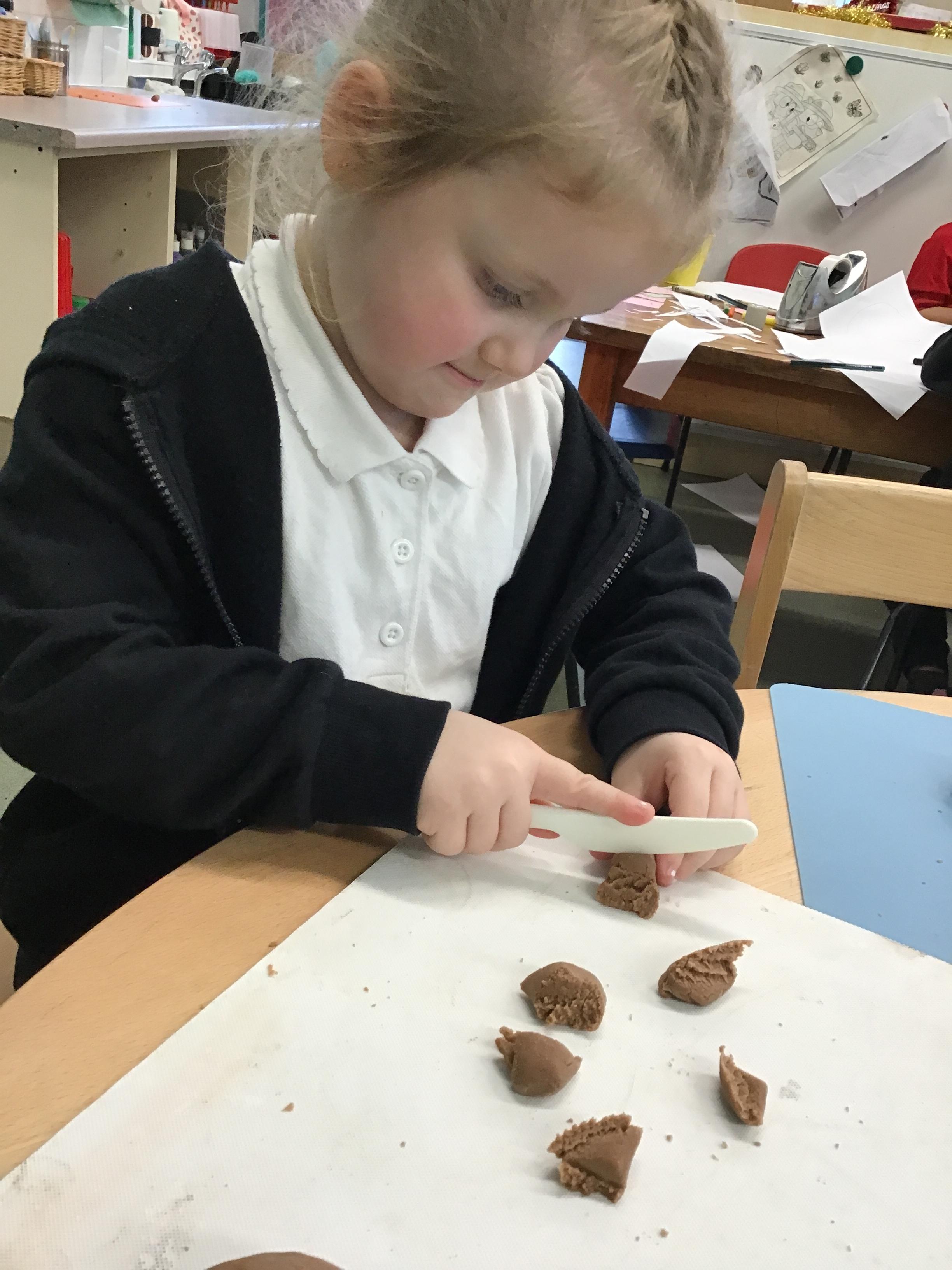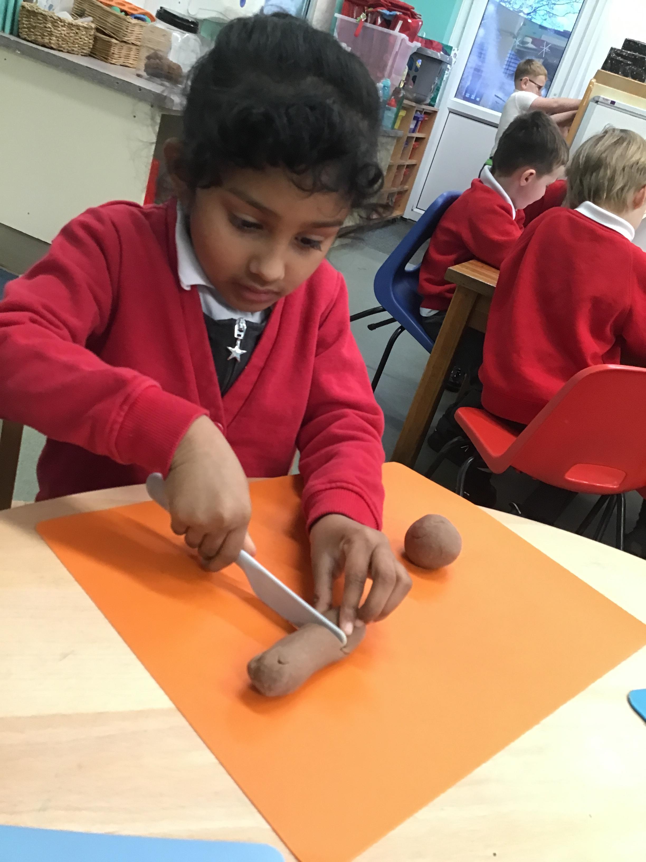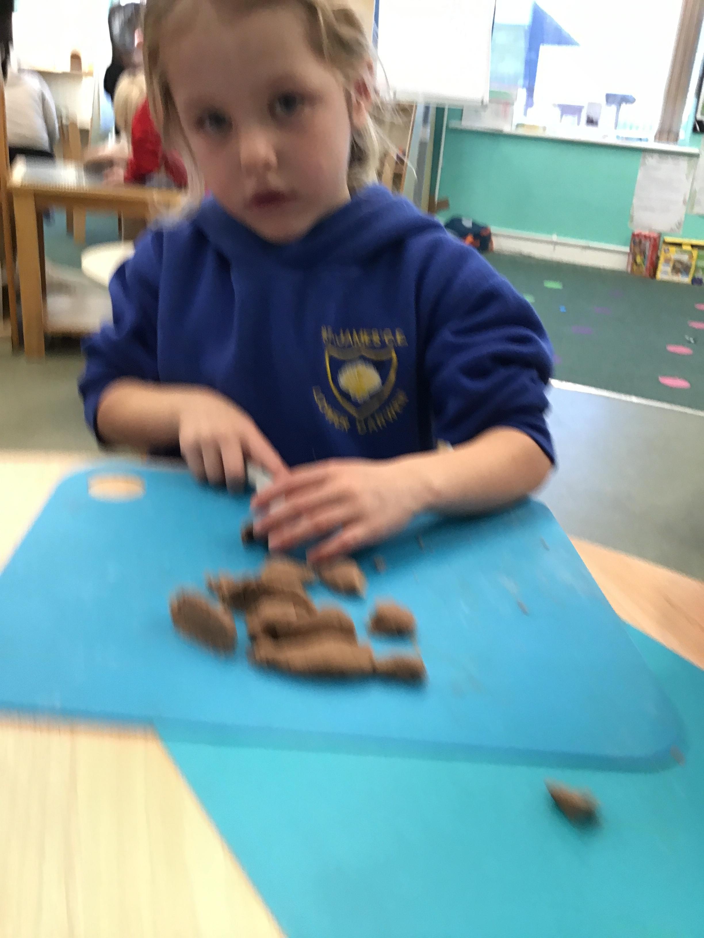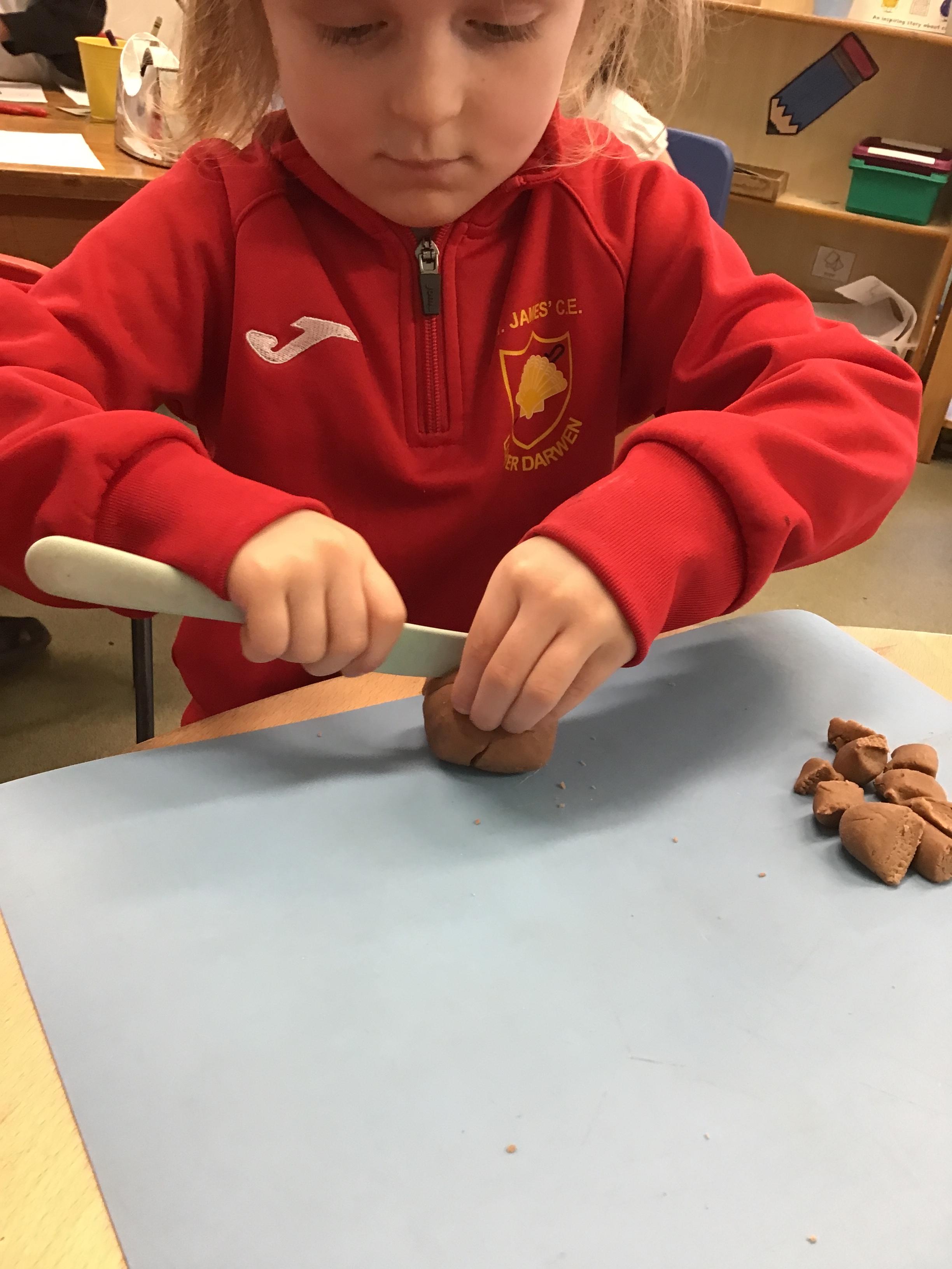 In maths we have been exploring shapes with 4 sides - squares and rectangles and in phonics we learned the sounds 'f' and 'ff'. We have also practised our cutting skills with knives and playdough and drew a map of our journey to the library.