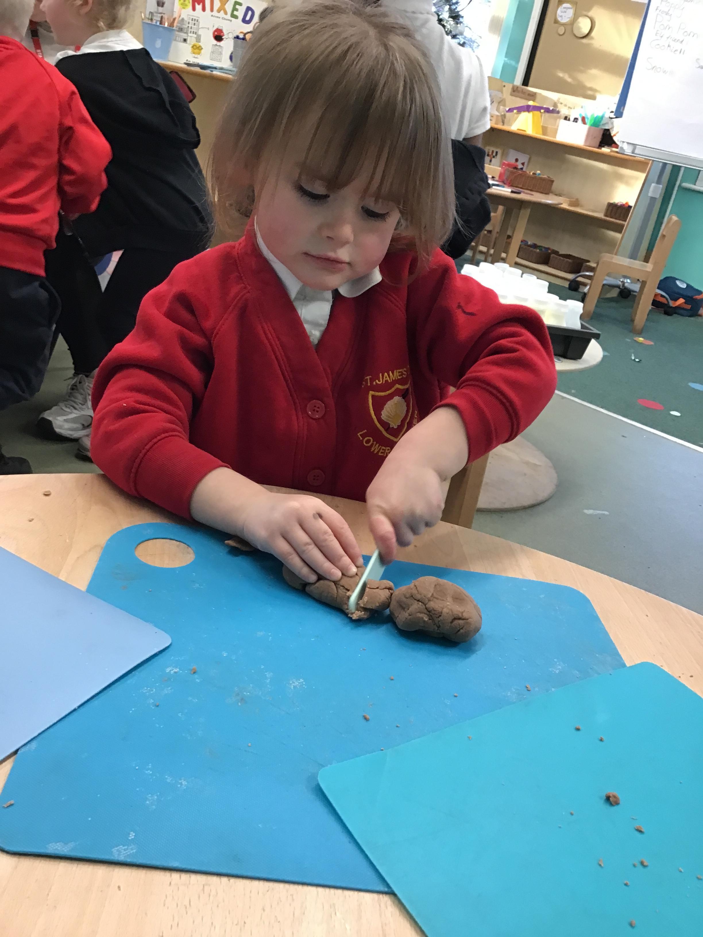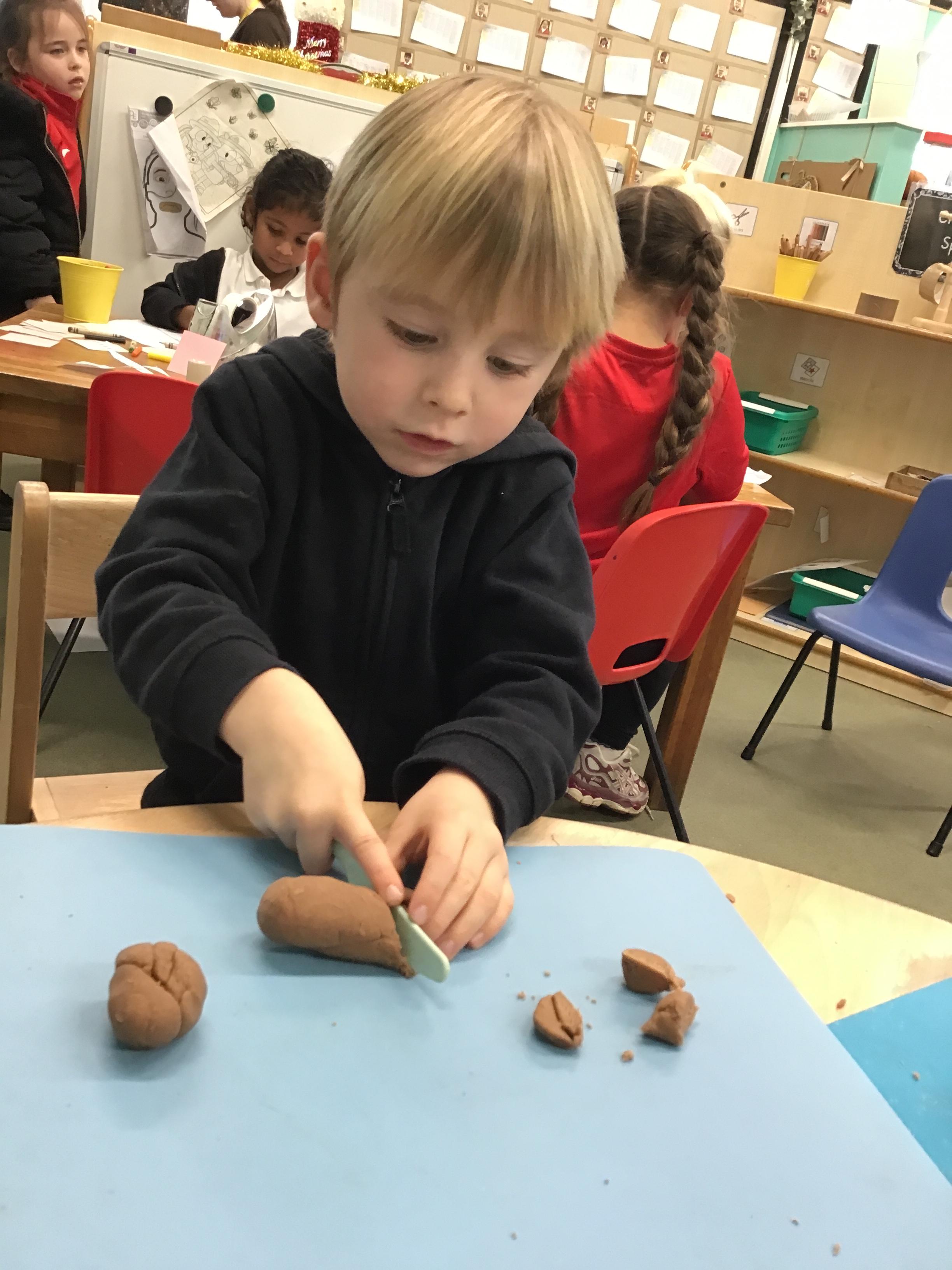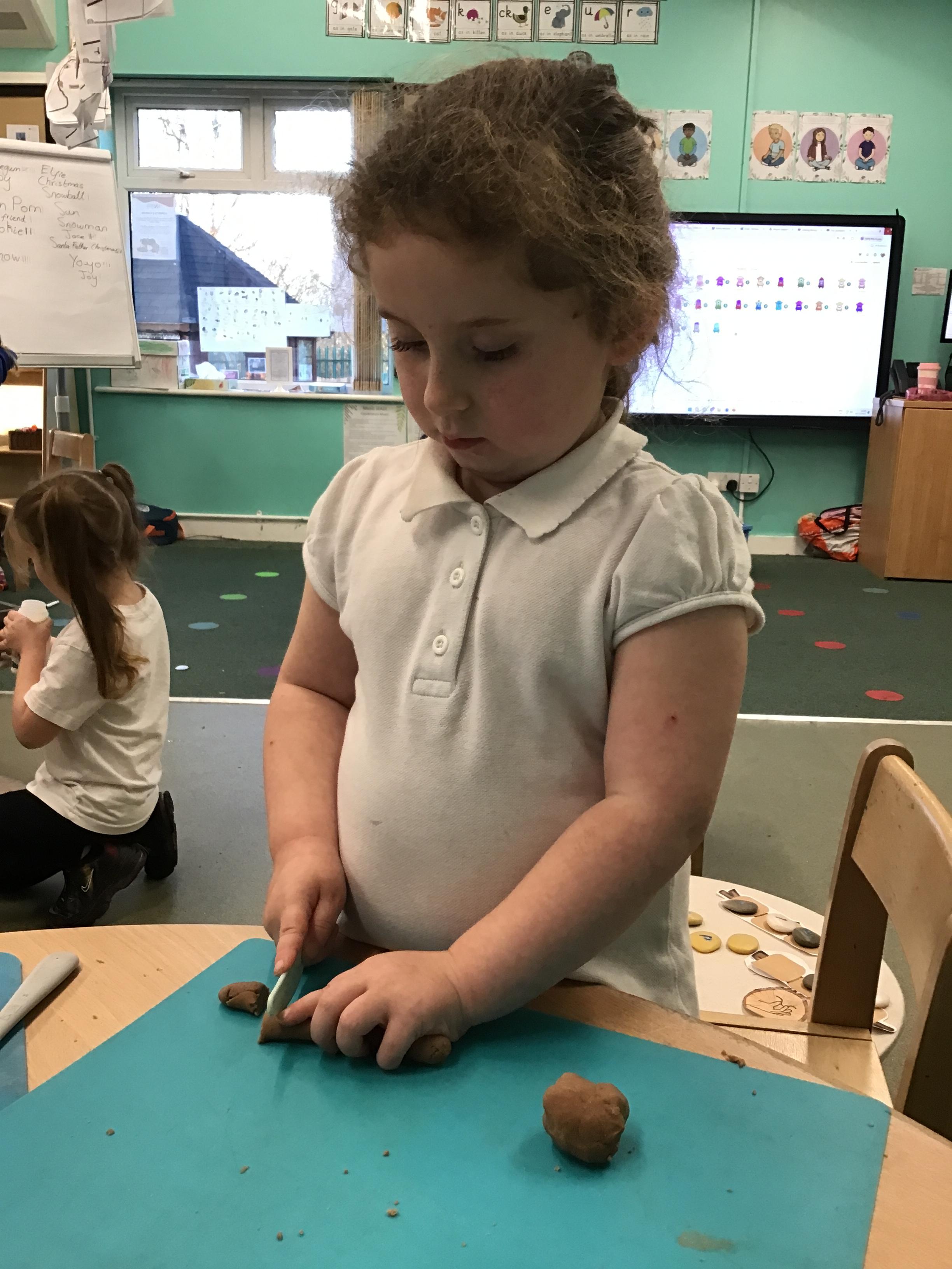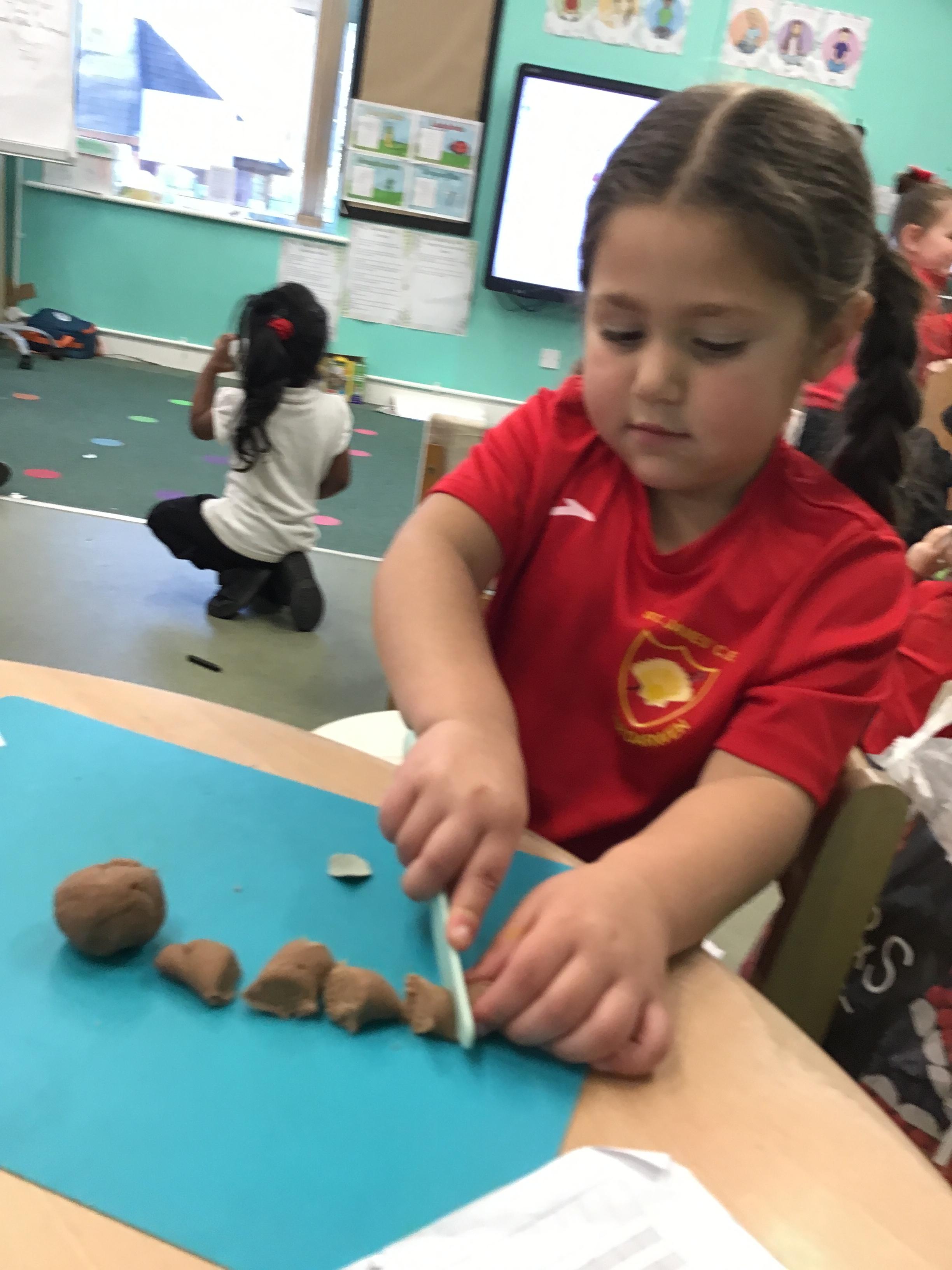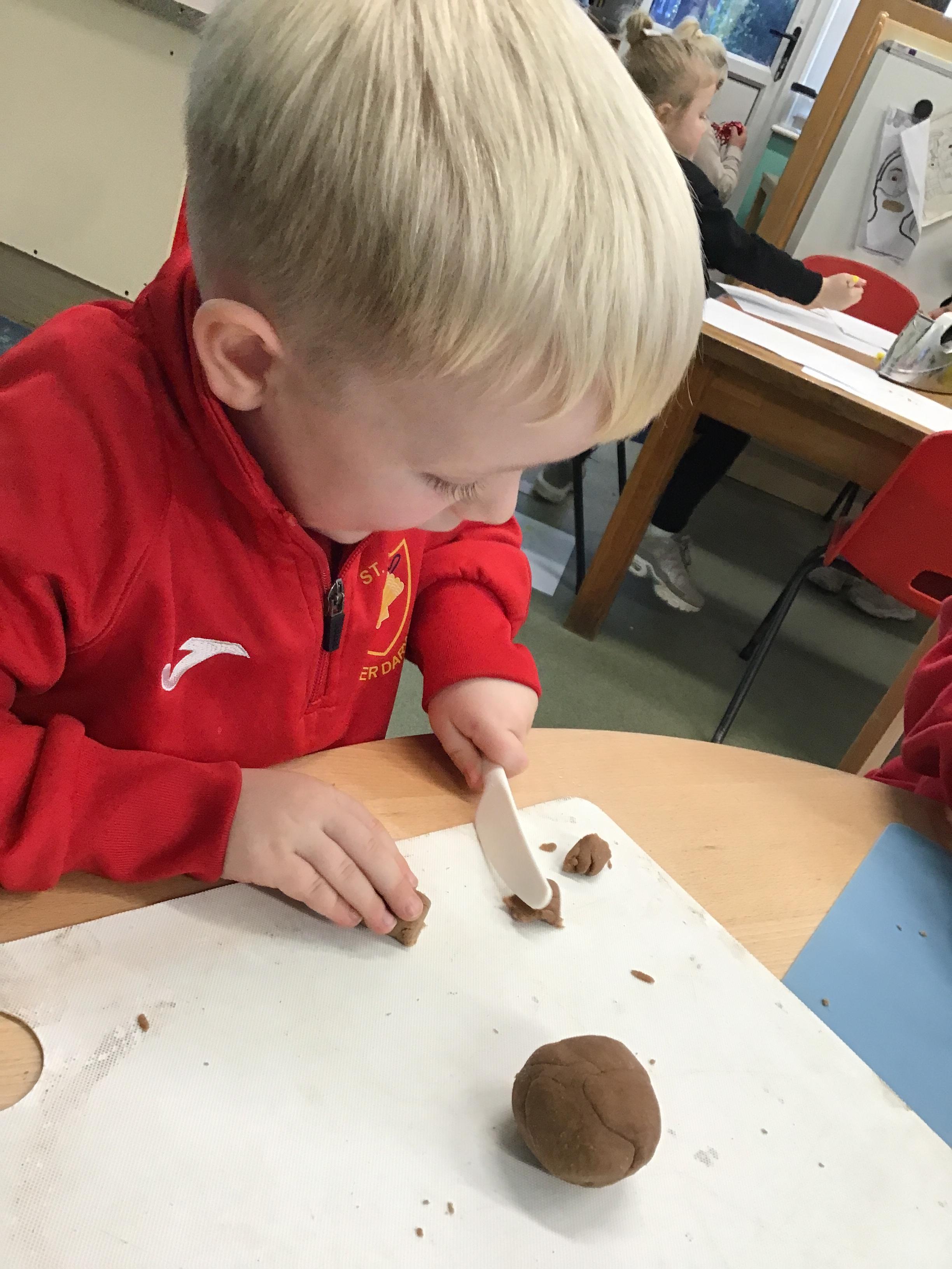 In maths we have been exploring shapes with 4 sides - squares and rectangles and in phonics we learned the sounds 'f' and 'ff'. We have also practised our cutting skills with knives and playdough and drew a map of our journey to the library.