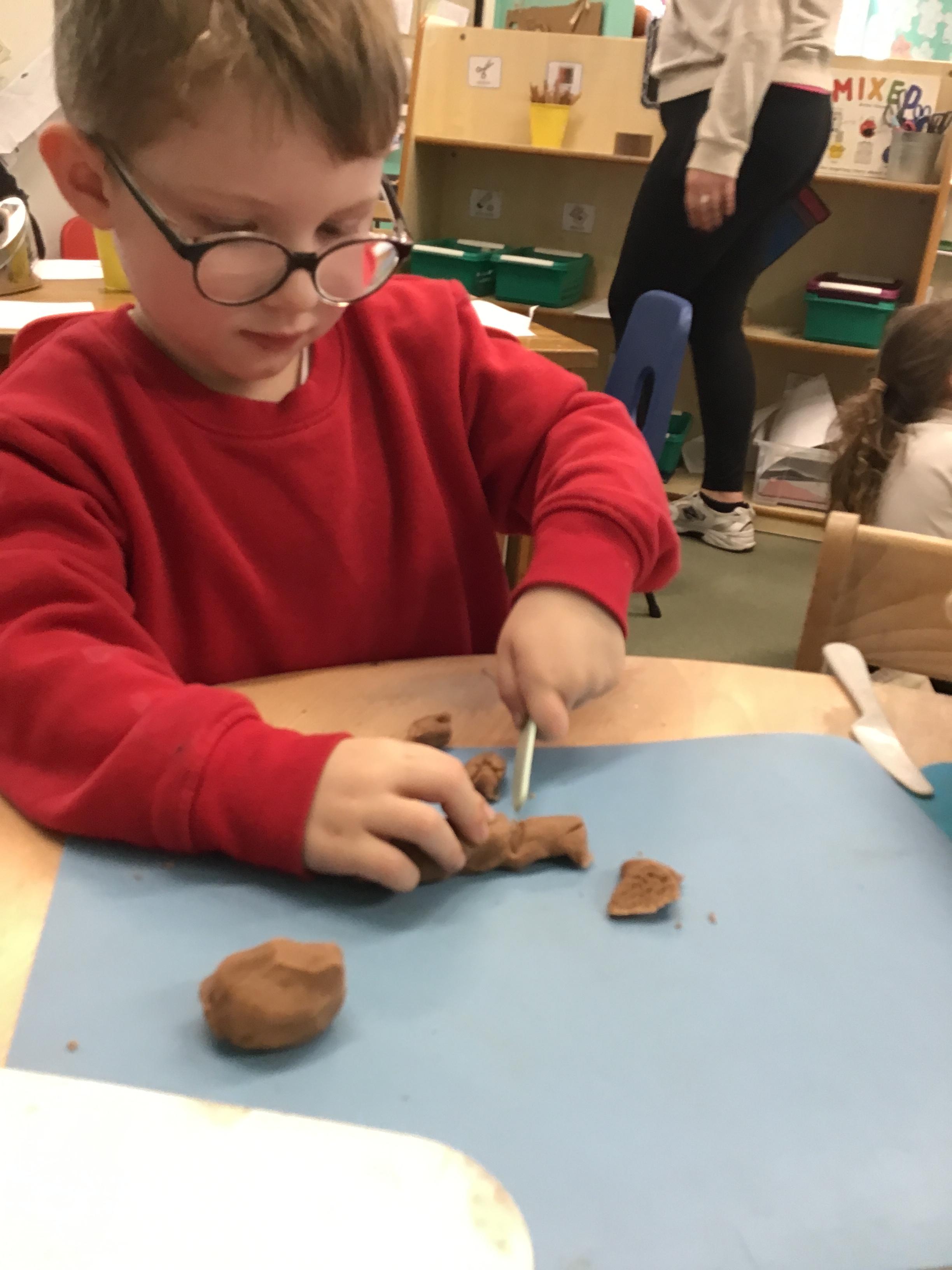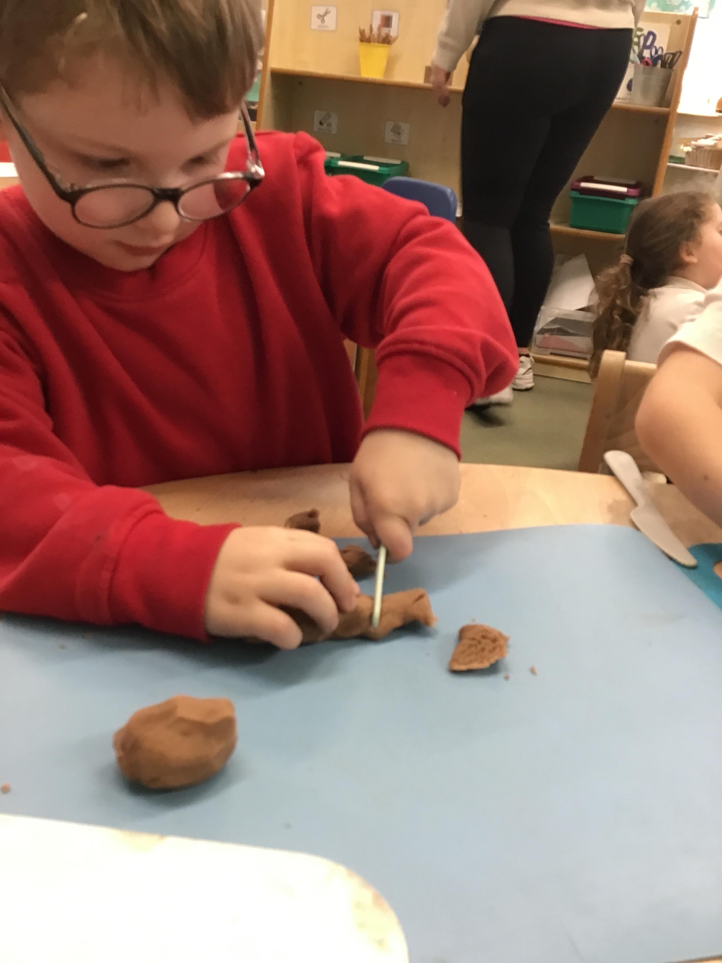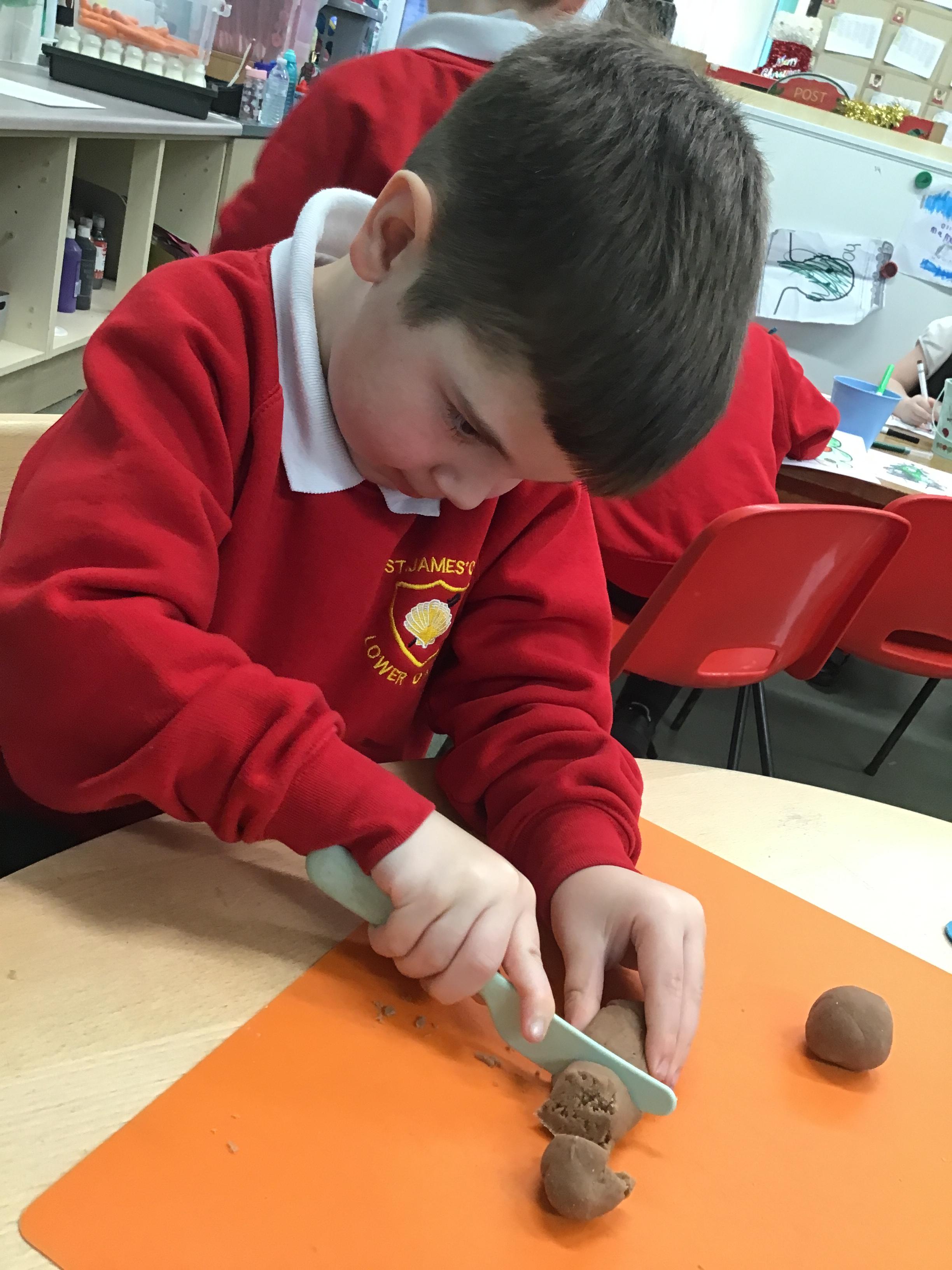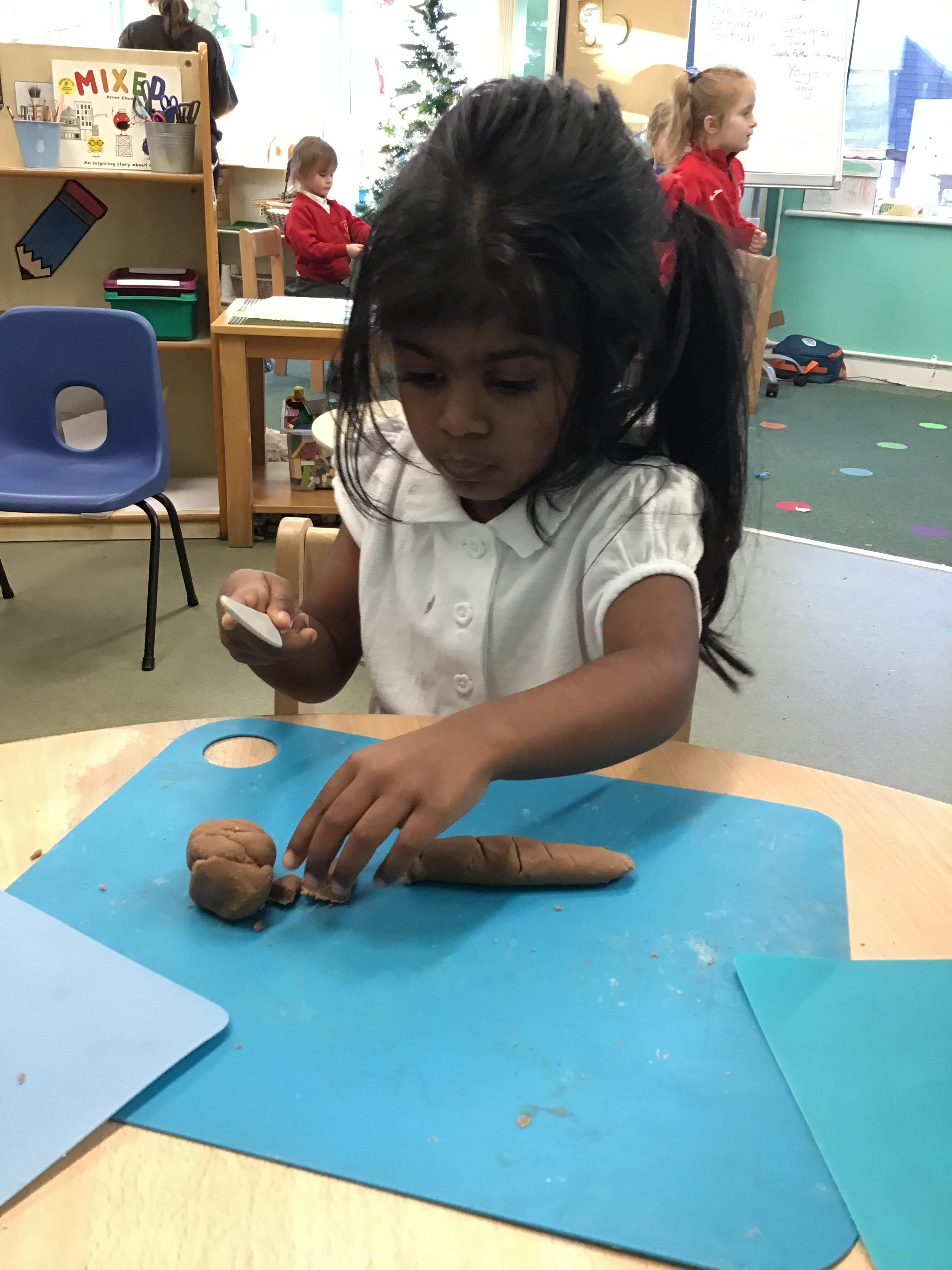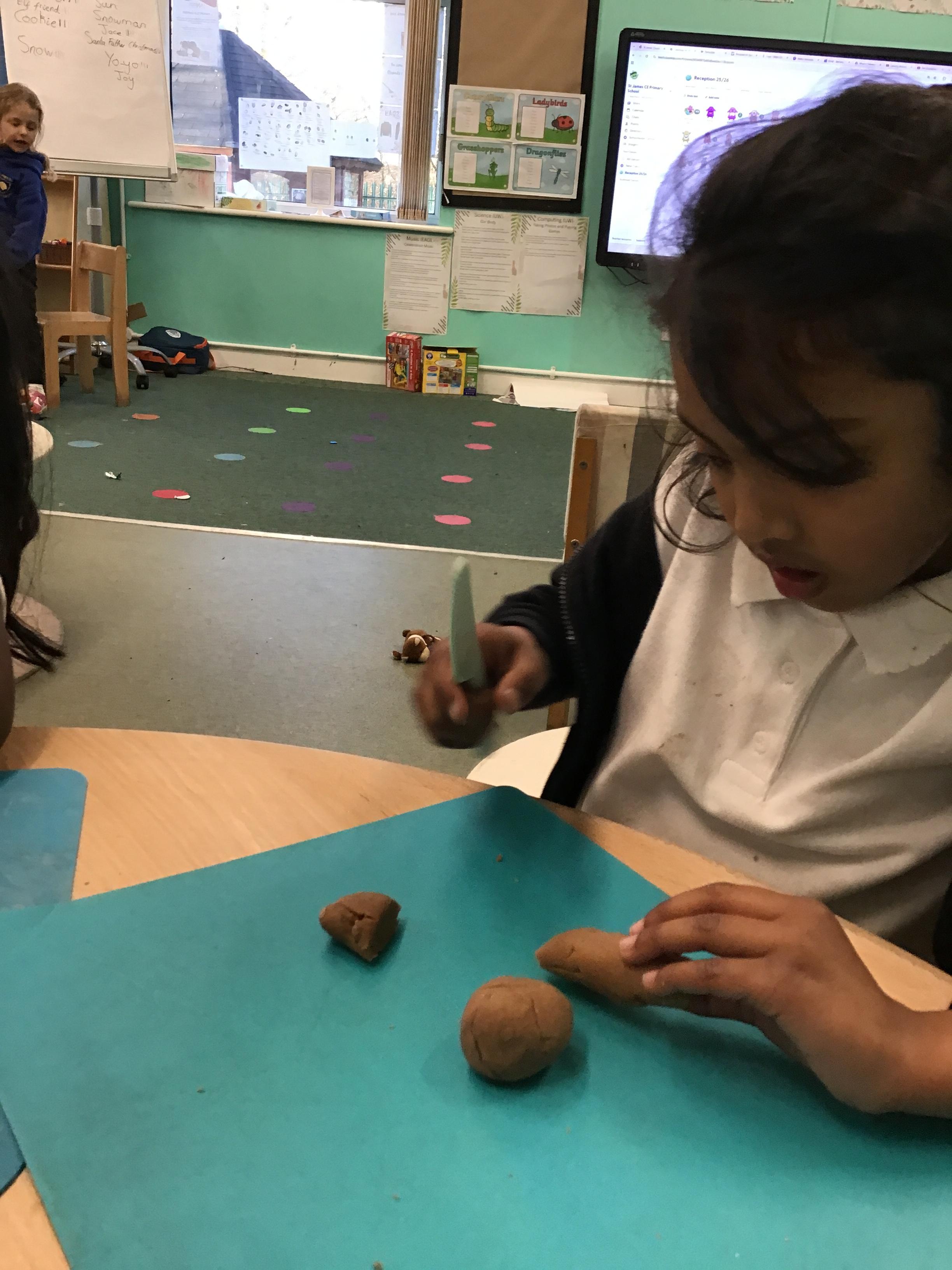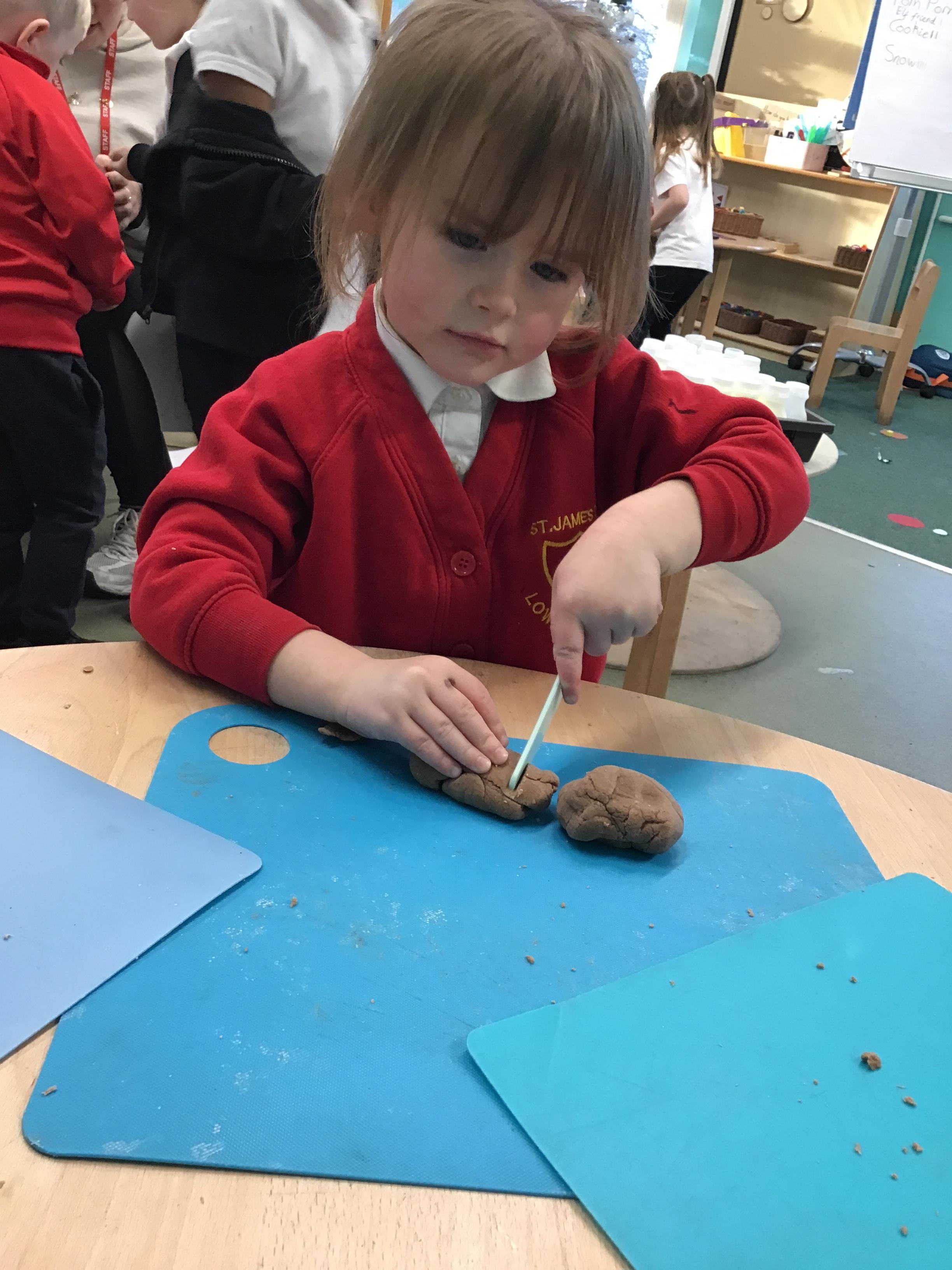 In maths we have been exploring shapes with 4 sides - squares and rectangles and in phonics we learned the sounds 'f' and 'ff'. We have also practised our cutting skills with knives and playdough and drew a map of our journey to the library.