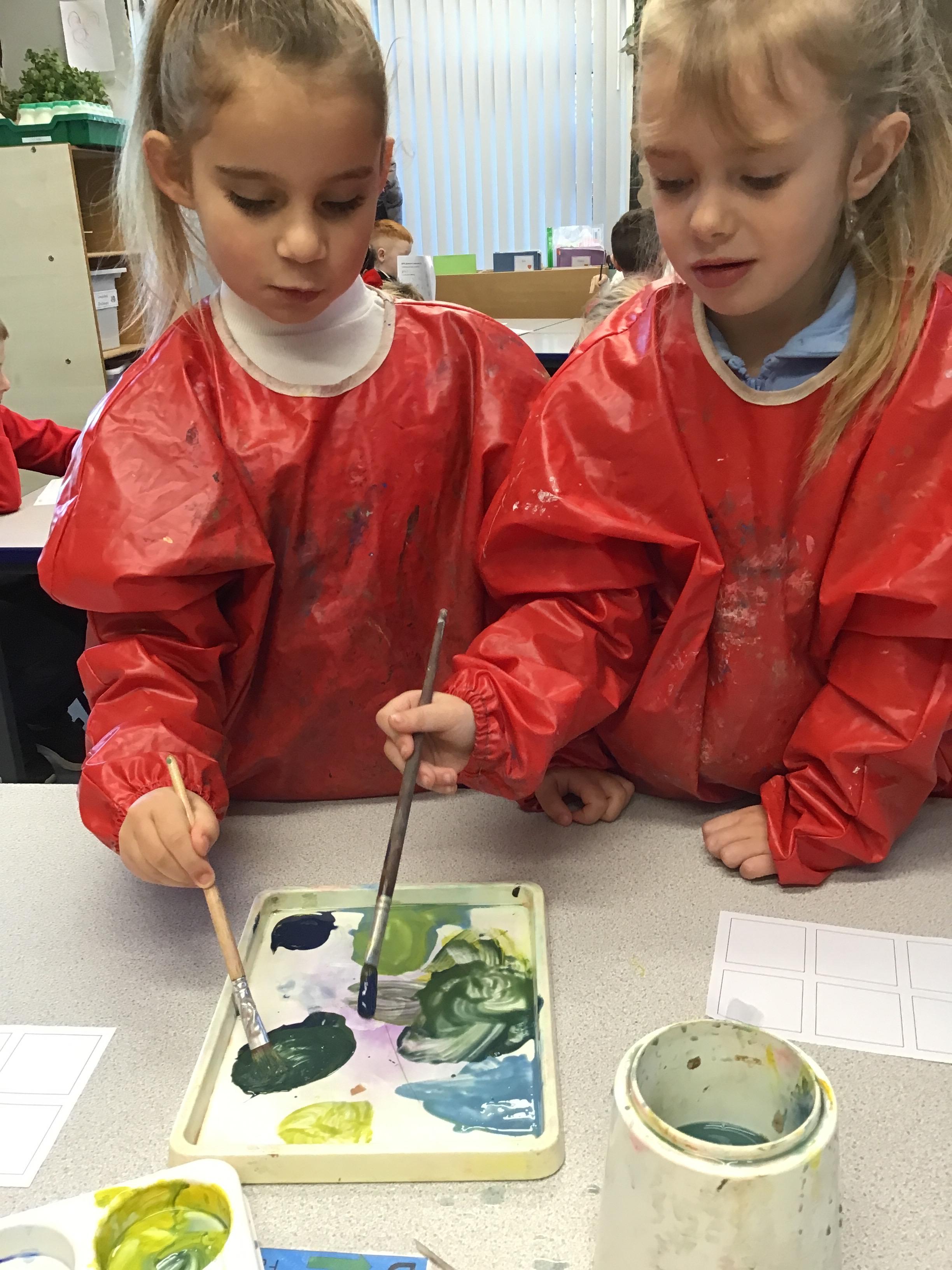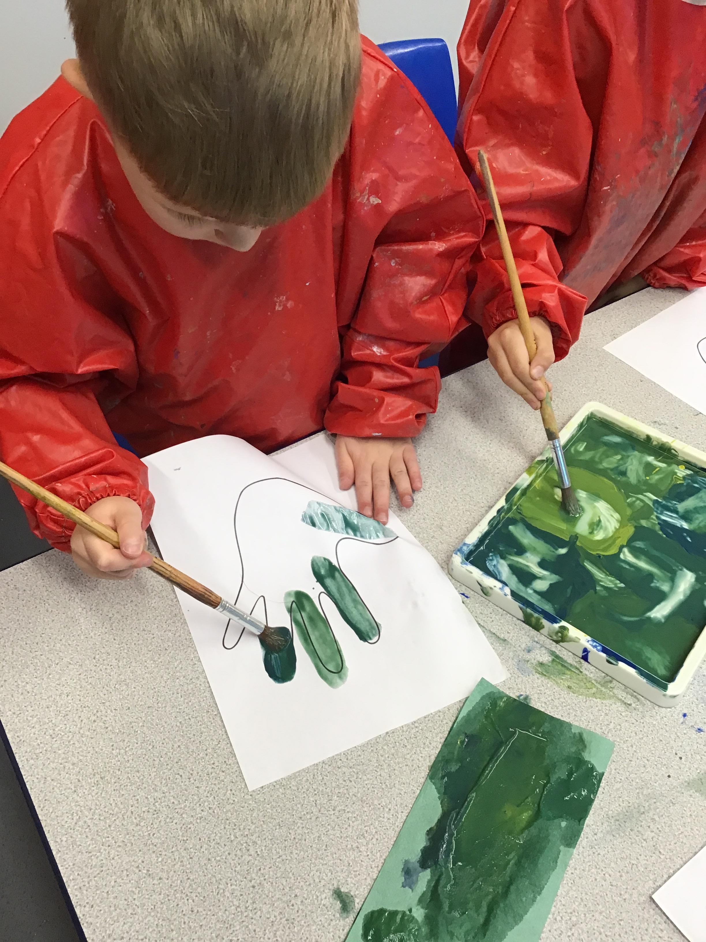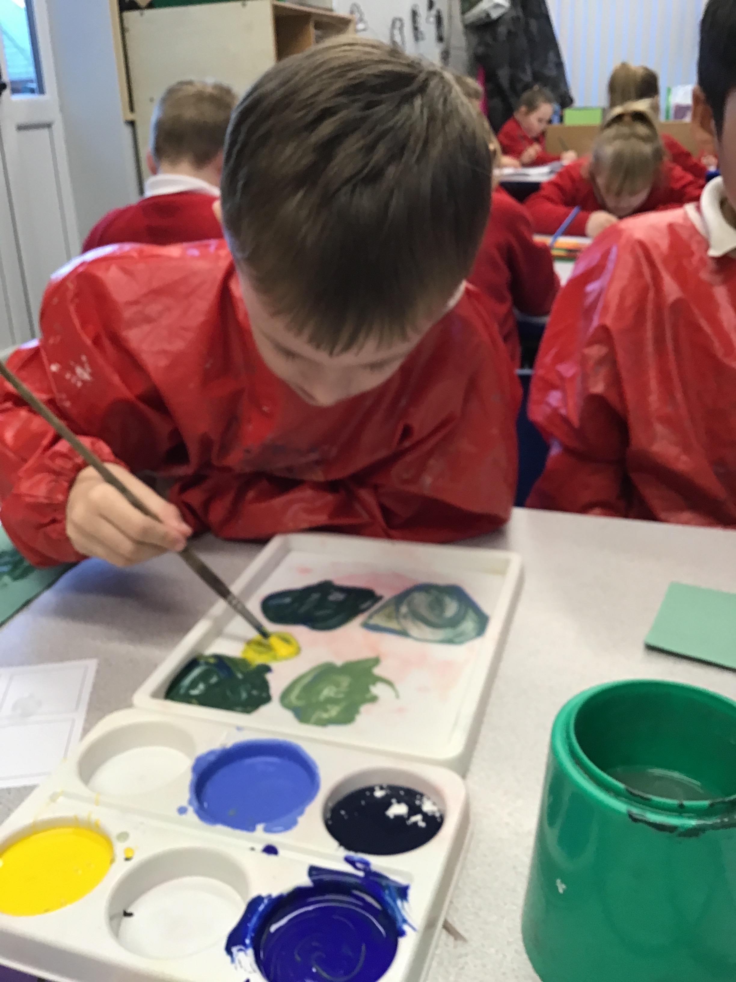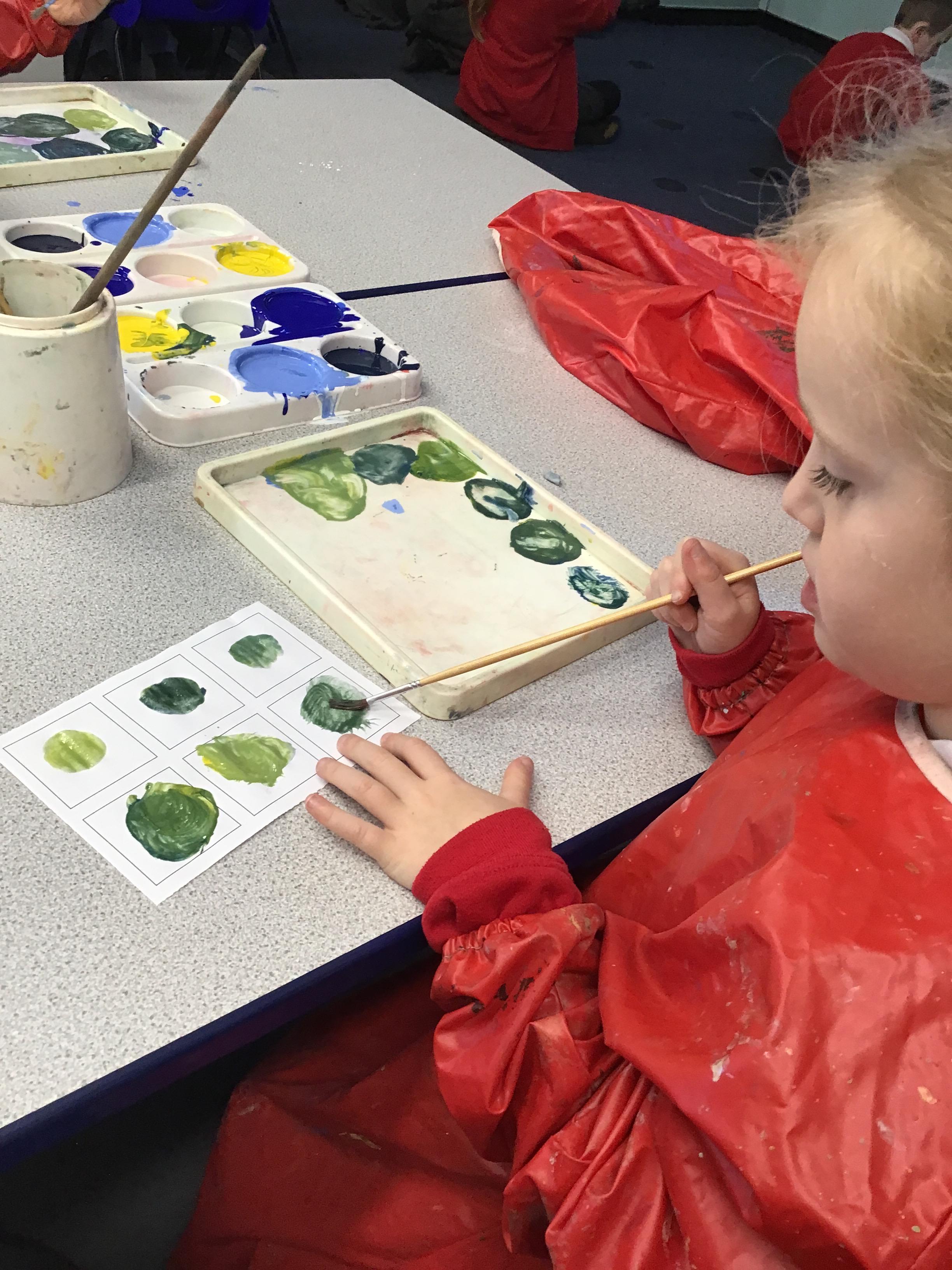 This week we have learnt how to mix two primary colours to make a secondary colour. We mixed blue and yellow to make green. However. we used different shades and amounts of blue and yellow to create six different shades of green. We then put these onto an outline of our hand, using all of the different shades that we had created.