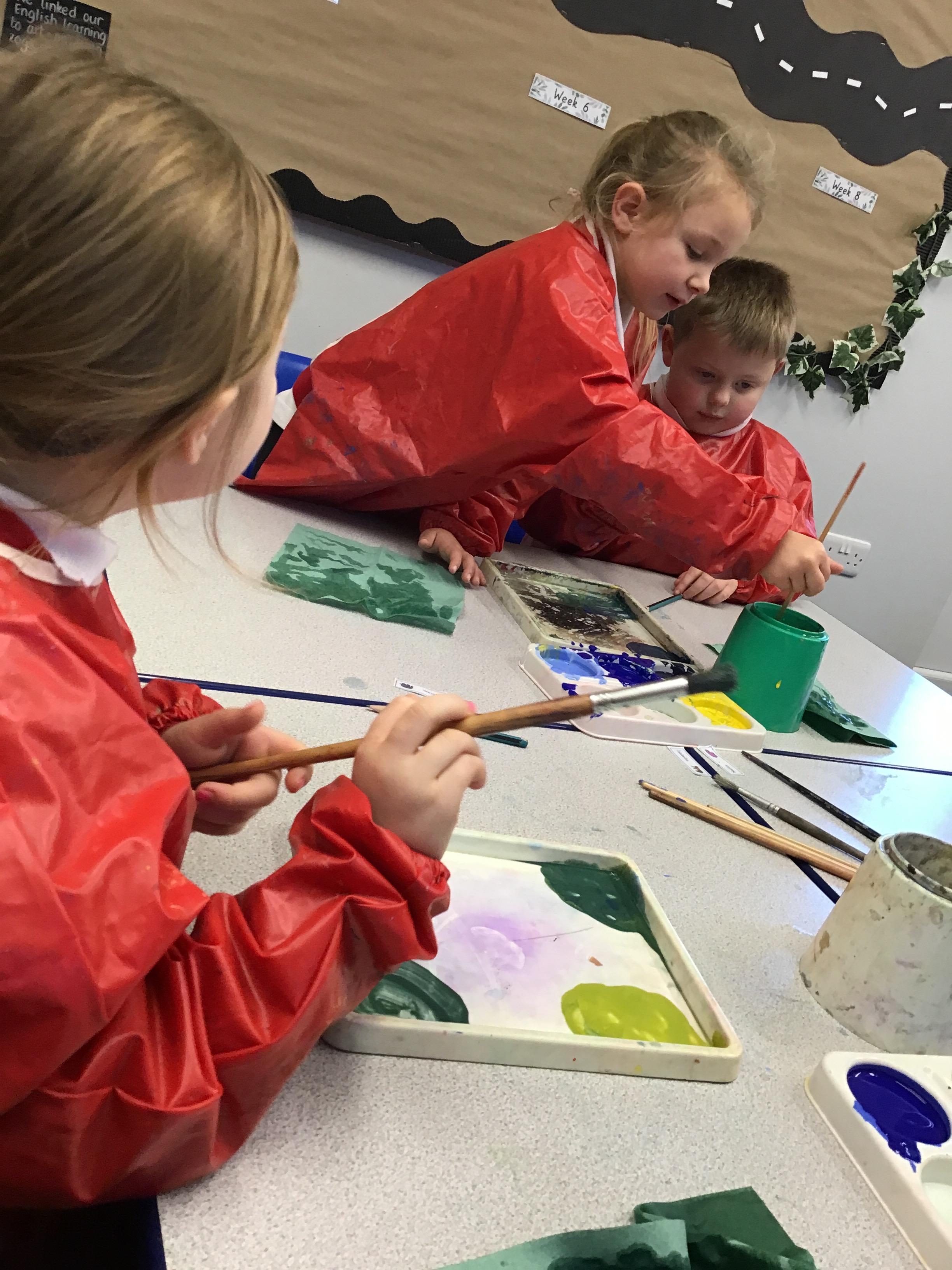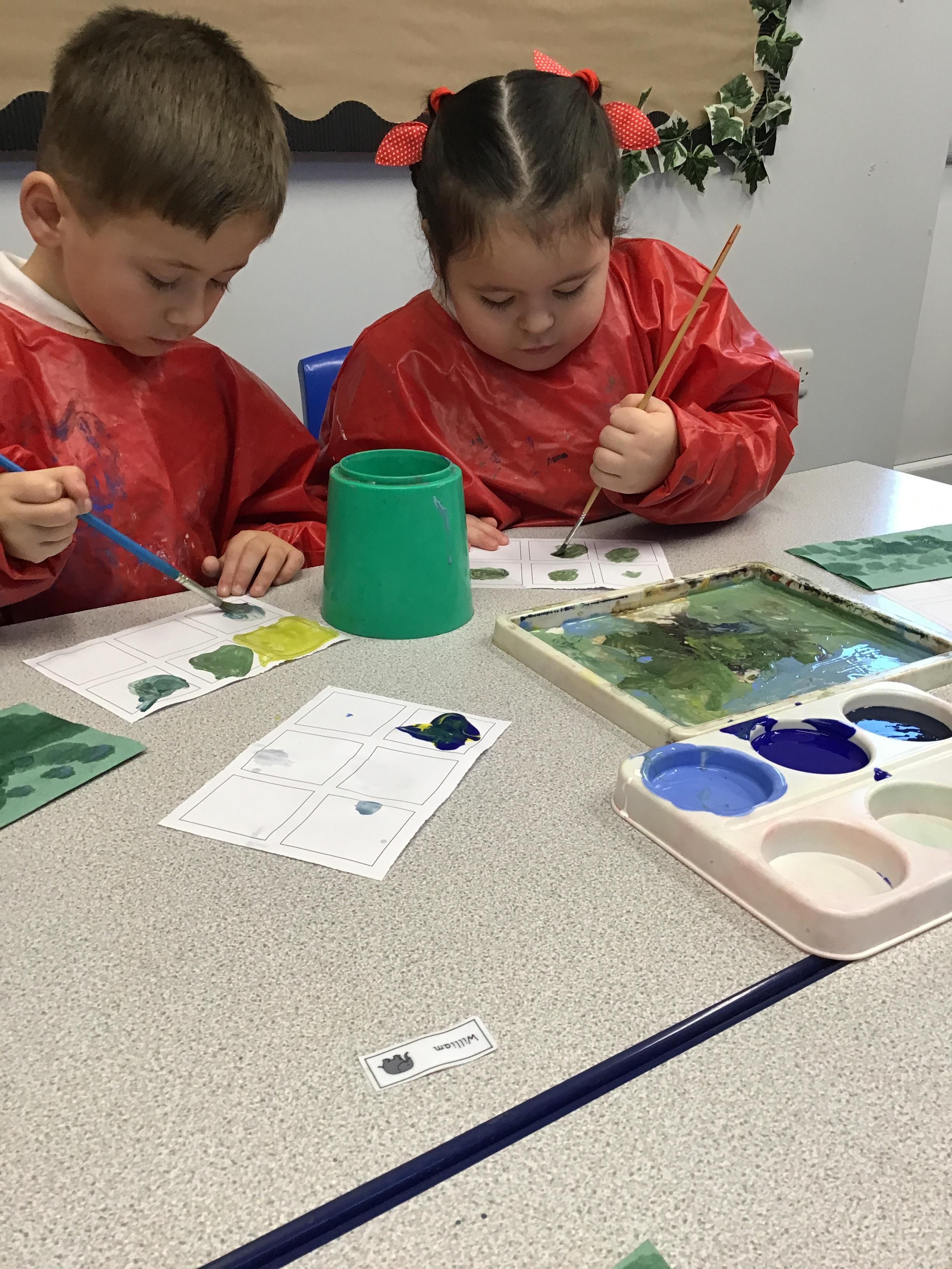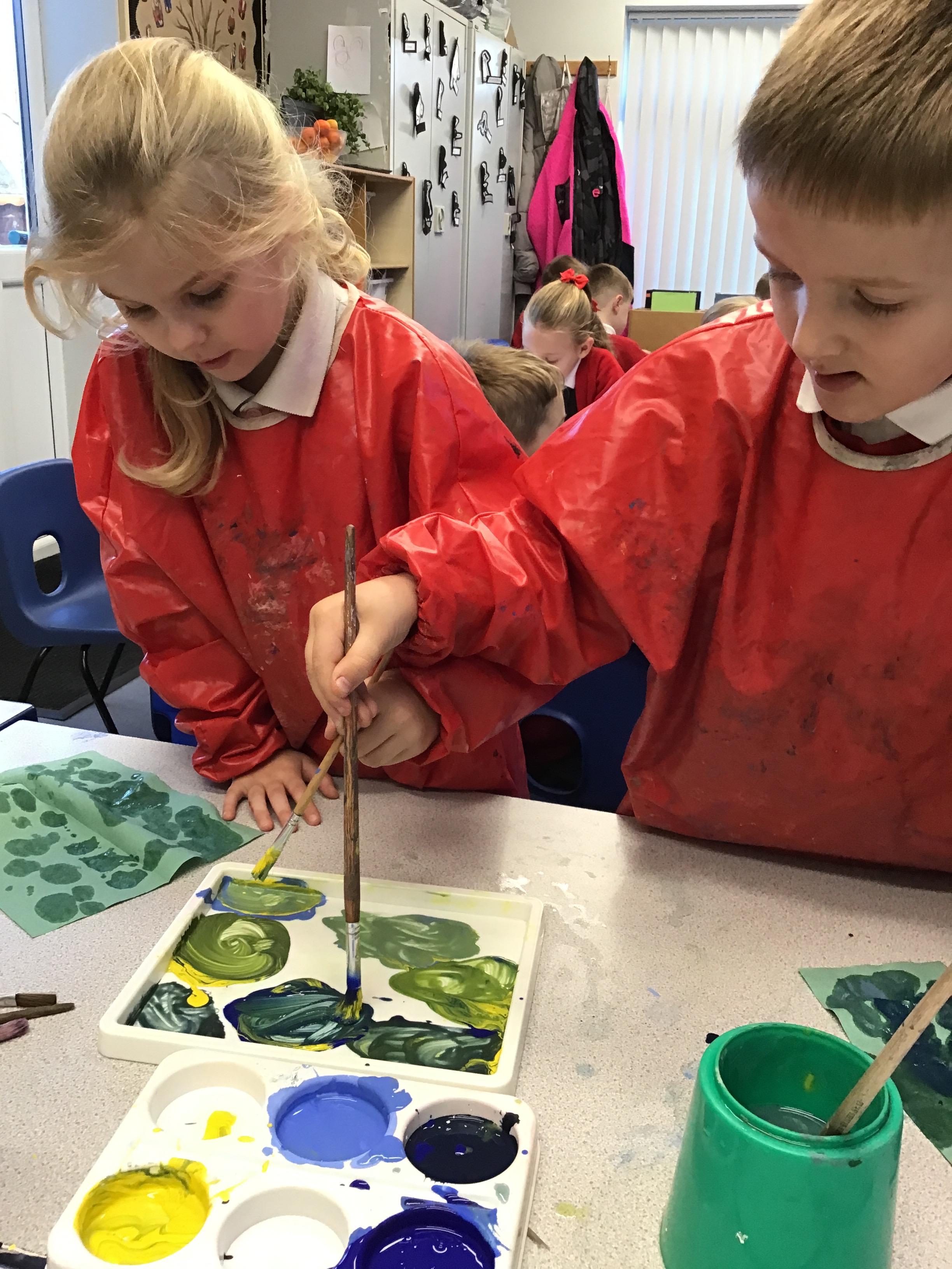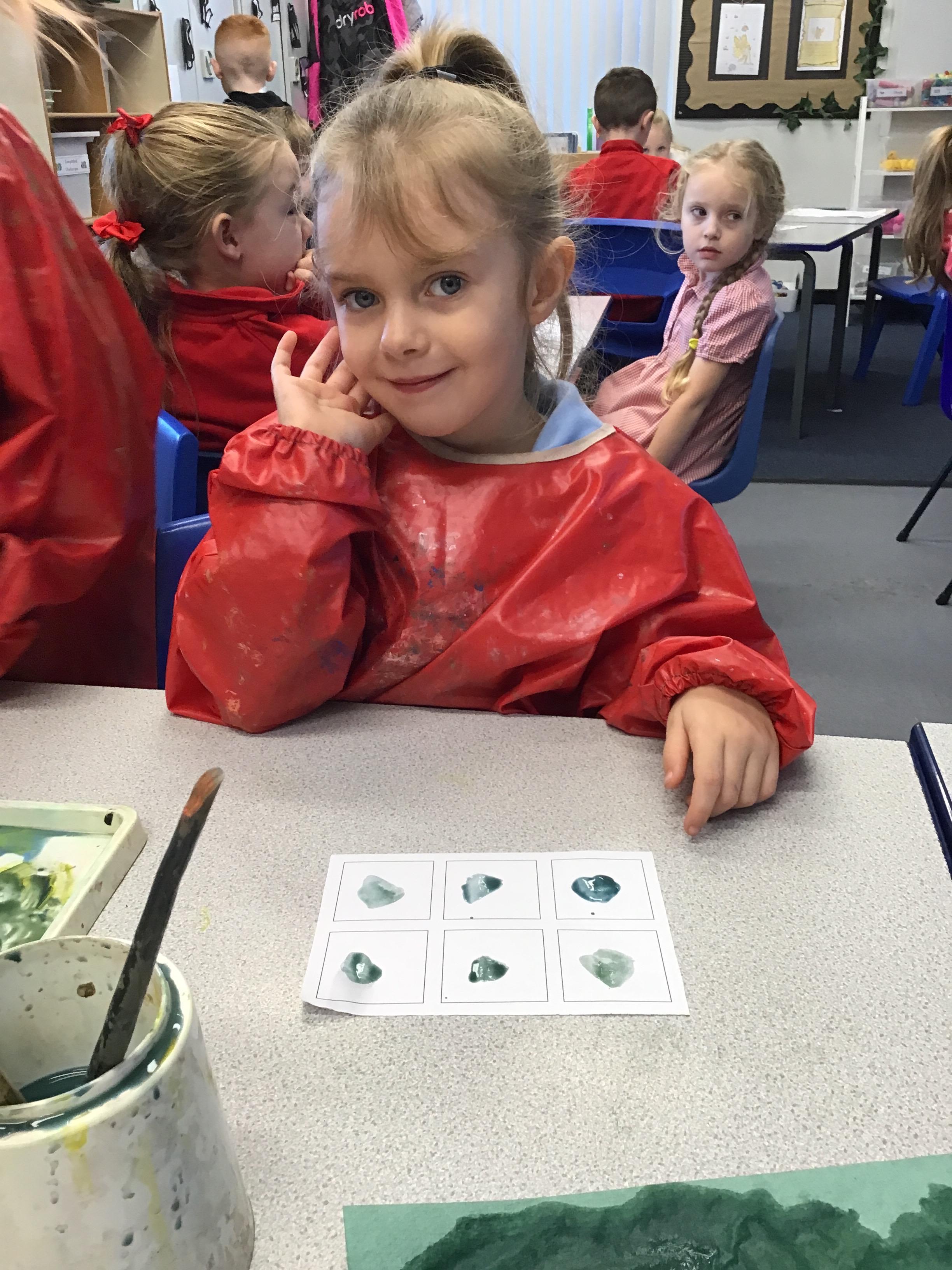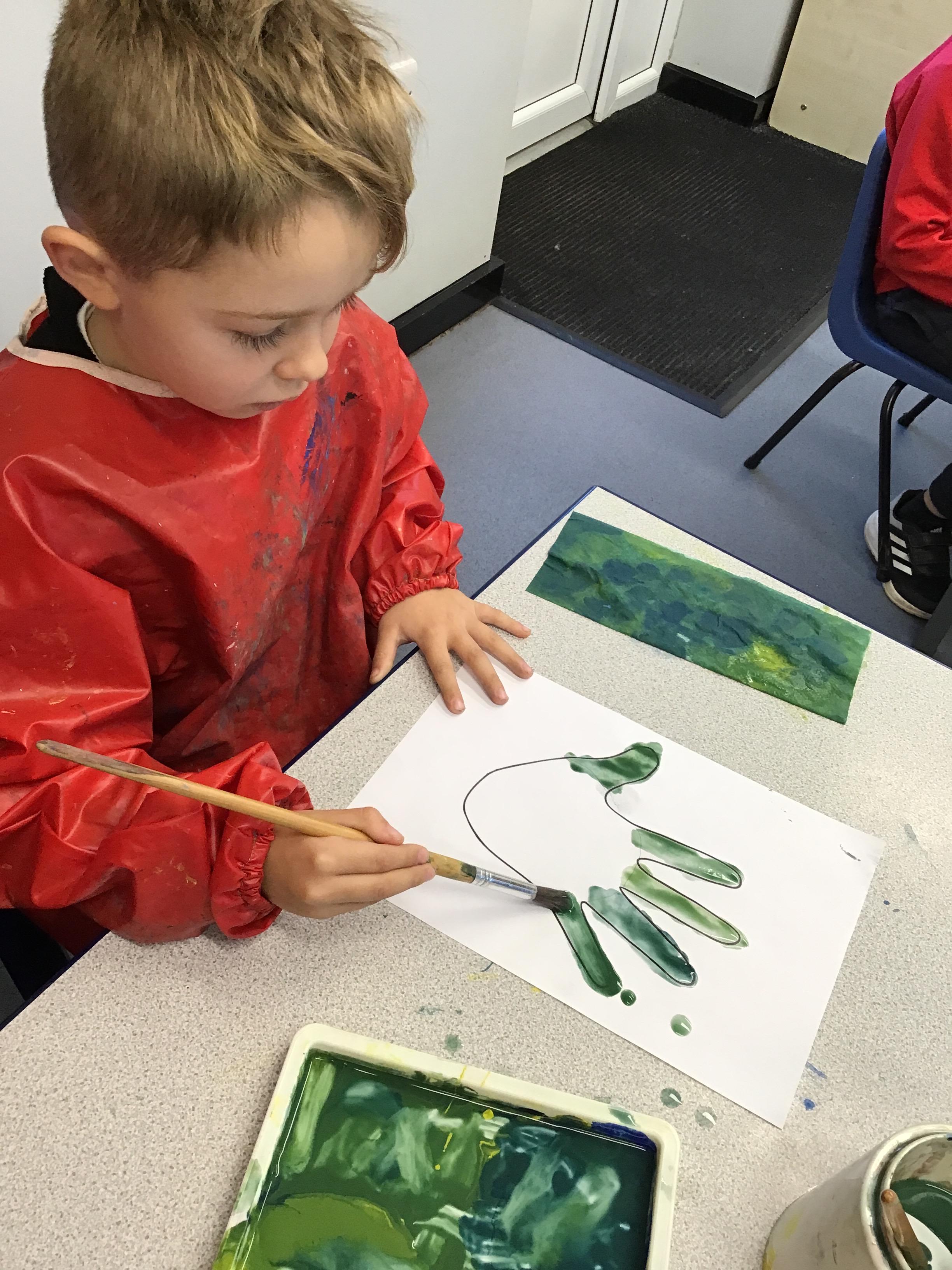 This week we have learnt how to mix two primary colours to make a secondary colour. We mixed blue and yellow to make green. However. we used different shades and amounts of blue and yellow to create six different shades of green. We then put these onto an outline of our hand, using all of the different shades that we had created.