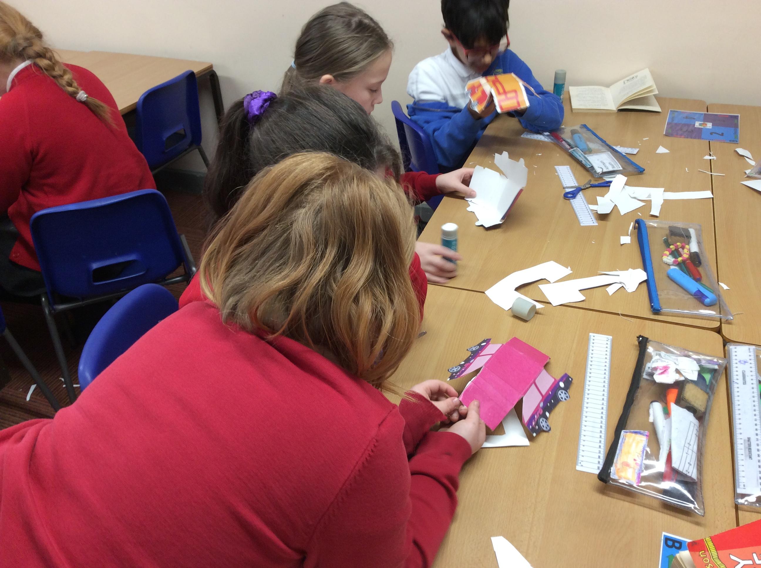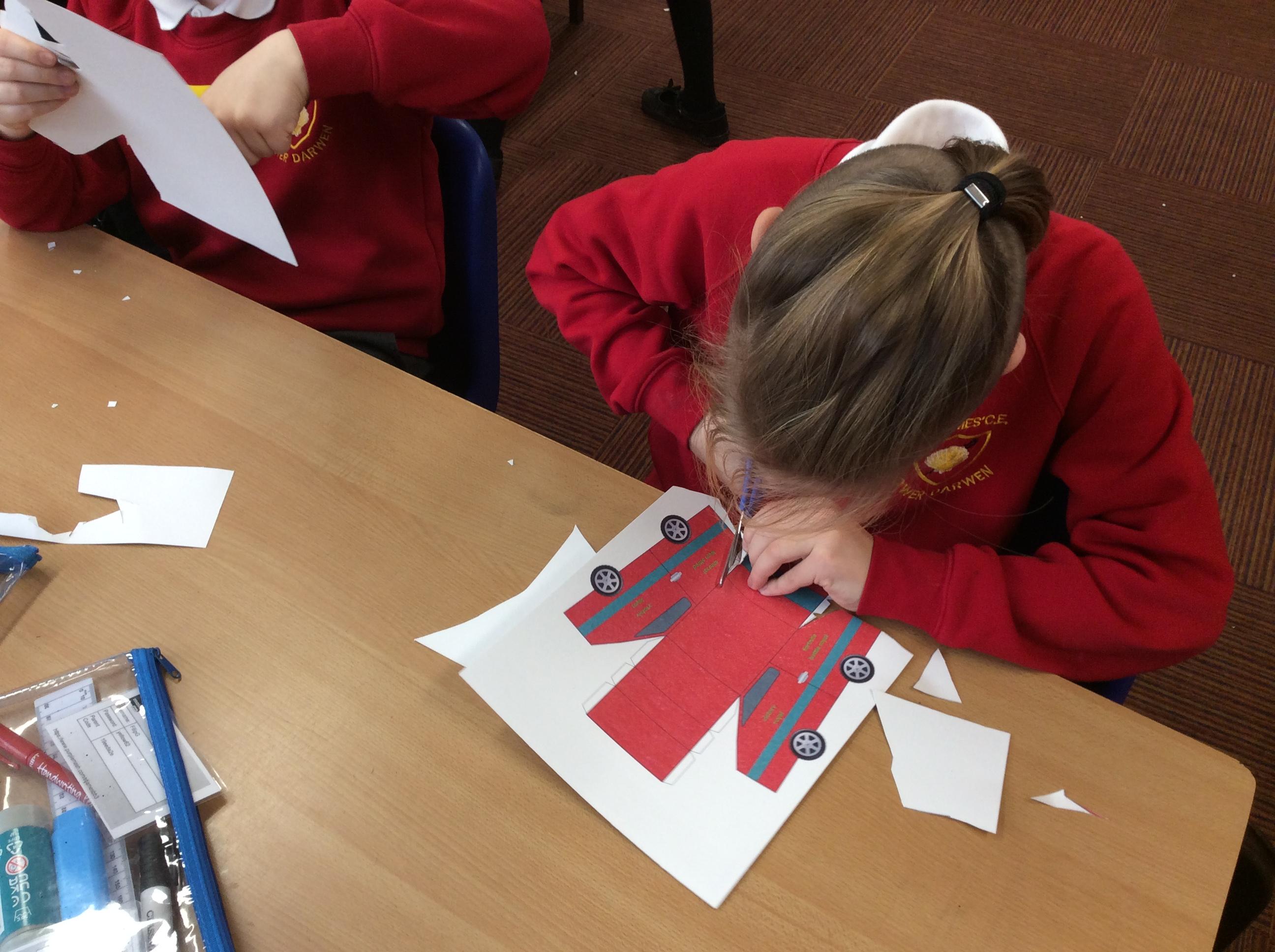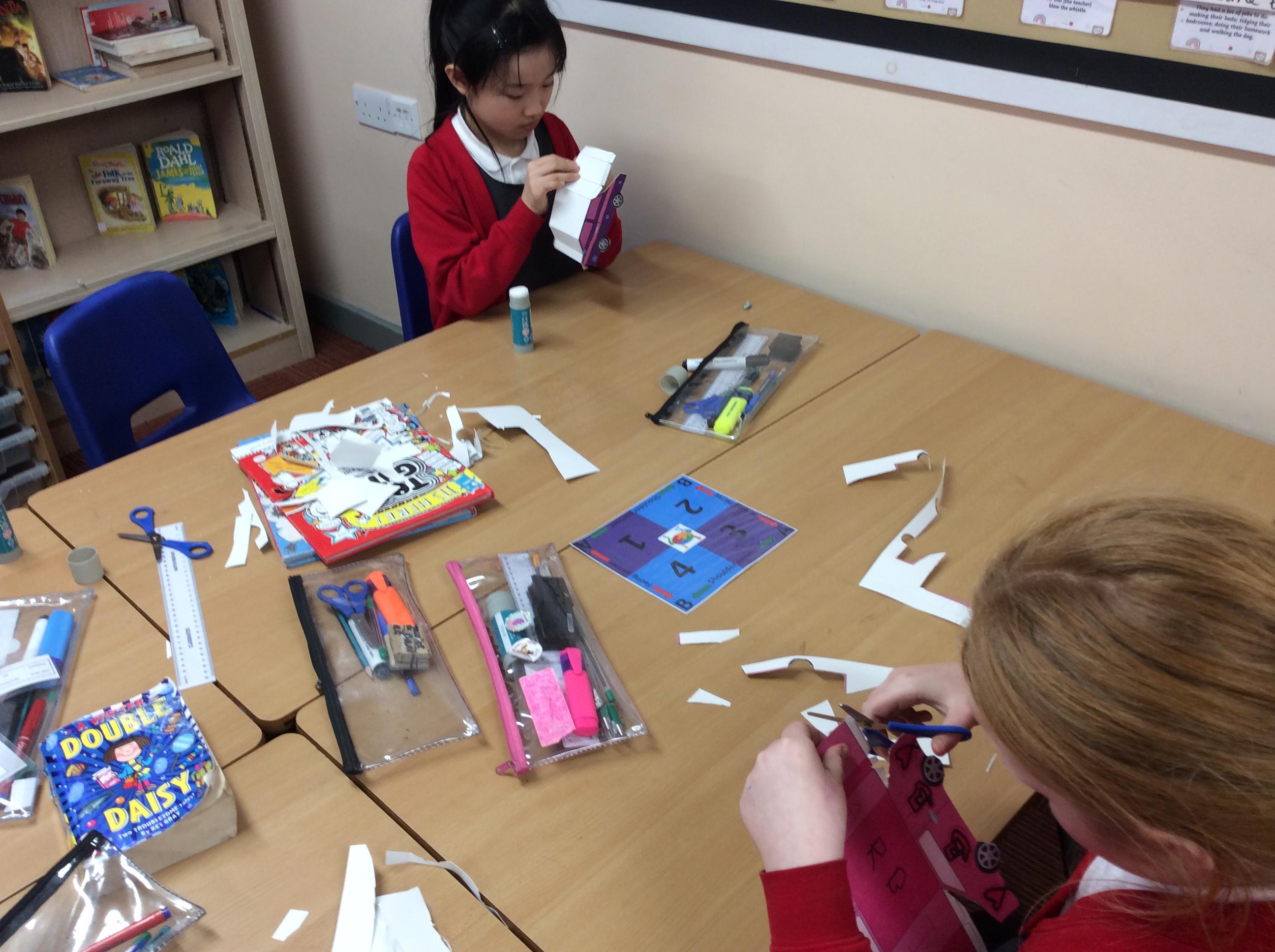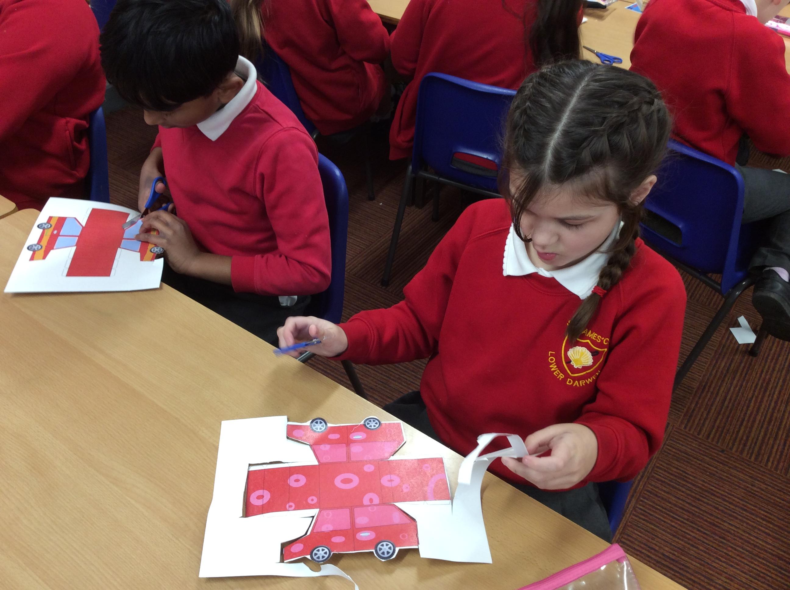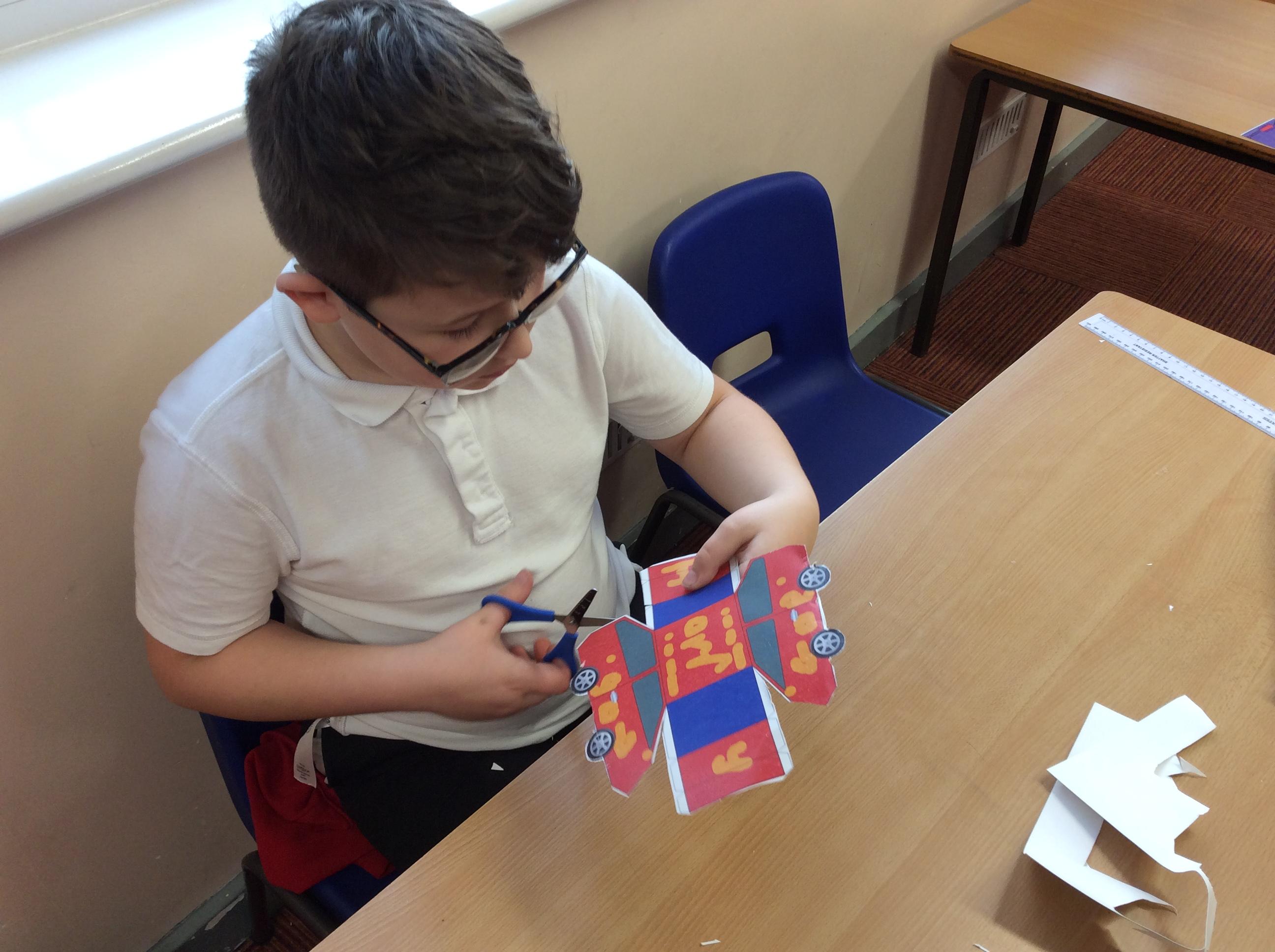 In our DT topic we have designed a car using a net grid, we then used card to build our cars. It was tricky to score the card and fold in all the right places but we used great perseverance and team work. The cars looked fantastic in the end.