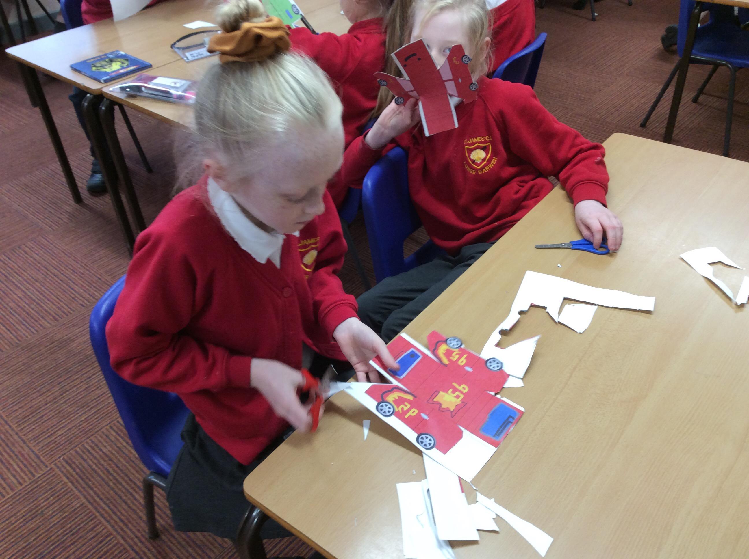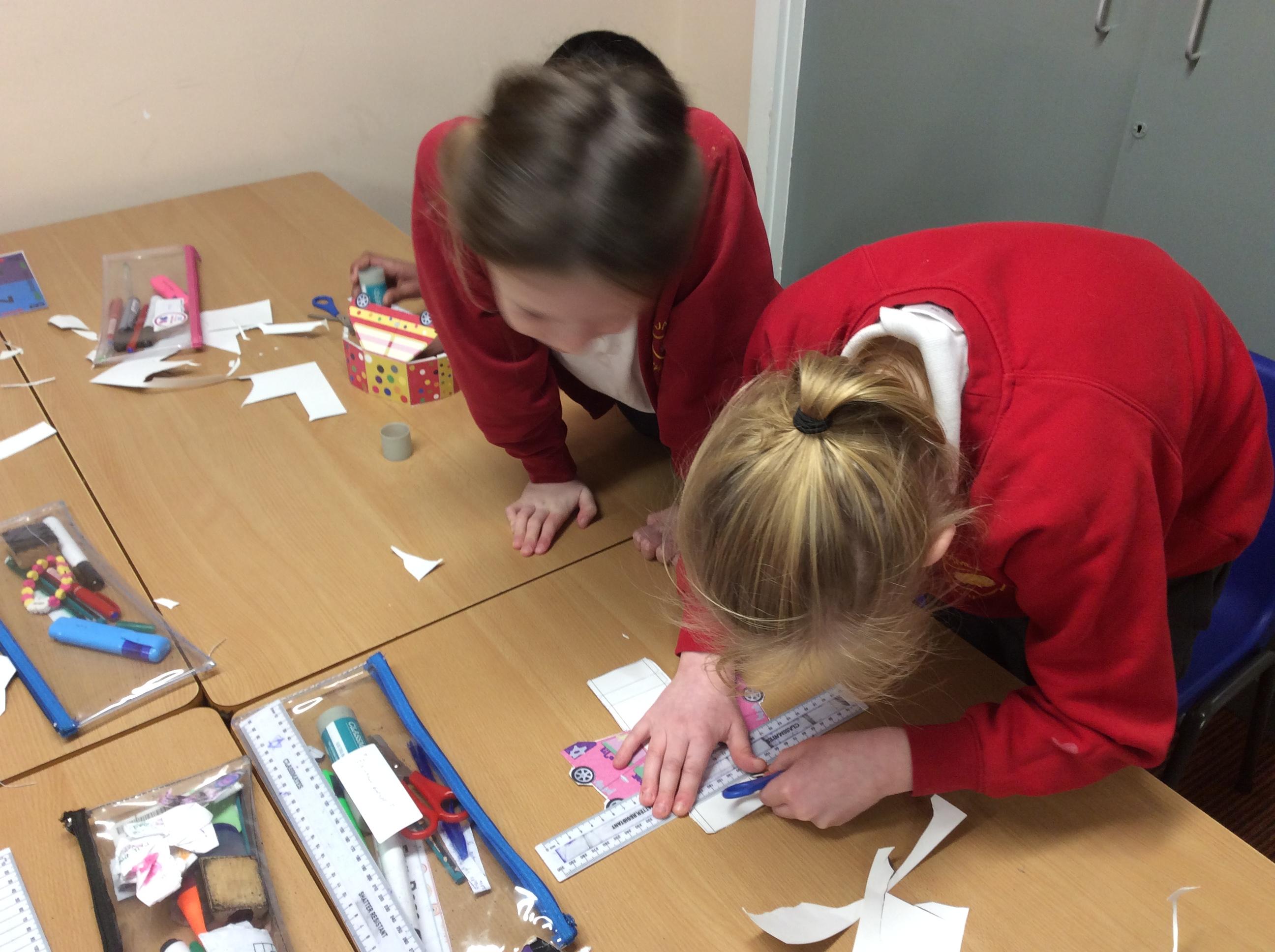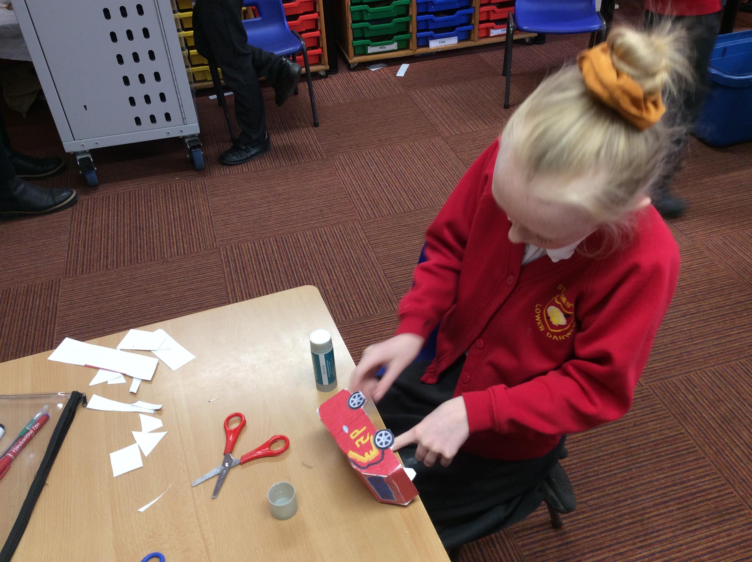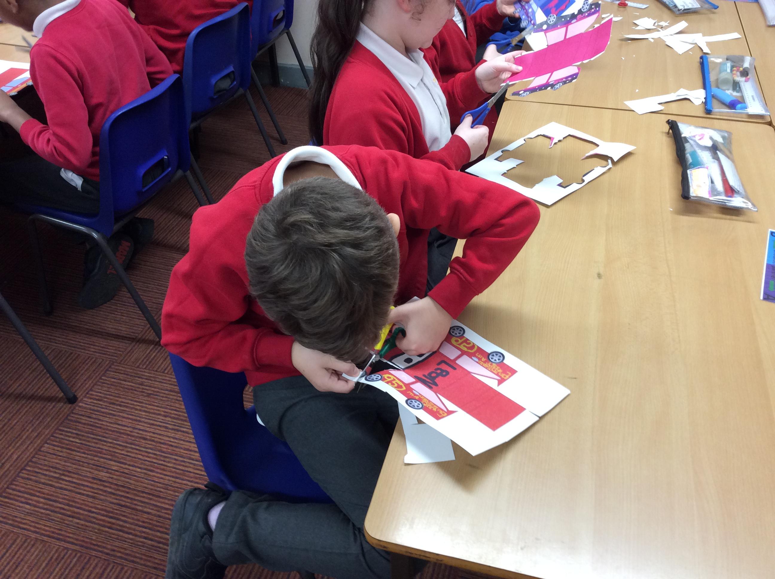 In our DT topic we have designed a car using a net grid, we then used card to build our cars. It was tricky to score the card and fold in all the right places but we used great perseverance and team work. The cars looked fantastic in the end.