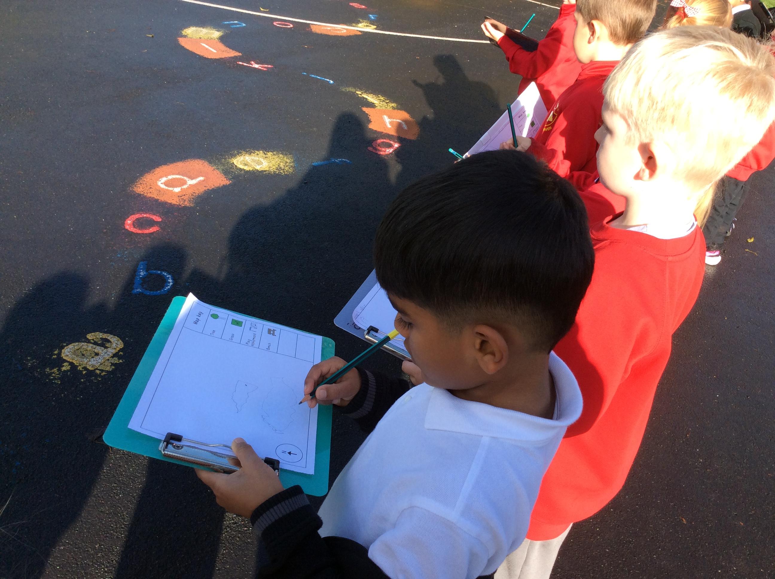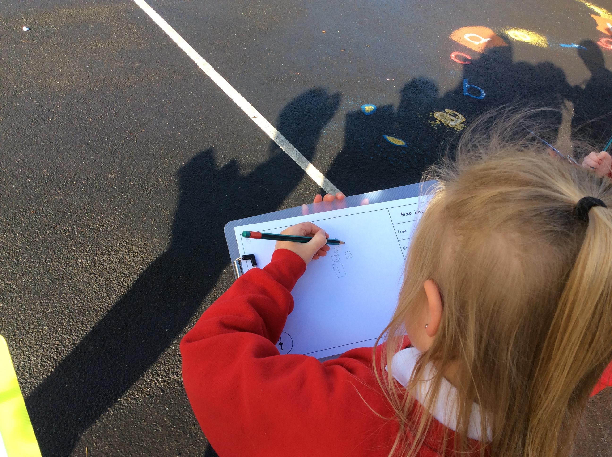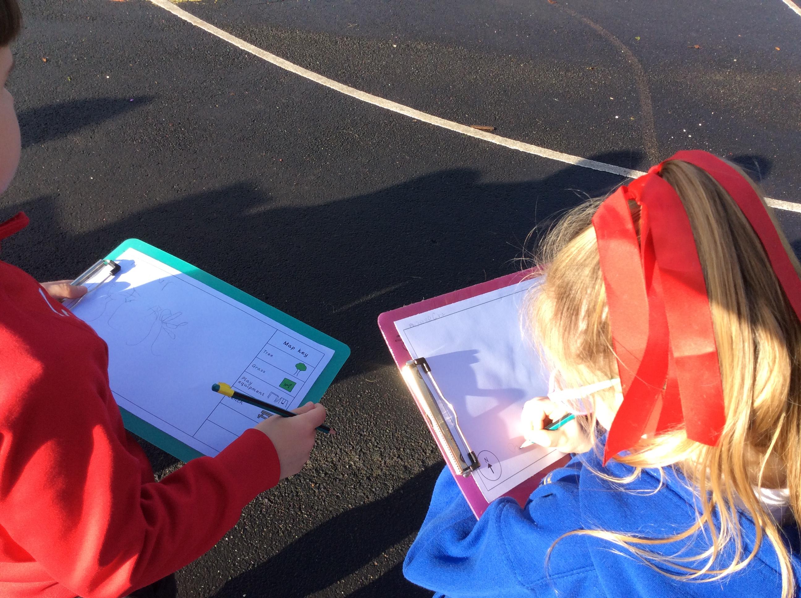 🌍 Geography: We have been learning all about maps. Out on the playground, we drew what we could see and carefully thought about where each thing should go on our own maps. At the end, Miss Bryan stood right in the middle — so of course, we added her to our maps too!