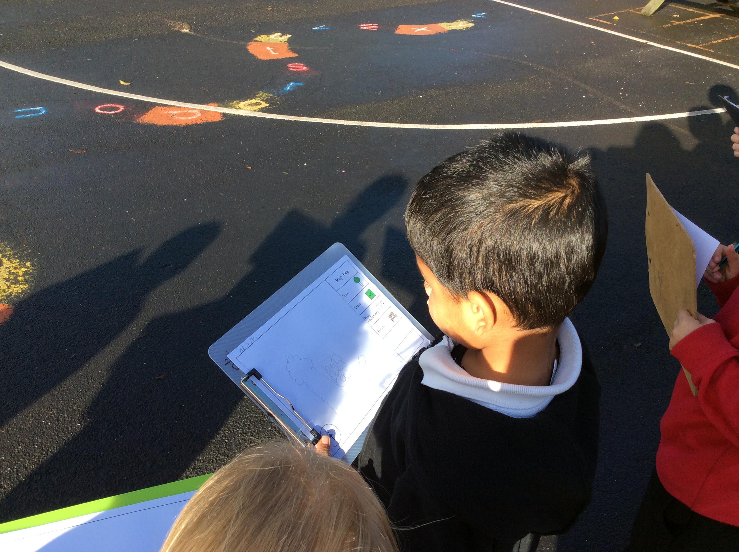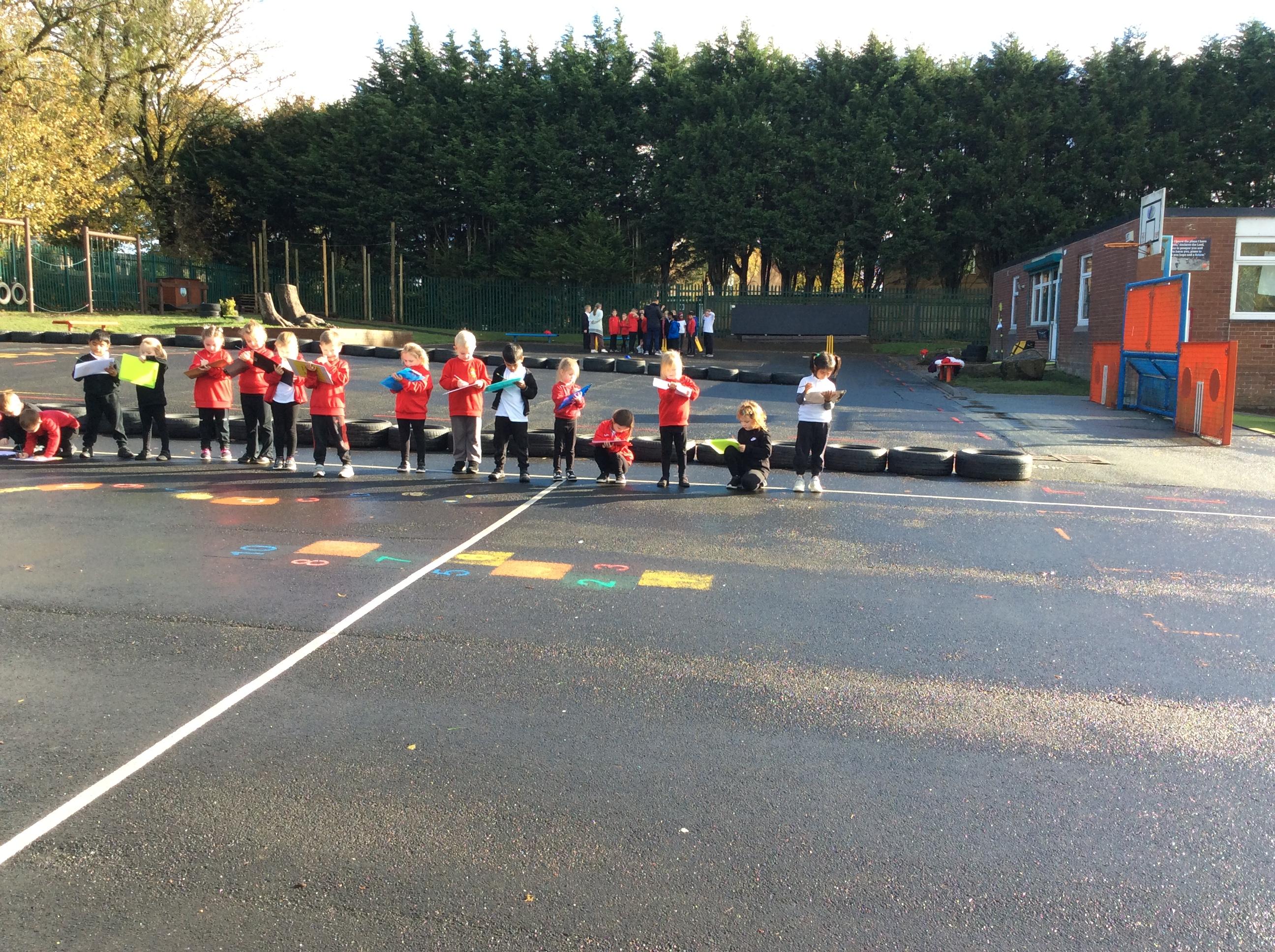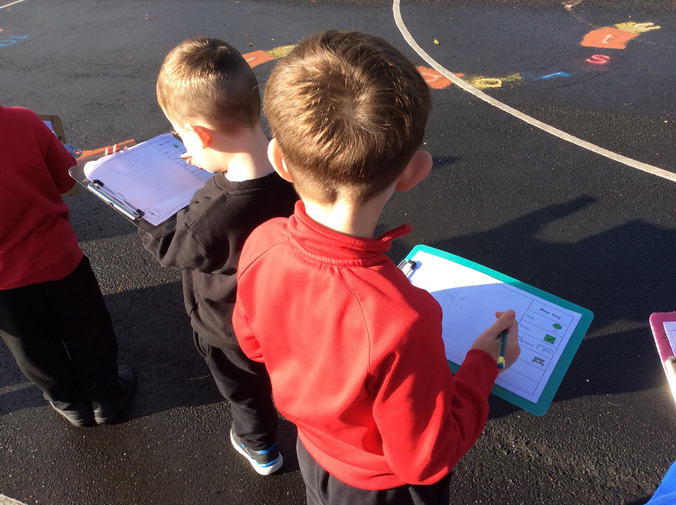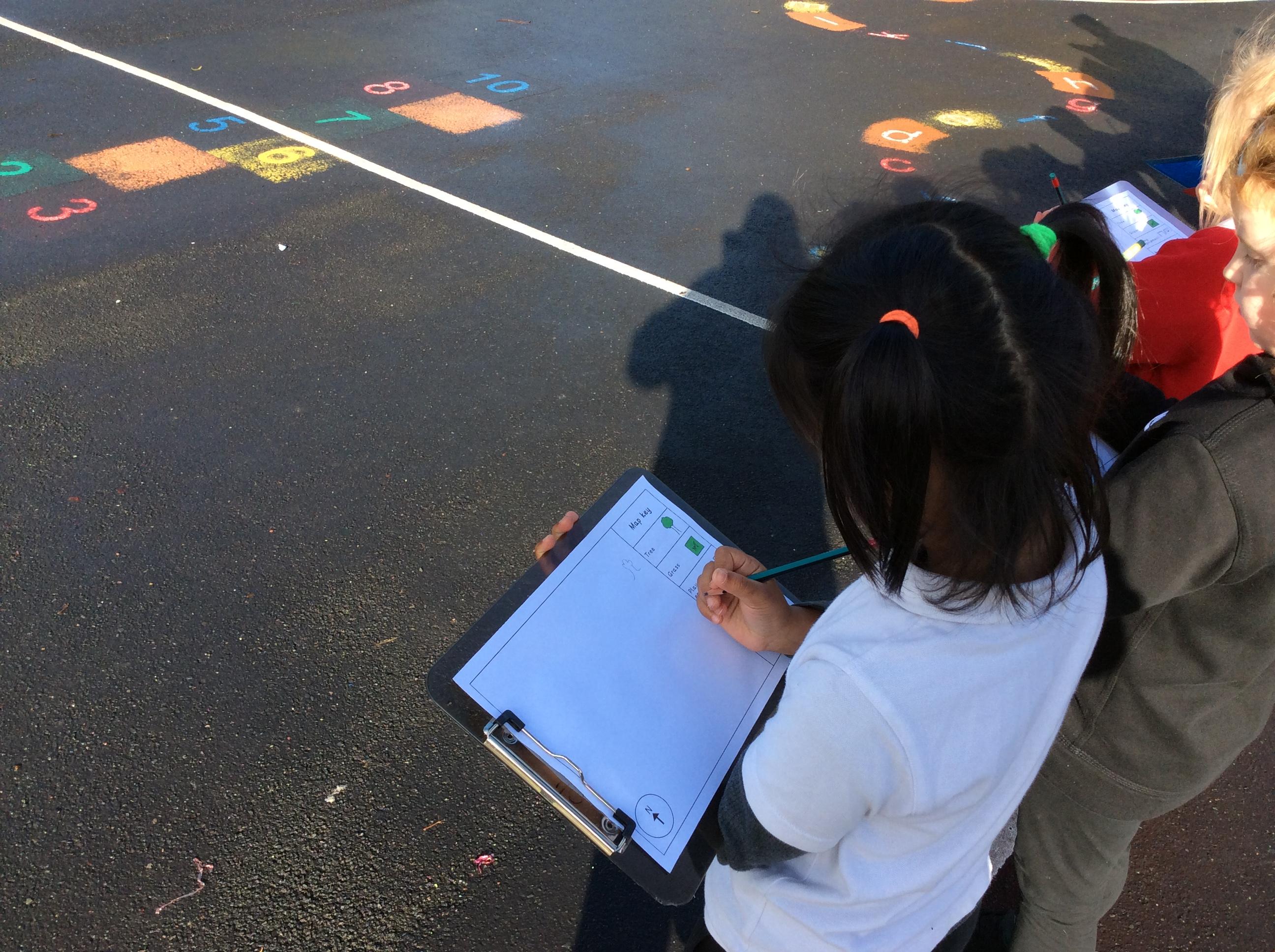 🌍 Geography: We have been learning all about maps. Out on the playground, we drew what we could see and carefully thought about where each thing should go on our own maps. At the end, Miss Bryan stood right in the middle — so of course, we added her to our maps too!
