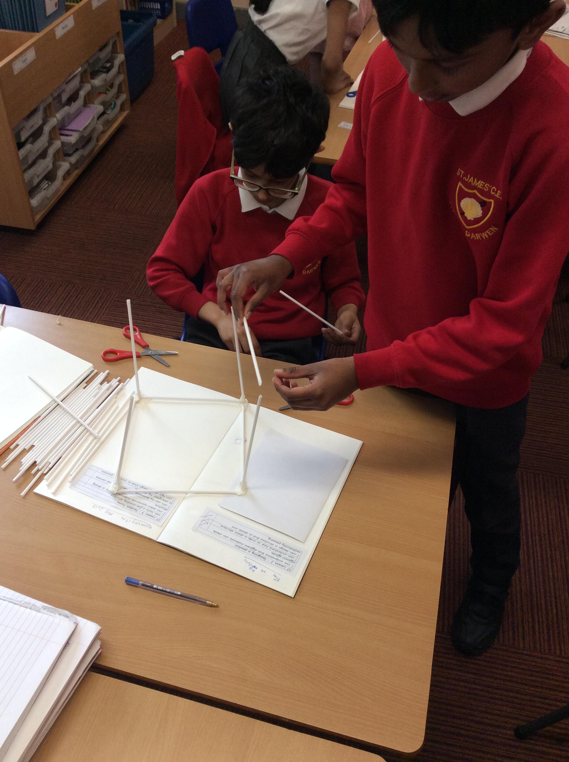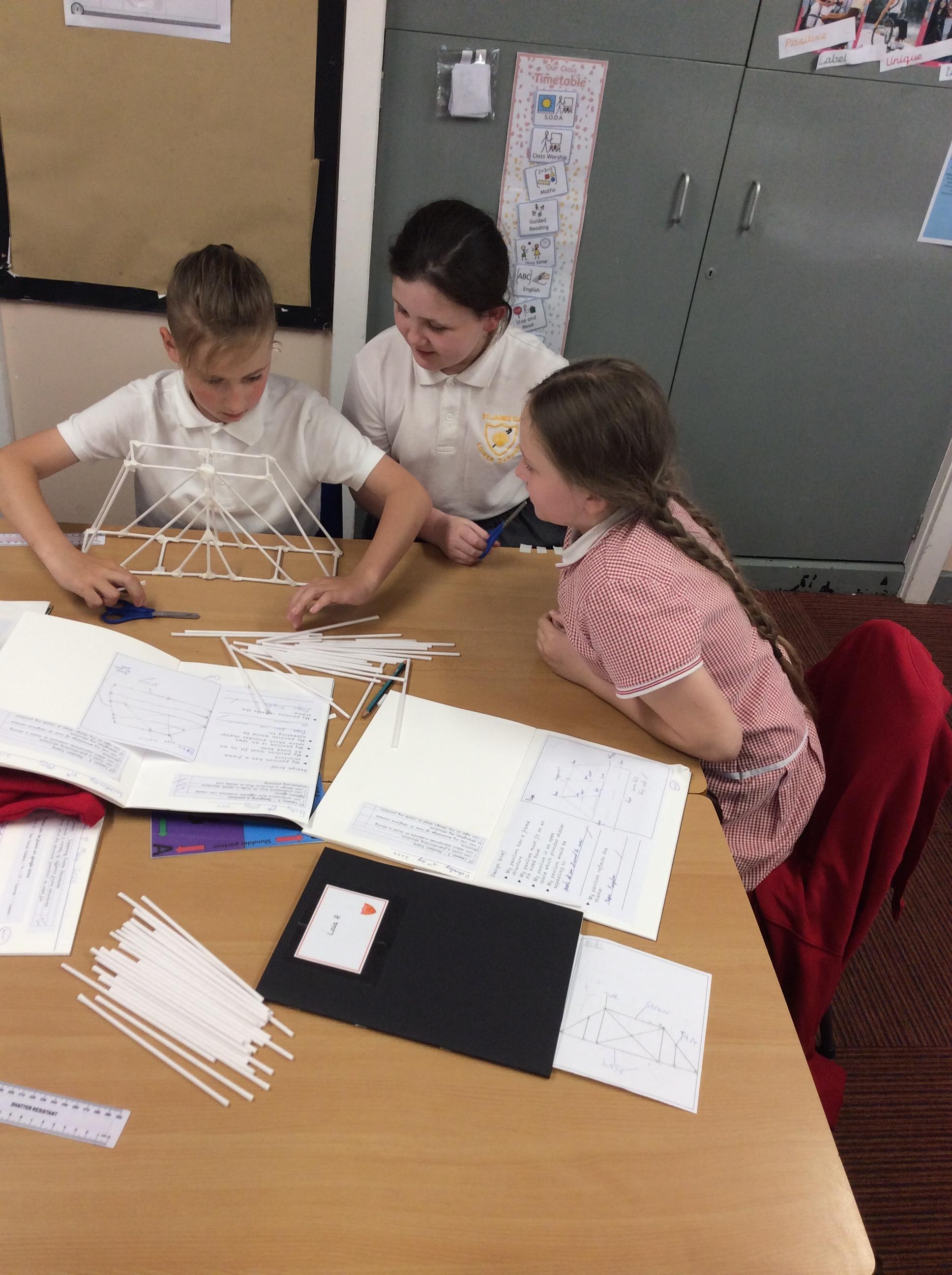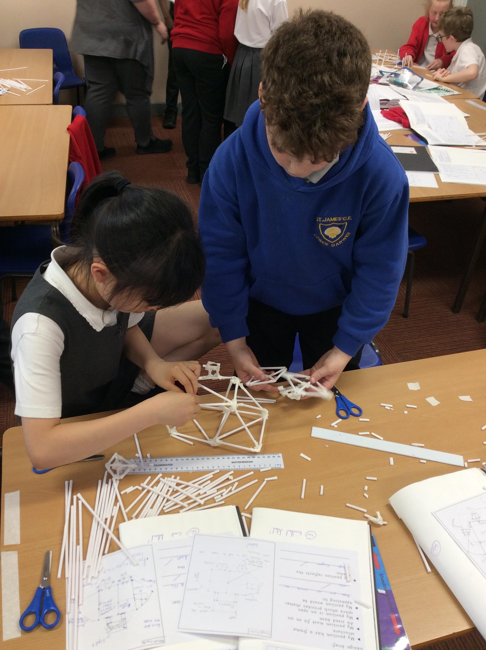 The children were split into groups of 3. Last week they designed a pavilion. This week was construction week. Each group were given 50 paper straws, and a length of masking tape. The groups then had to work from their plans to construct their pavilion as close as possible to their plan. The groups were amazing and worked so well together.