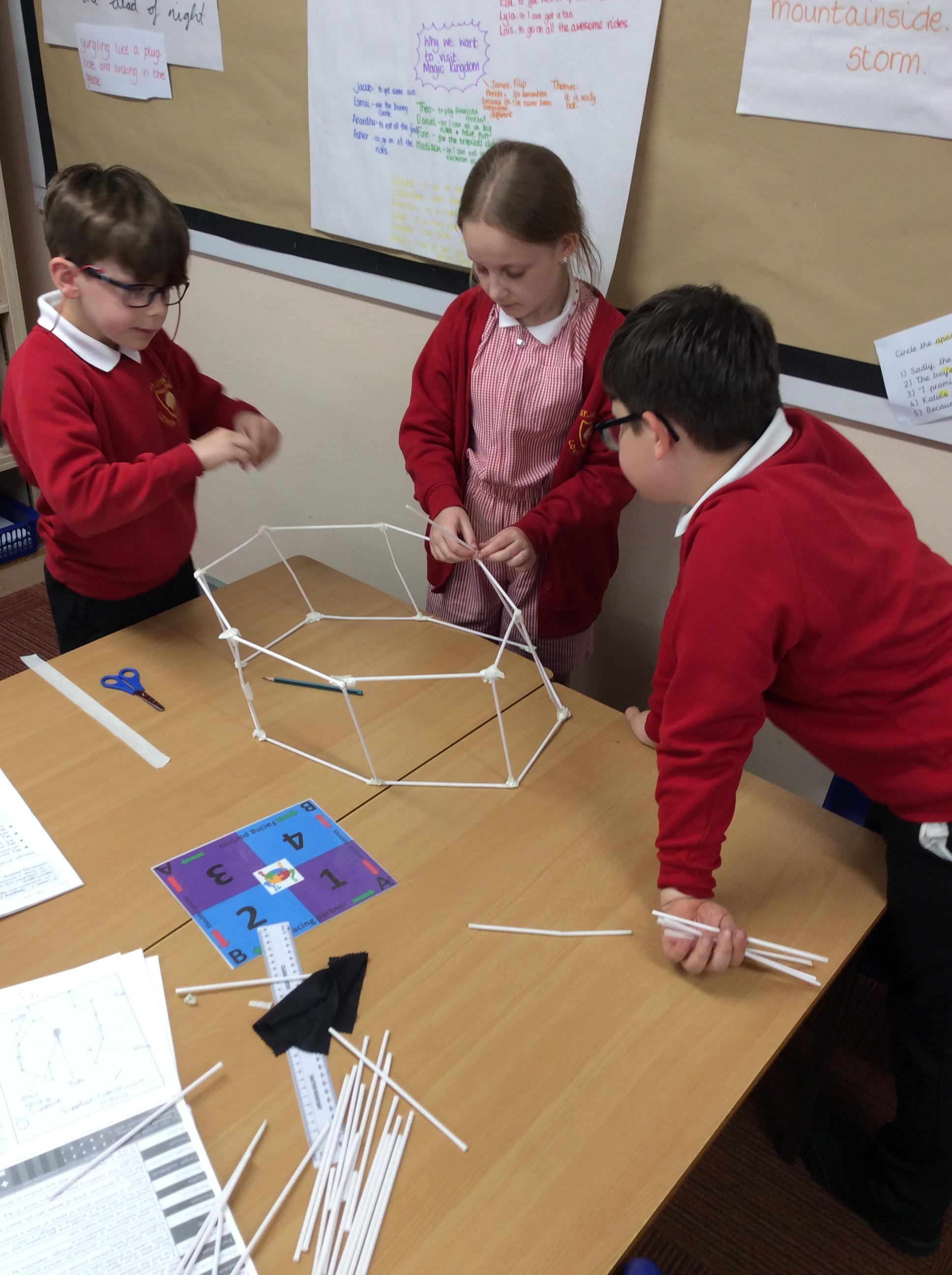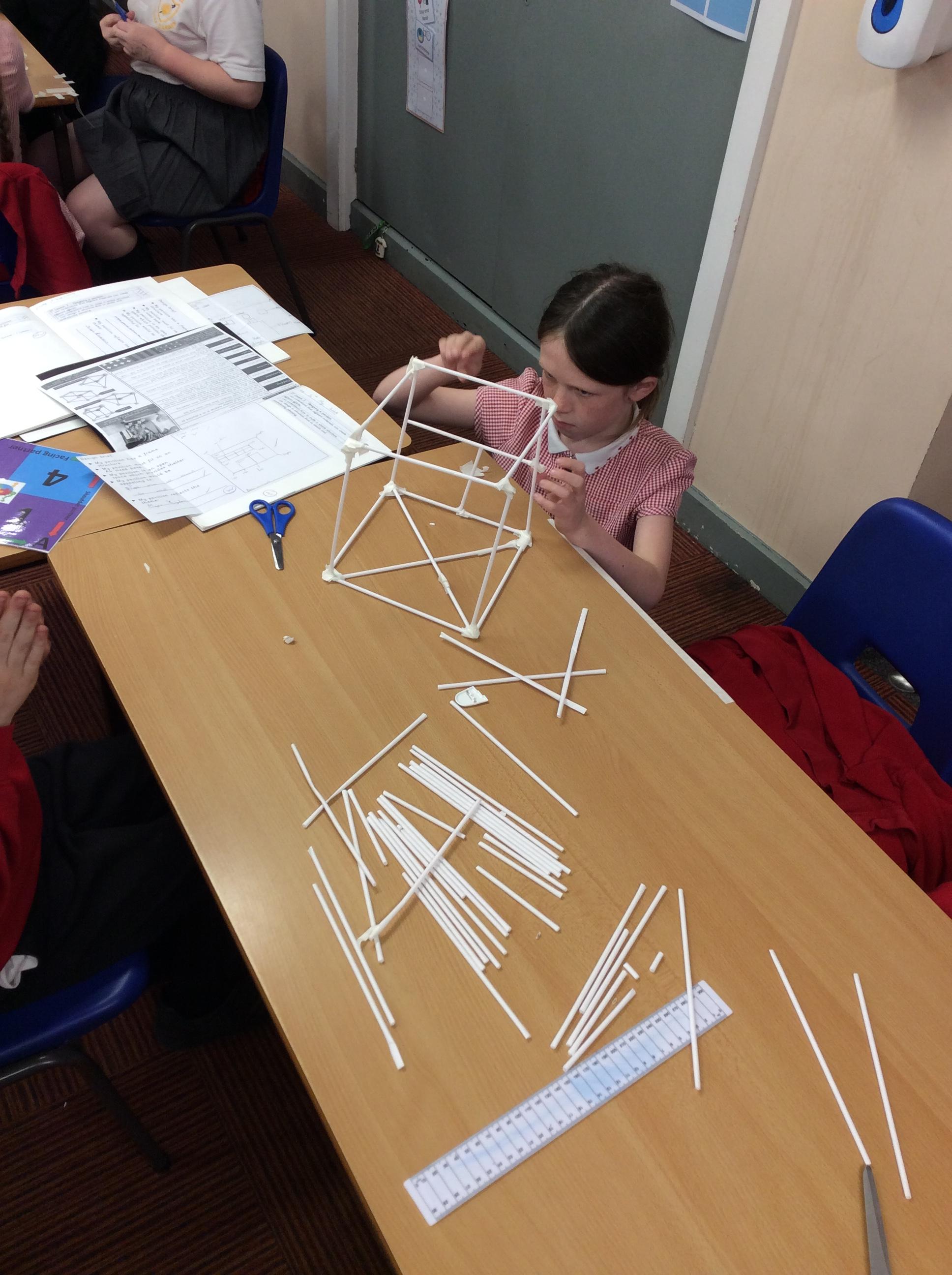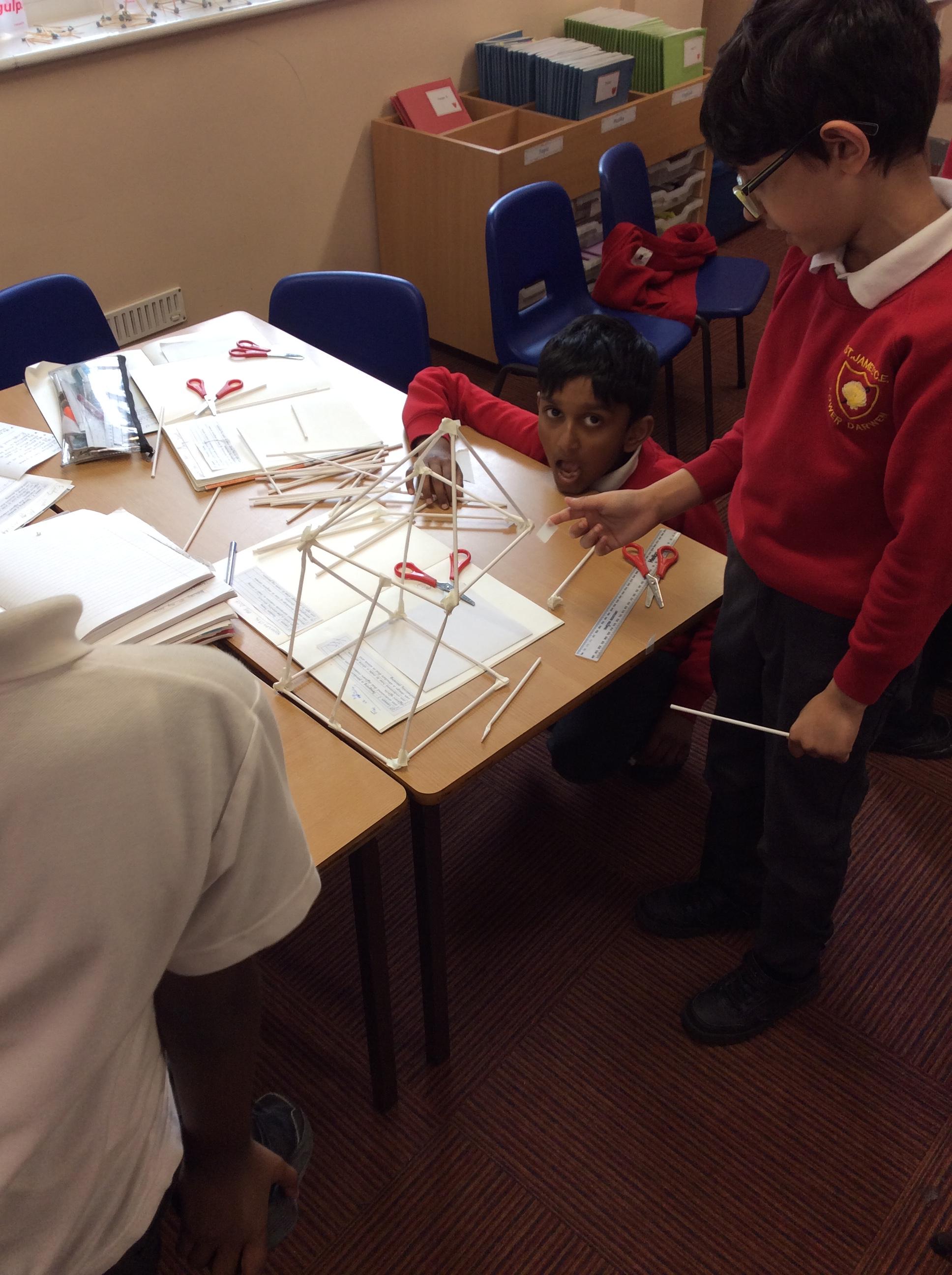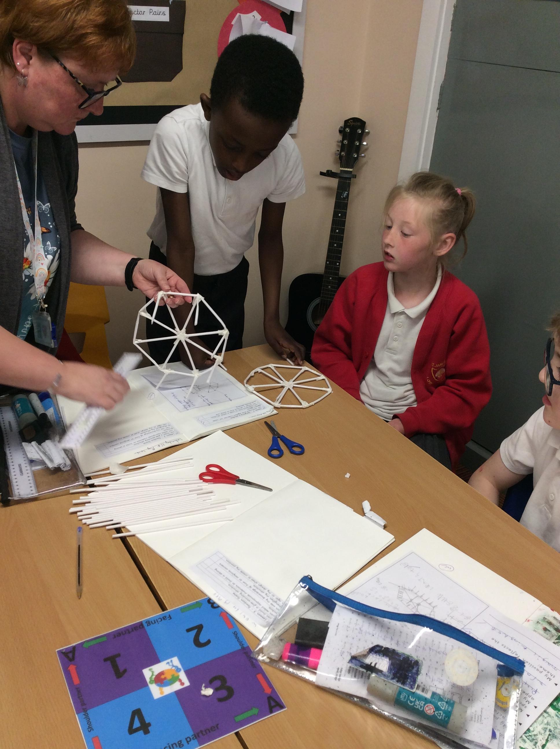 The children were split into groups of 3. Last week they designed a pavilion. This week was construction week. Each group were given 50 paper straws, and a length of masking tape. The groups then had to work from their plans to construct their pavilion as close as possible to their plan. The groups were amazing and worked so well together.