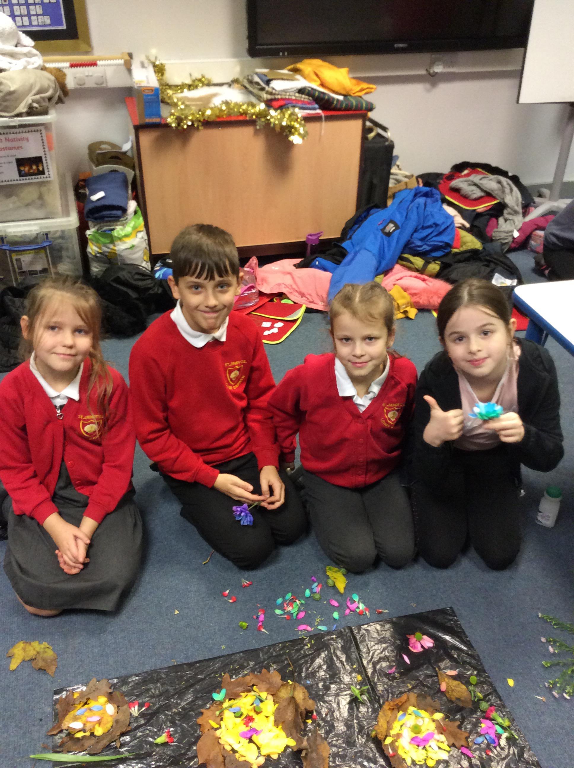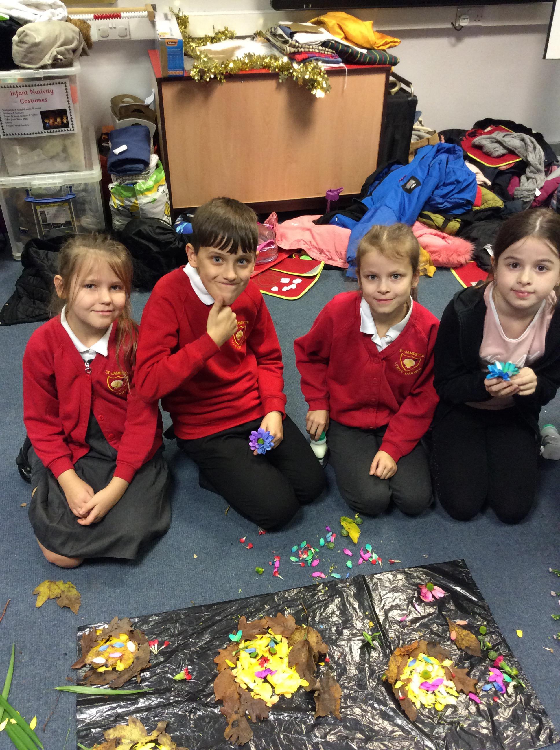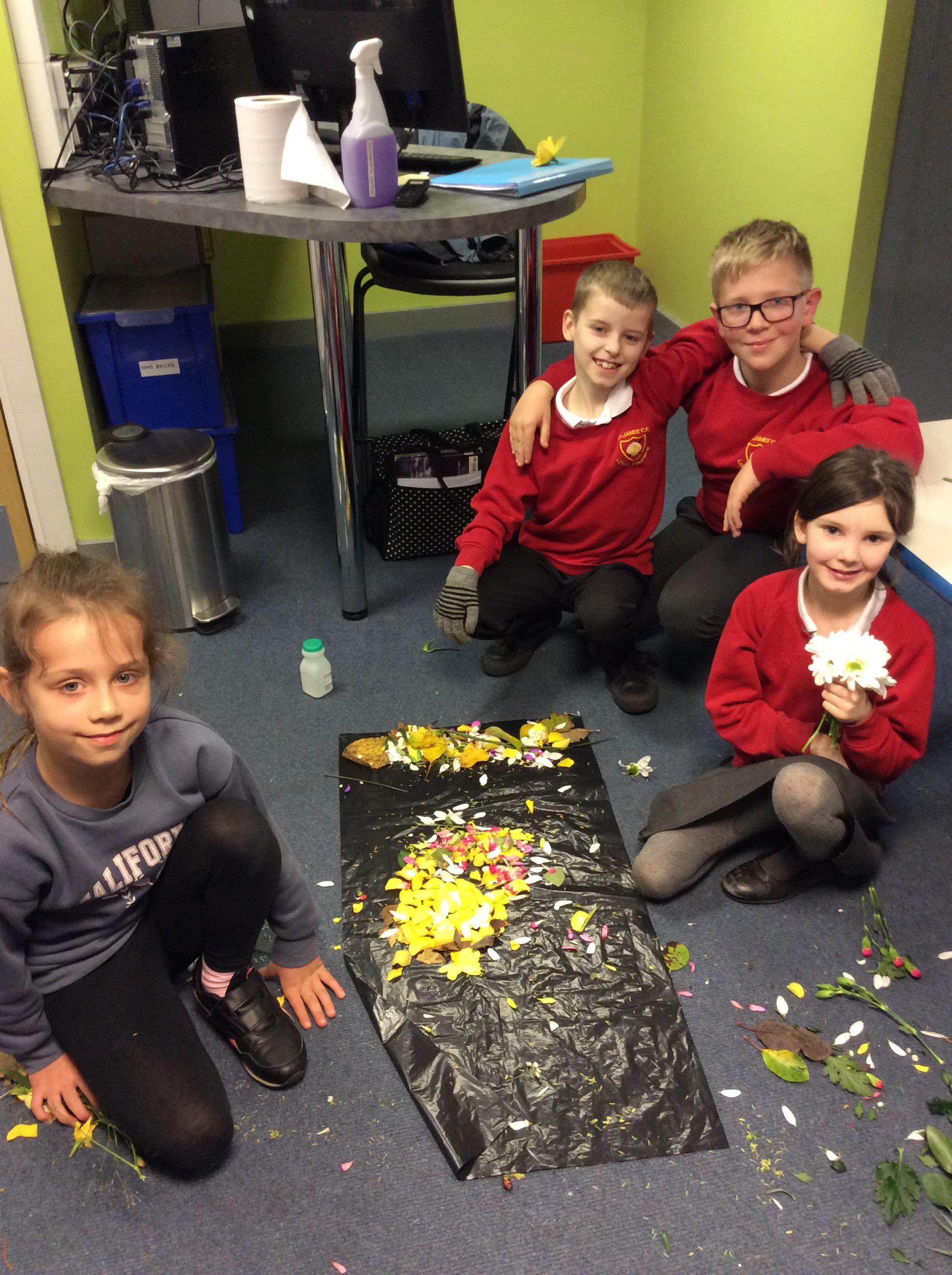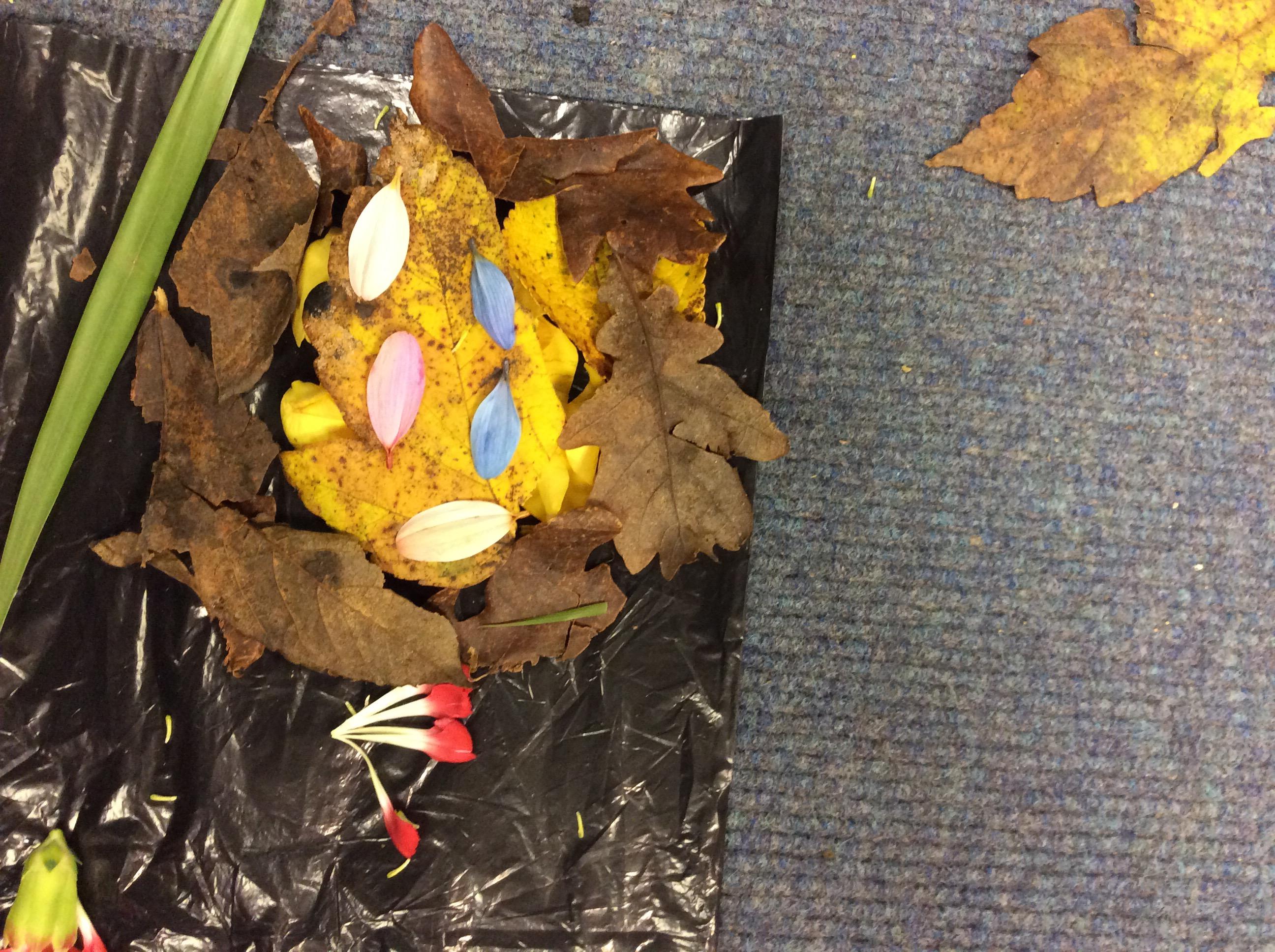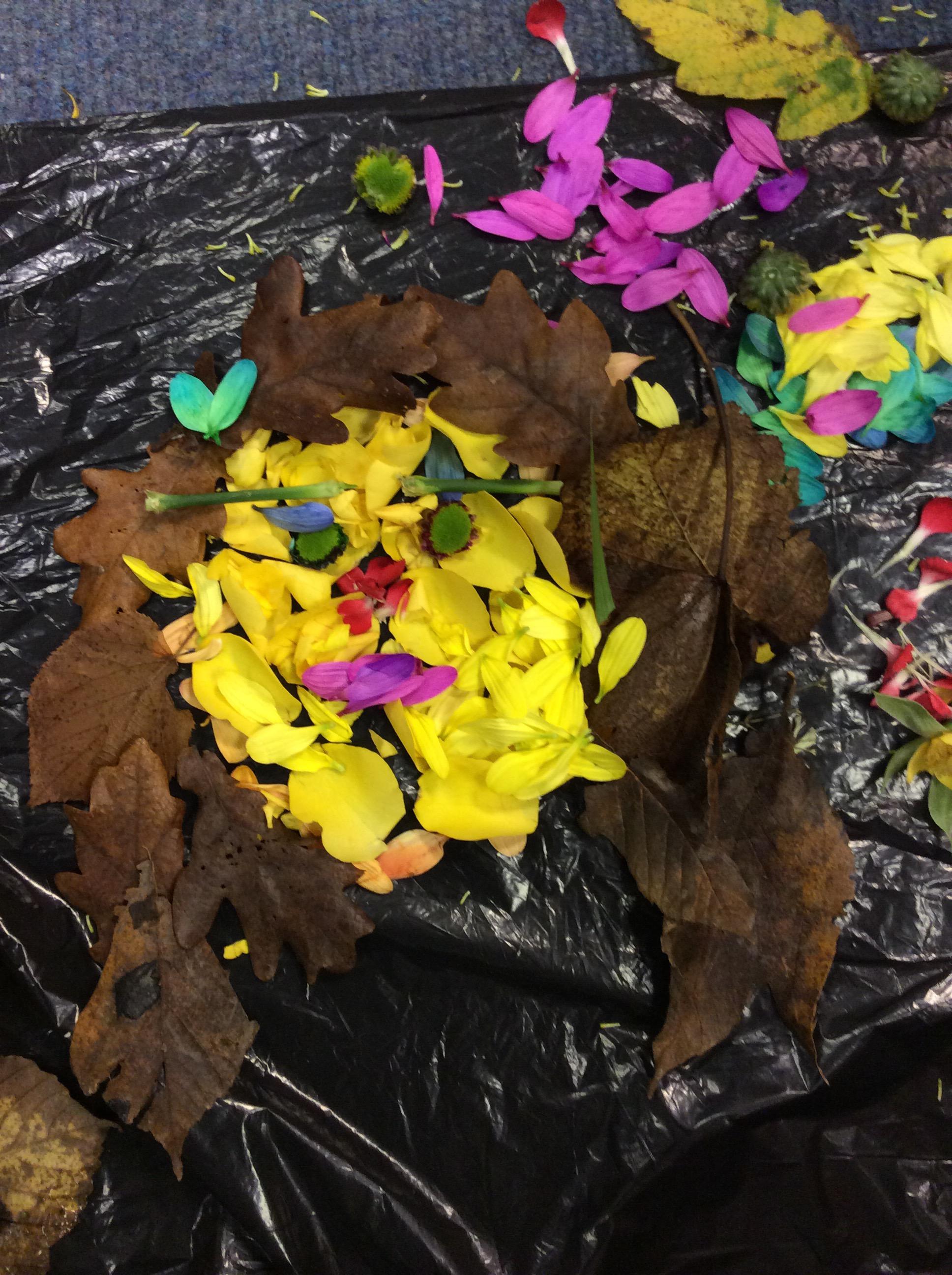 This week we studied how to make a portrait of a person with flowers, petals and greenery. The children had loads of fun shredding a bunch of flowers.